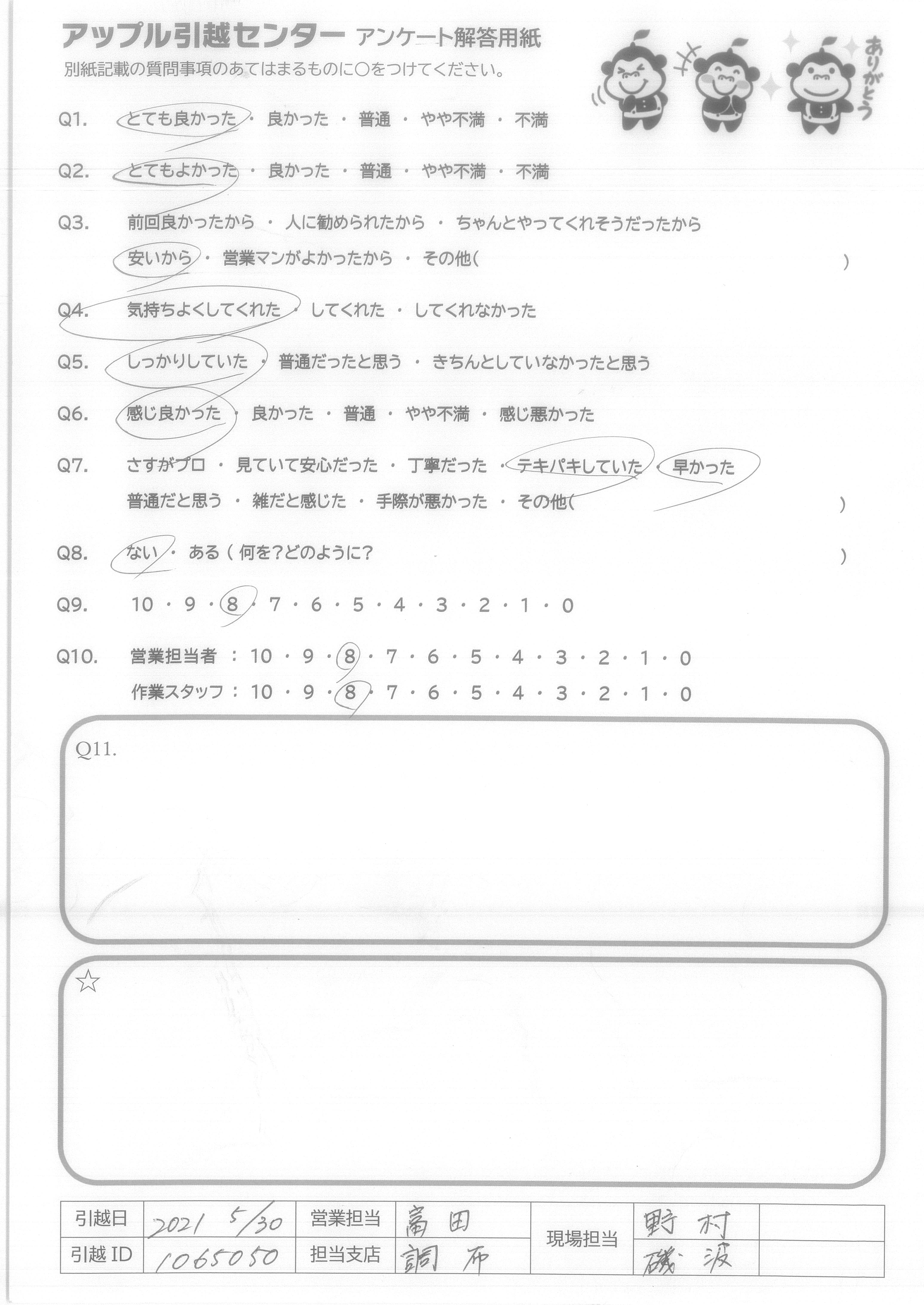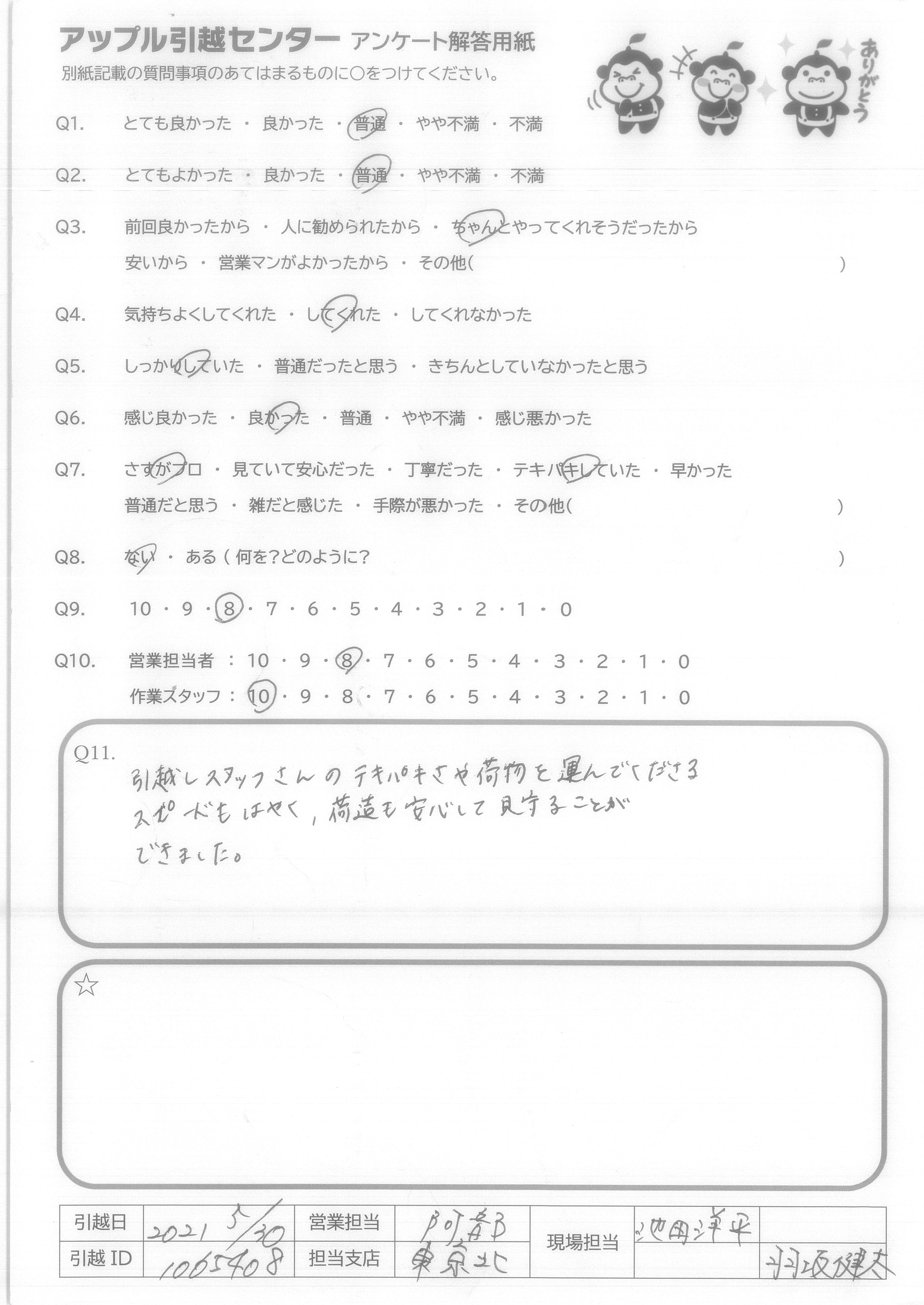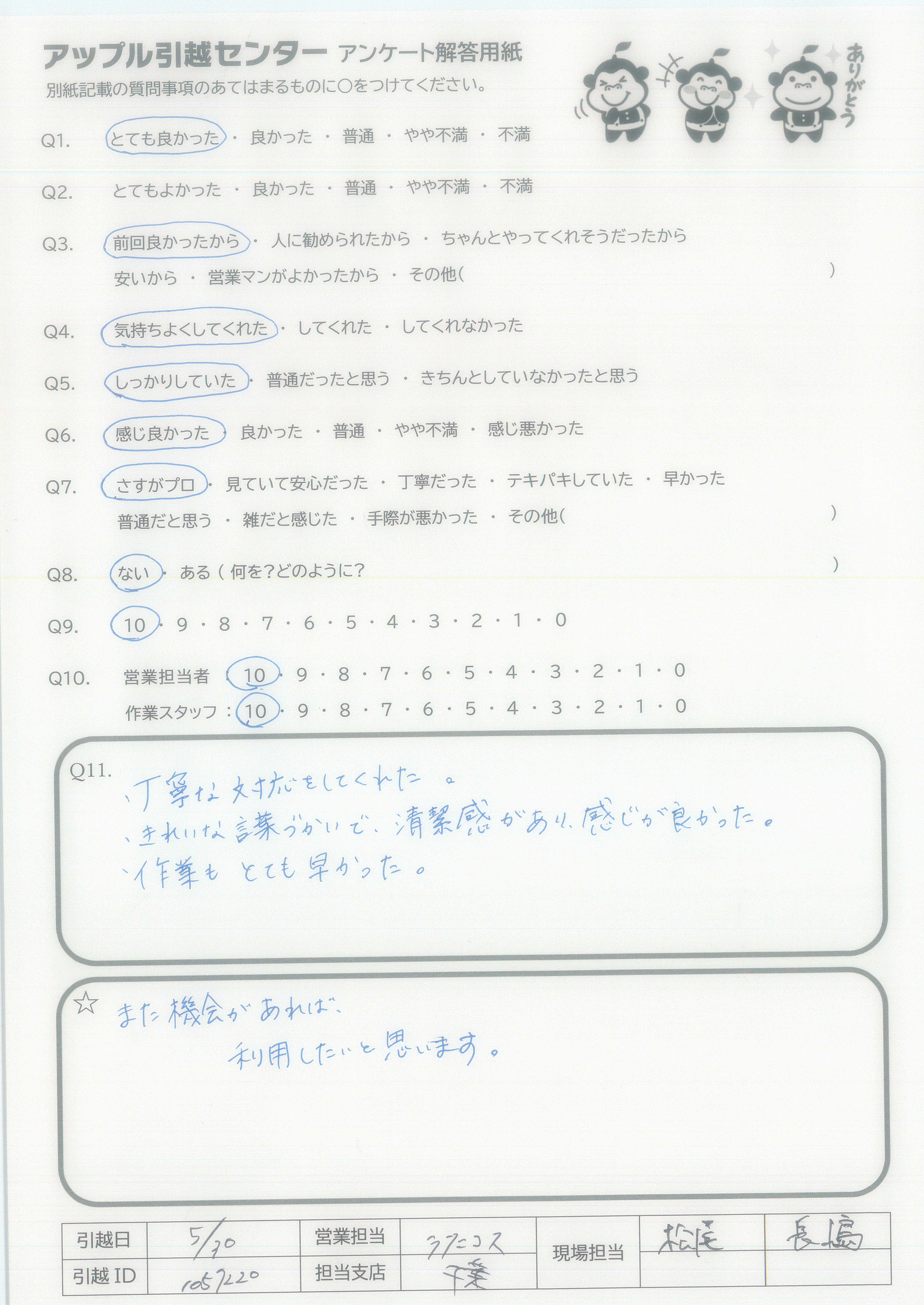 A.話しやすく、丁寧でテキパキとしていただいた上、とても早く引越しができたので。