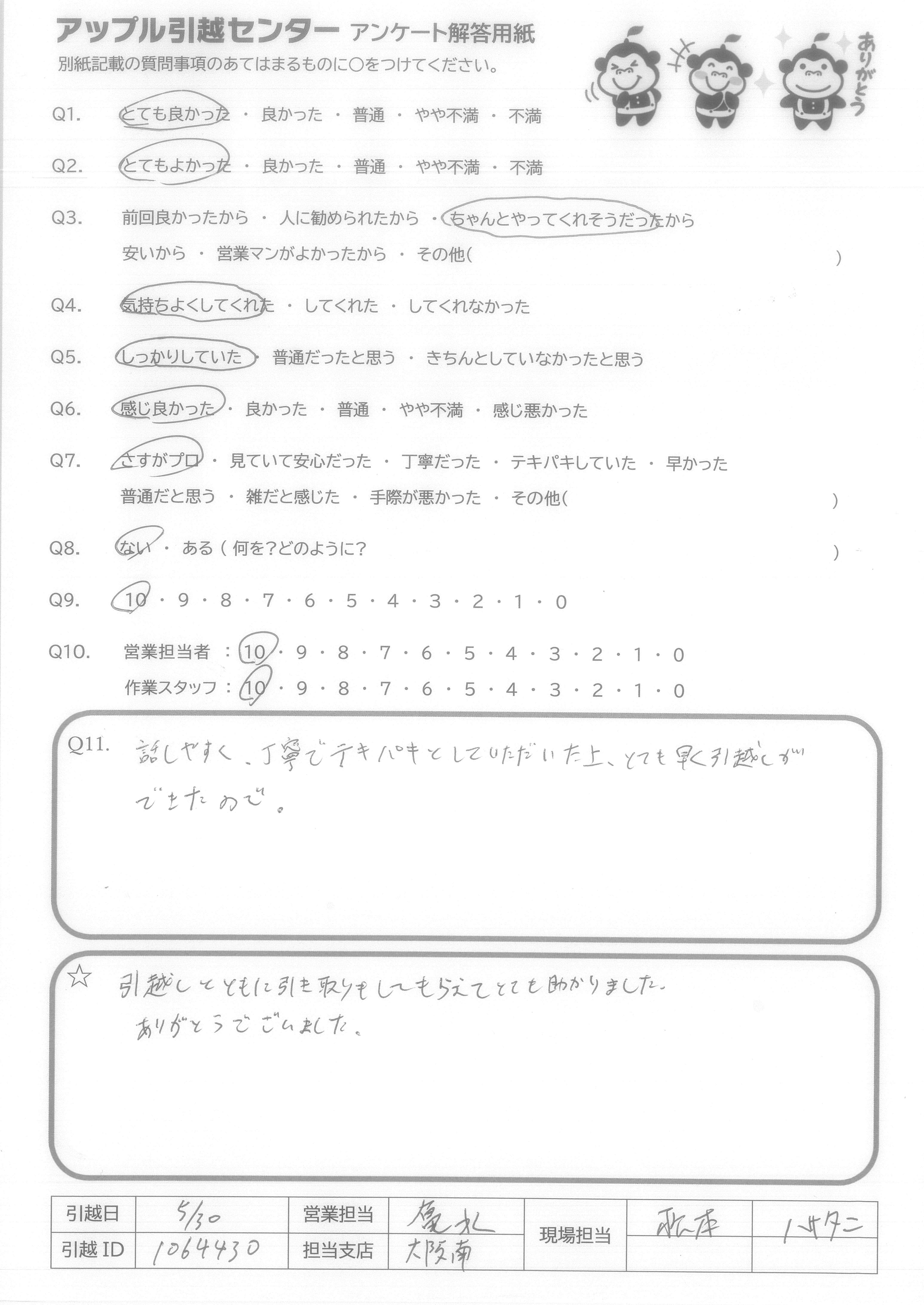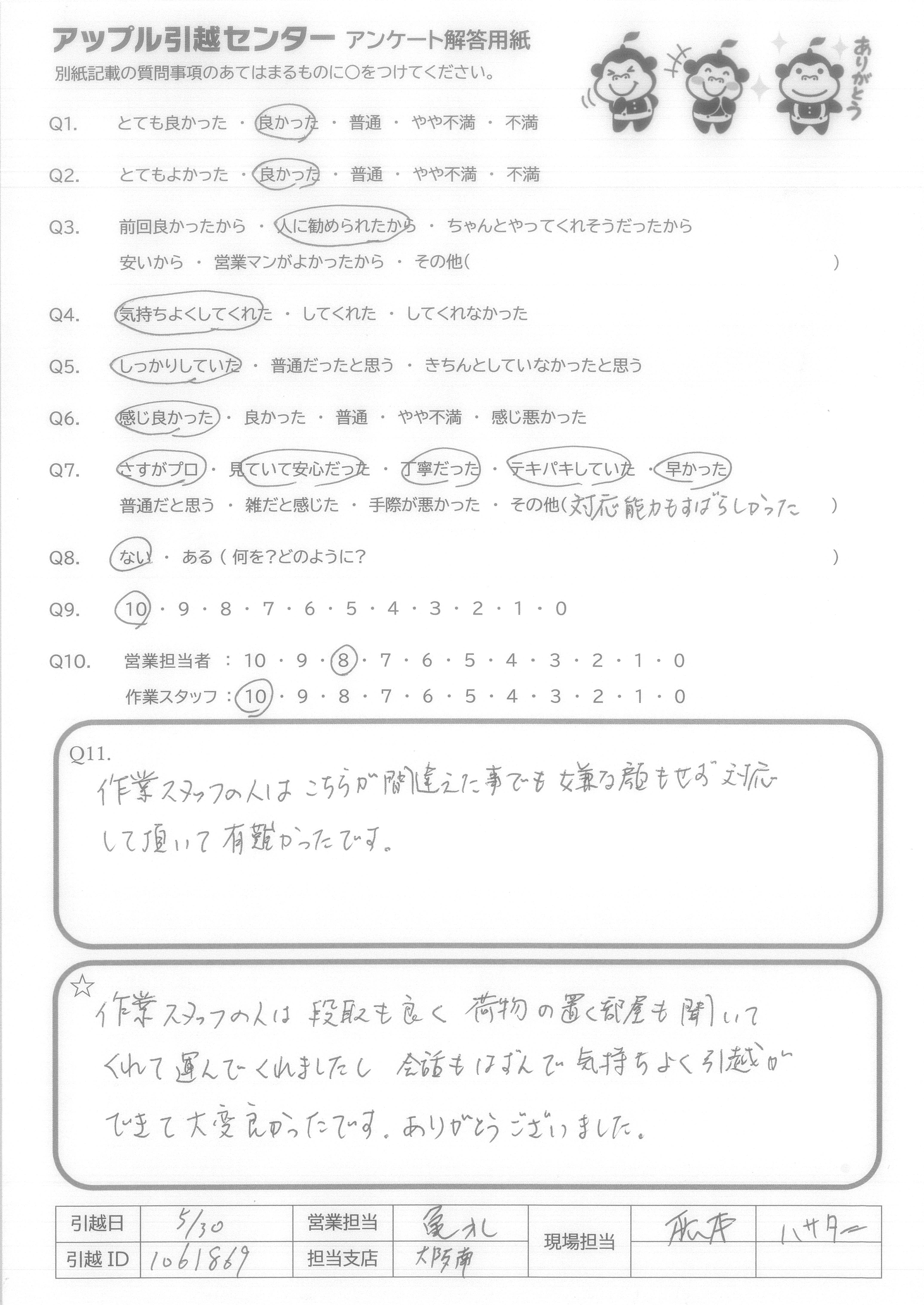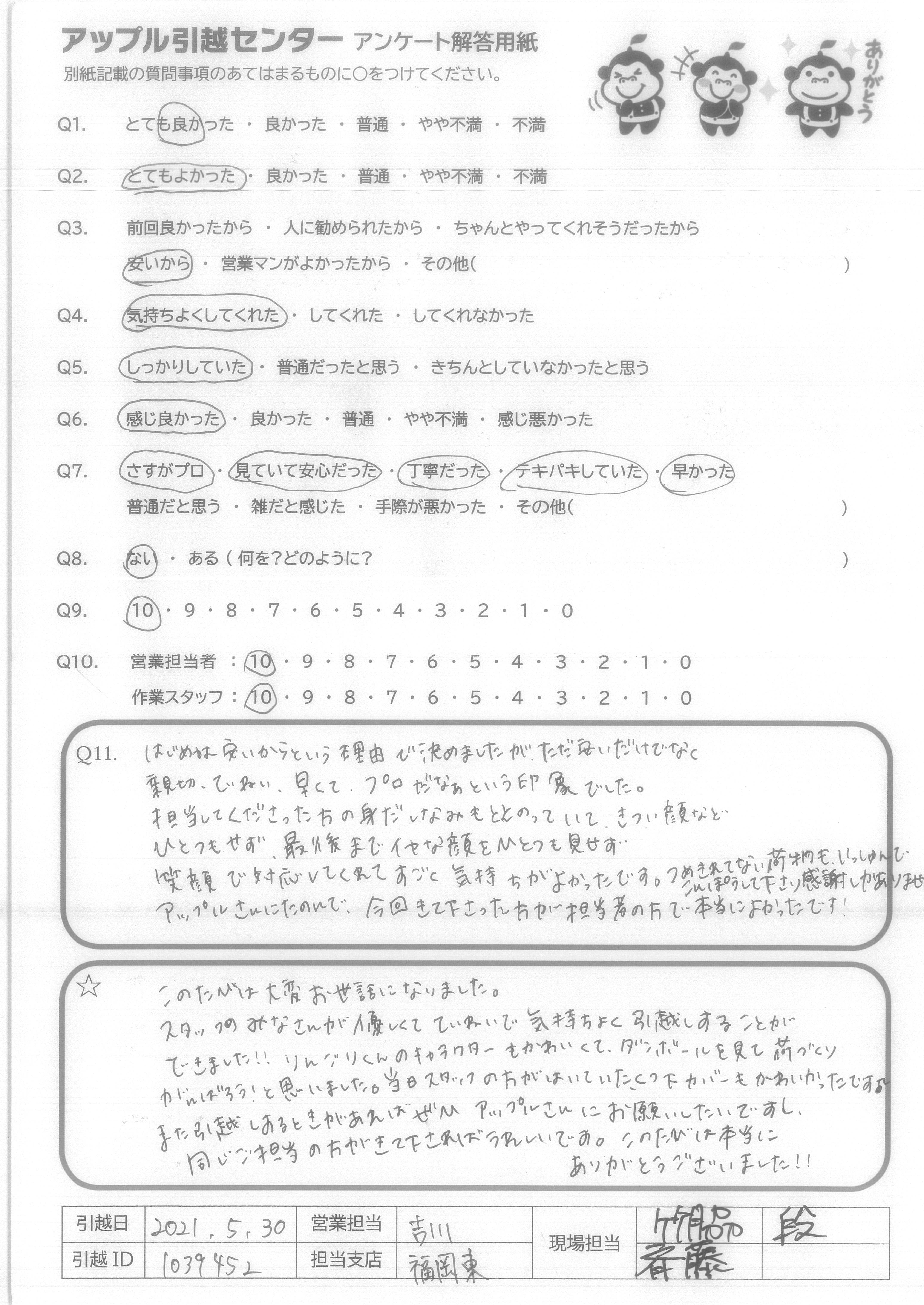 A.話しやすく、丁寧でテキパキとしていただいた上、とても早く引越しができたので。