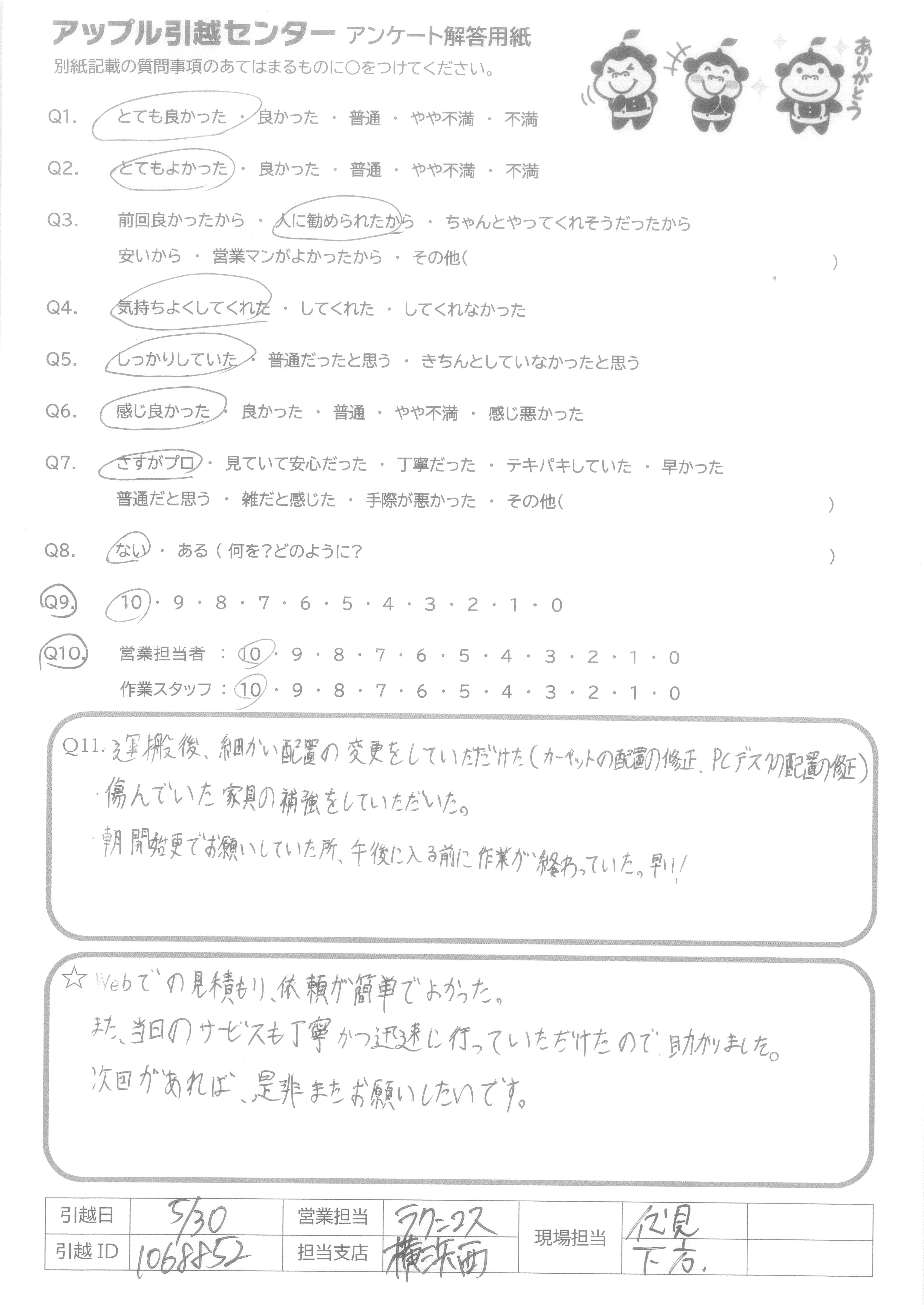 A.・運搬後、細かい配置の変更をしていただけた(カーペットの配置の修正、PCデスクの配置の修正) ・傷んでいた家具の補強をしていただいた。 ・朝開始でお願いしていた所、午後に入る前に作業が終わっていた。早い!