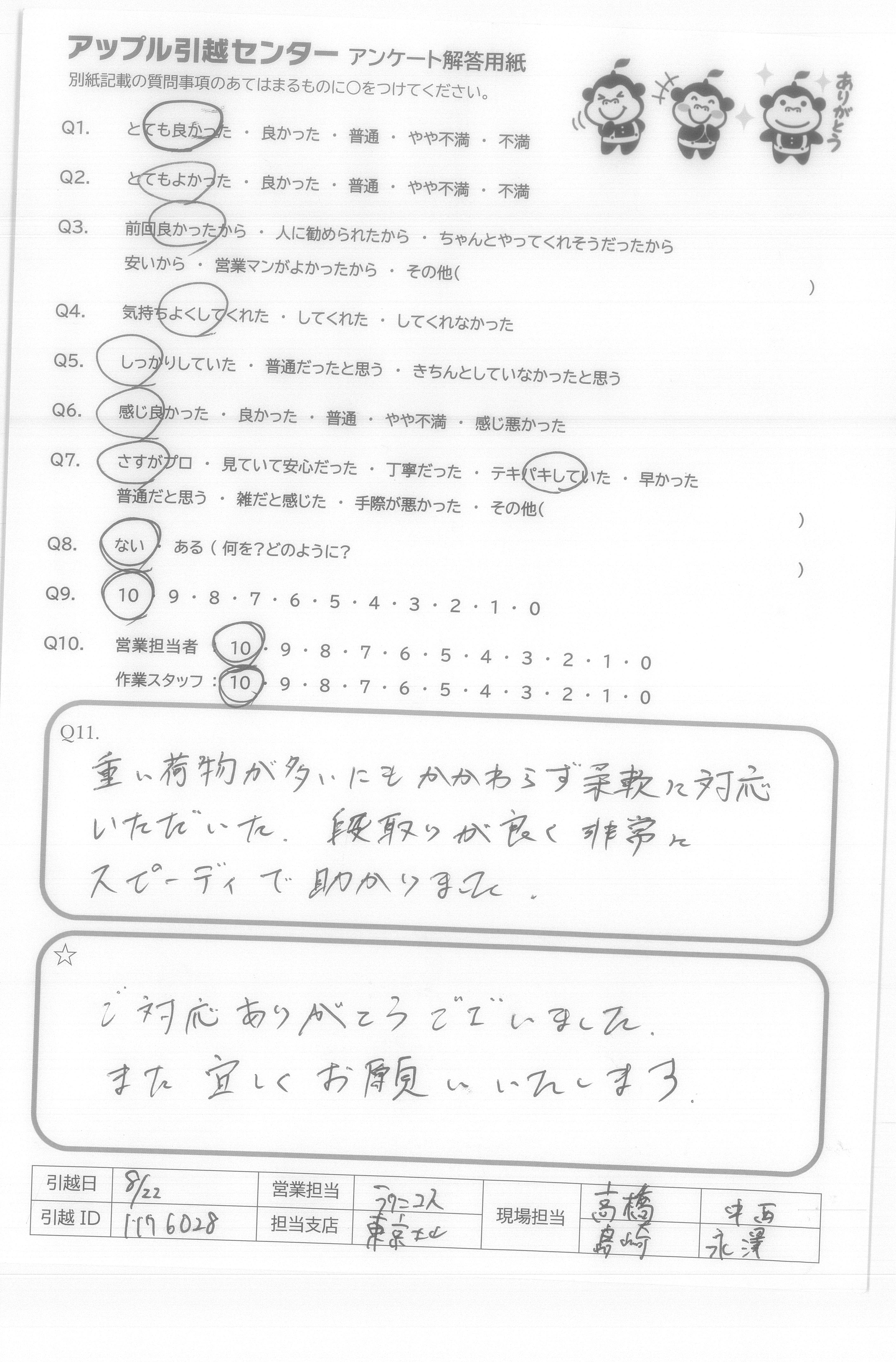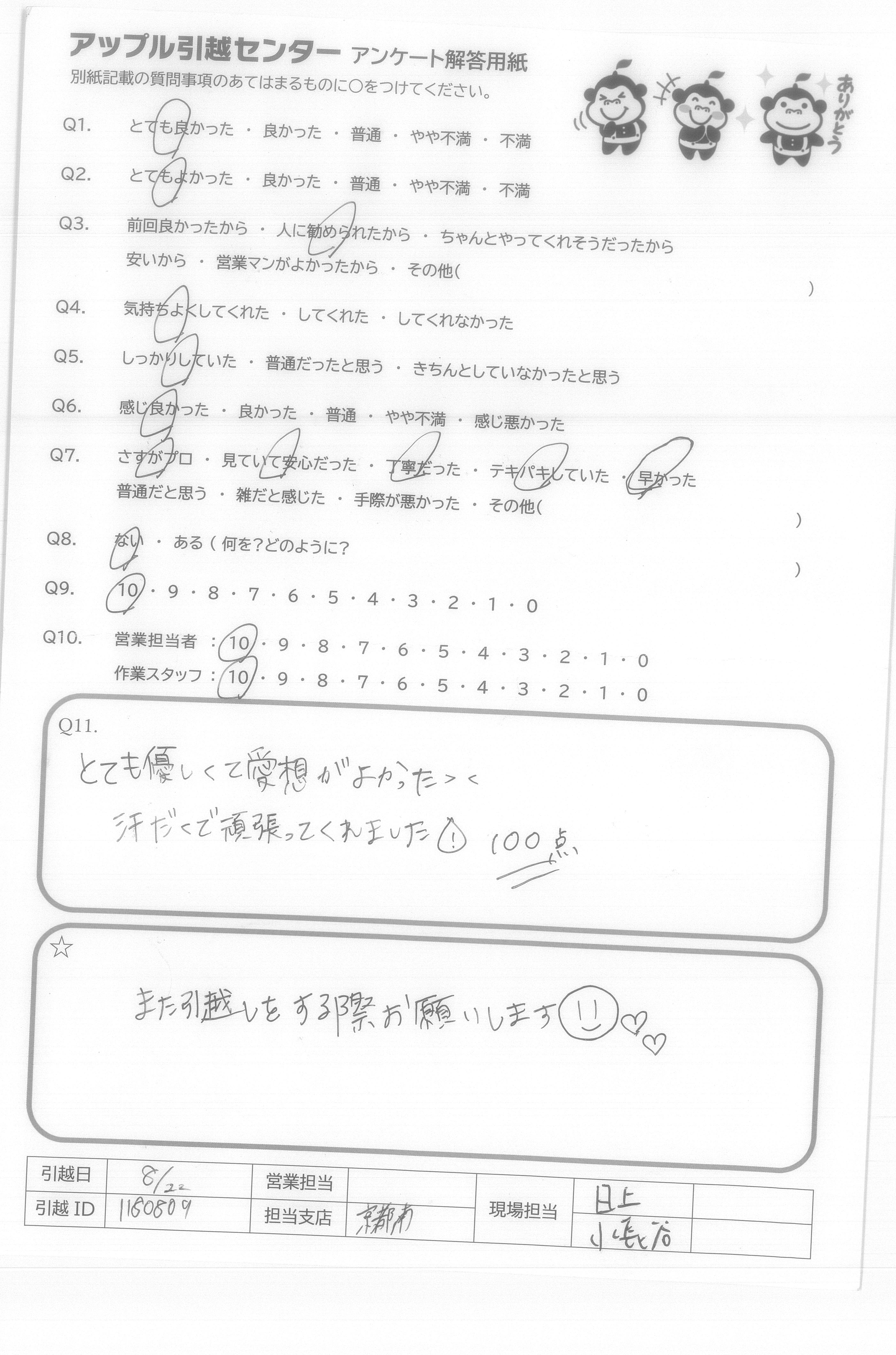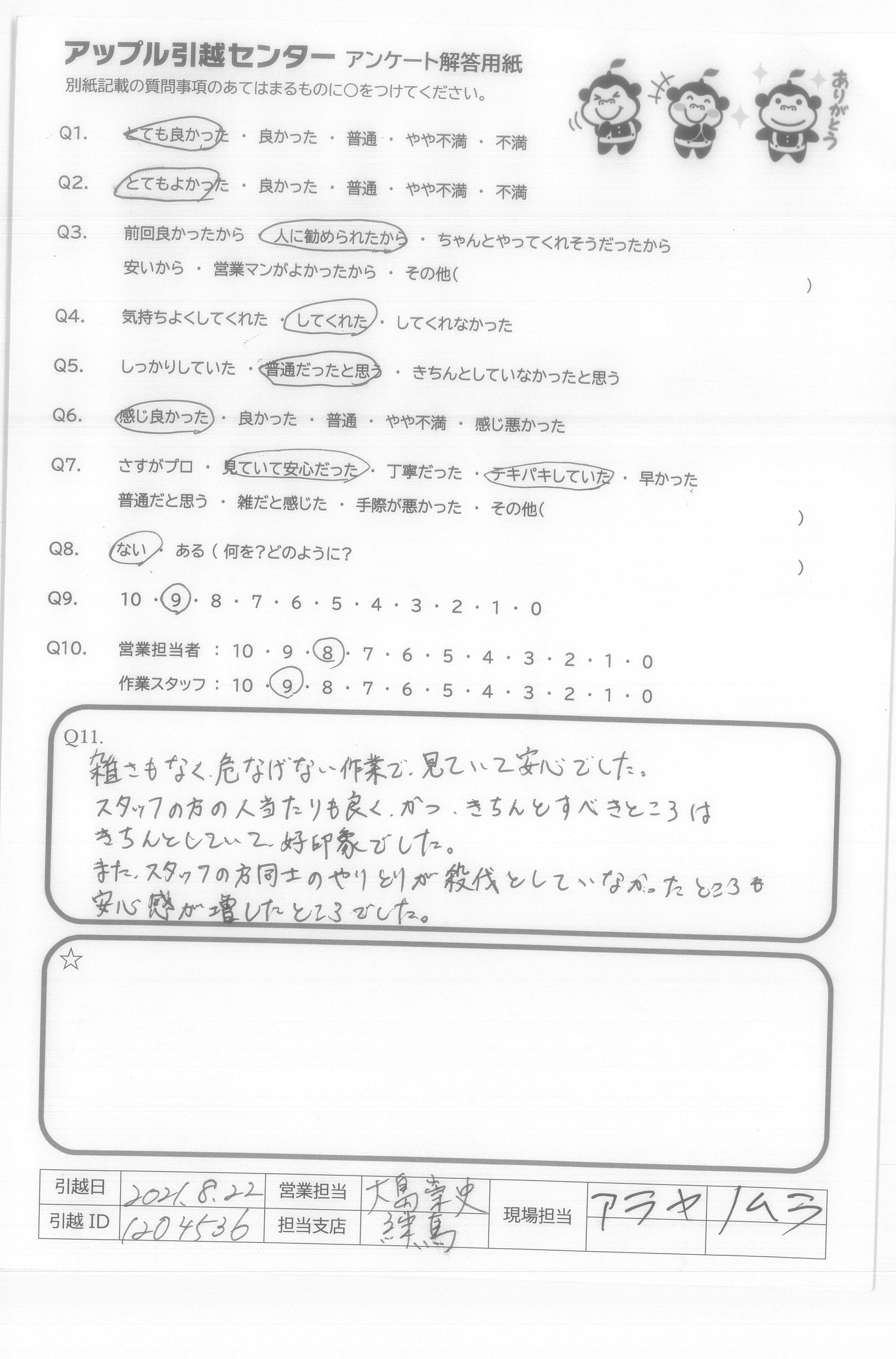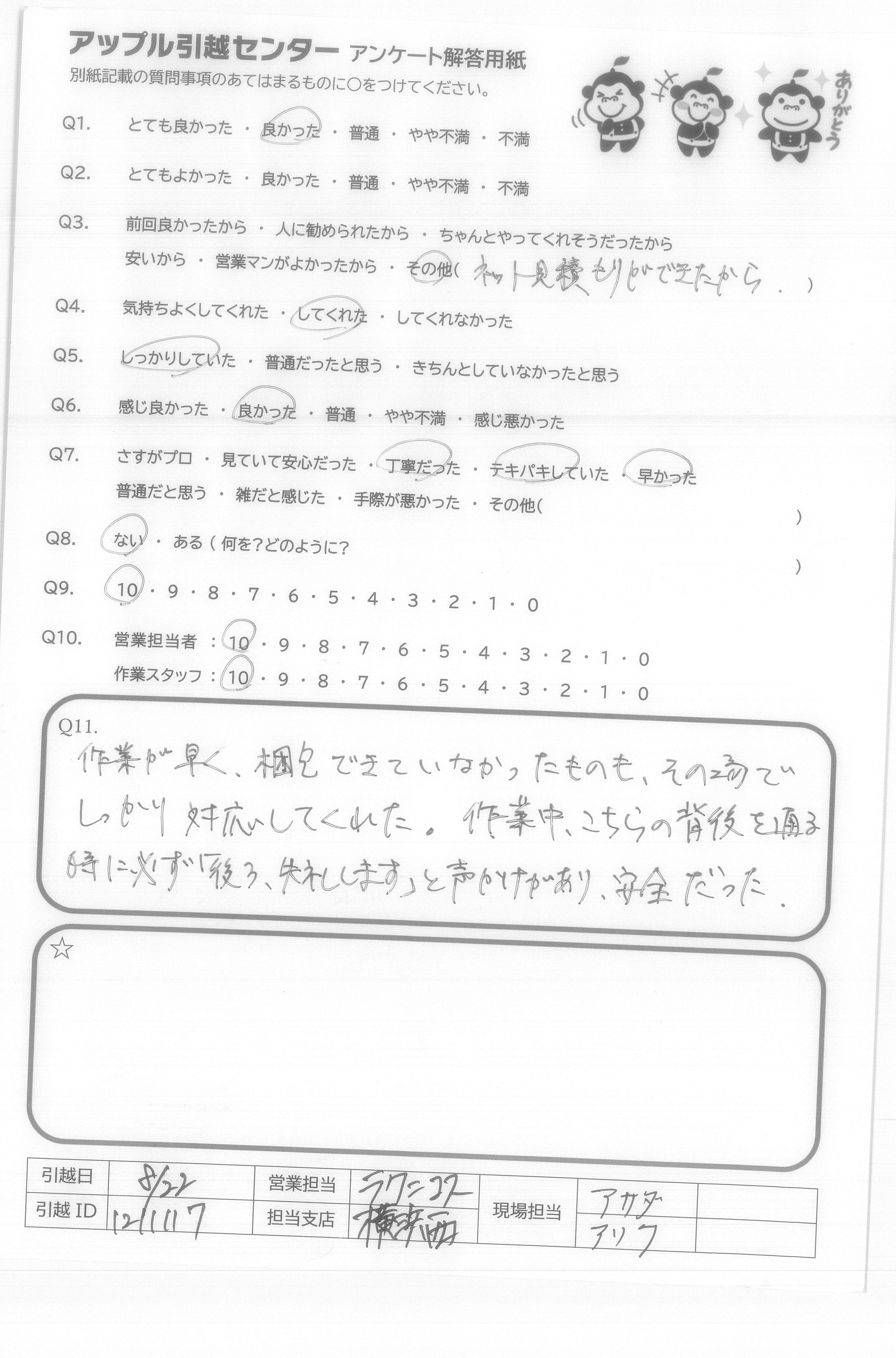 A.今回、御社を選んで、よかったと思います。友人も以前川崎から、千葉への引越をたのんでよかったと言ってました。遠方の引越も行っているかわからなかったので、9点です。(ほぼ満点です) 営業の方もメールで丁寧にやりとりしてくれてよかったです。 作業の方も、あいさつはしっかりしてくれててきぱき早い行動で作業をしてくれとてもありがたかったです。