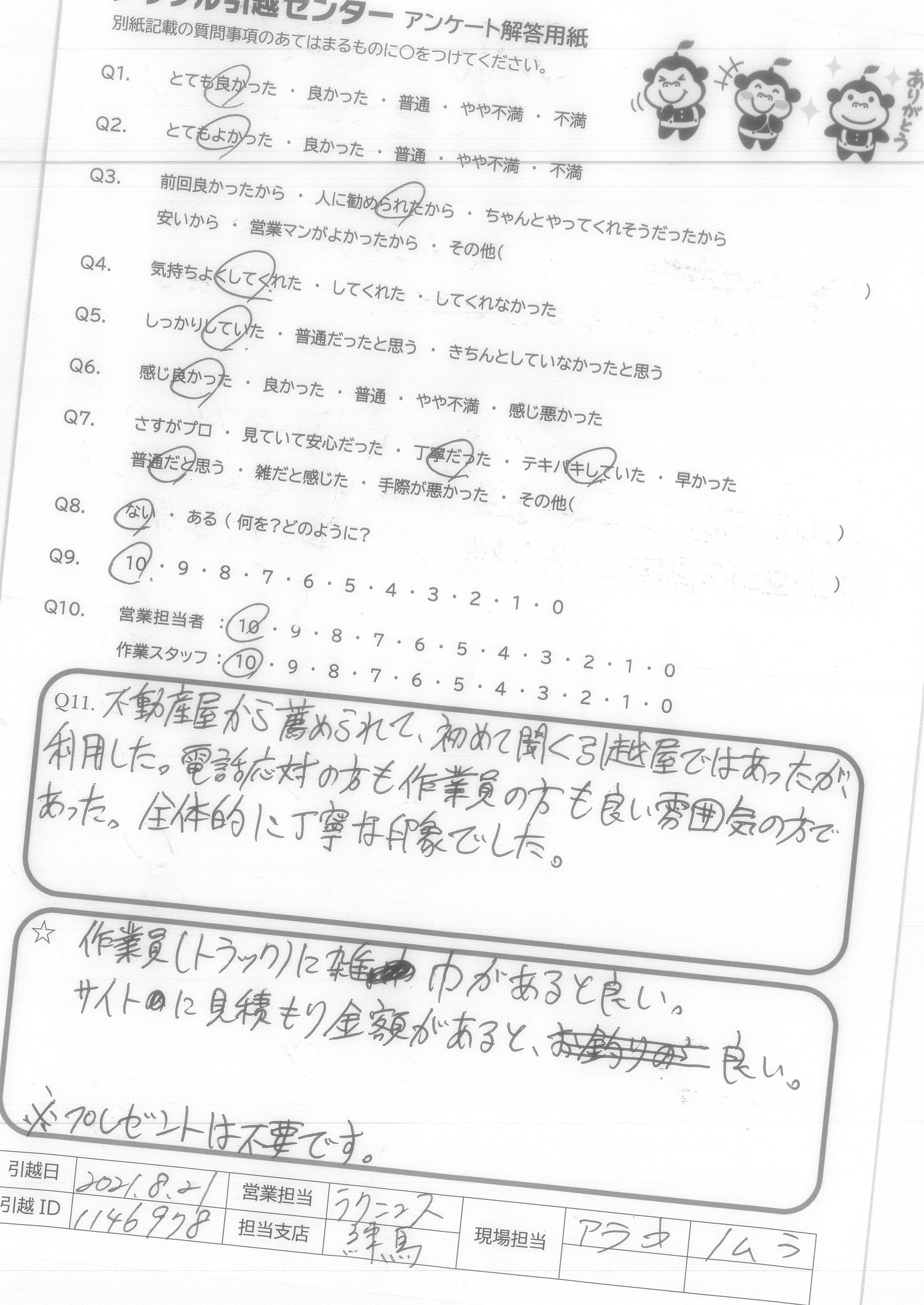 A.良い引越しができました。 ありがとうございます。