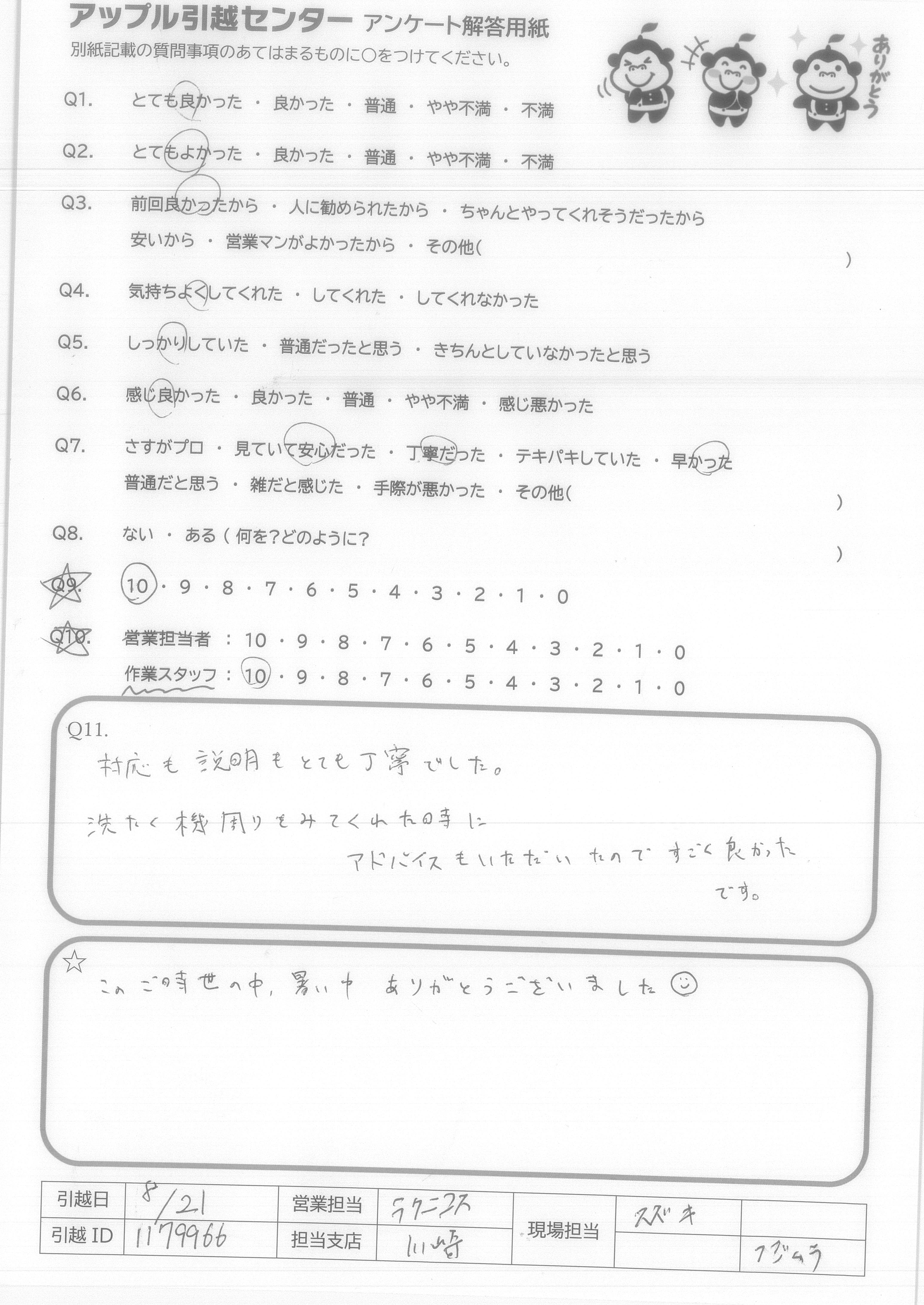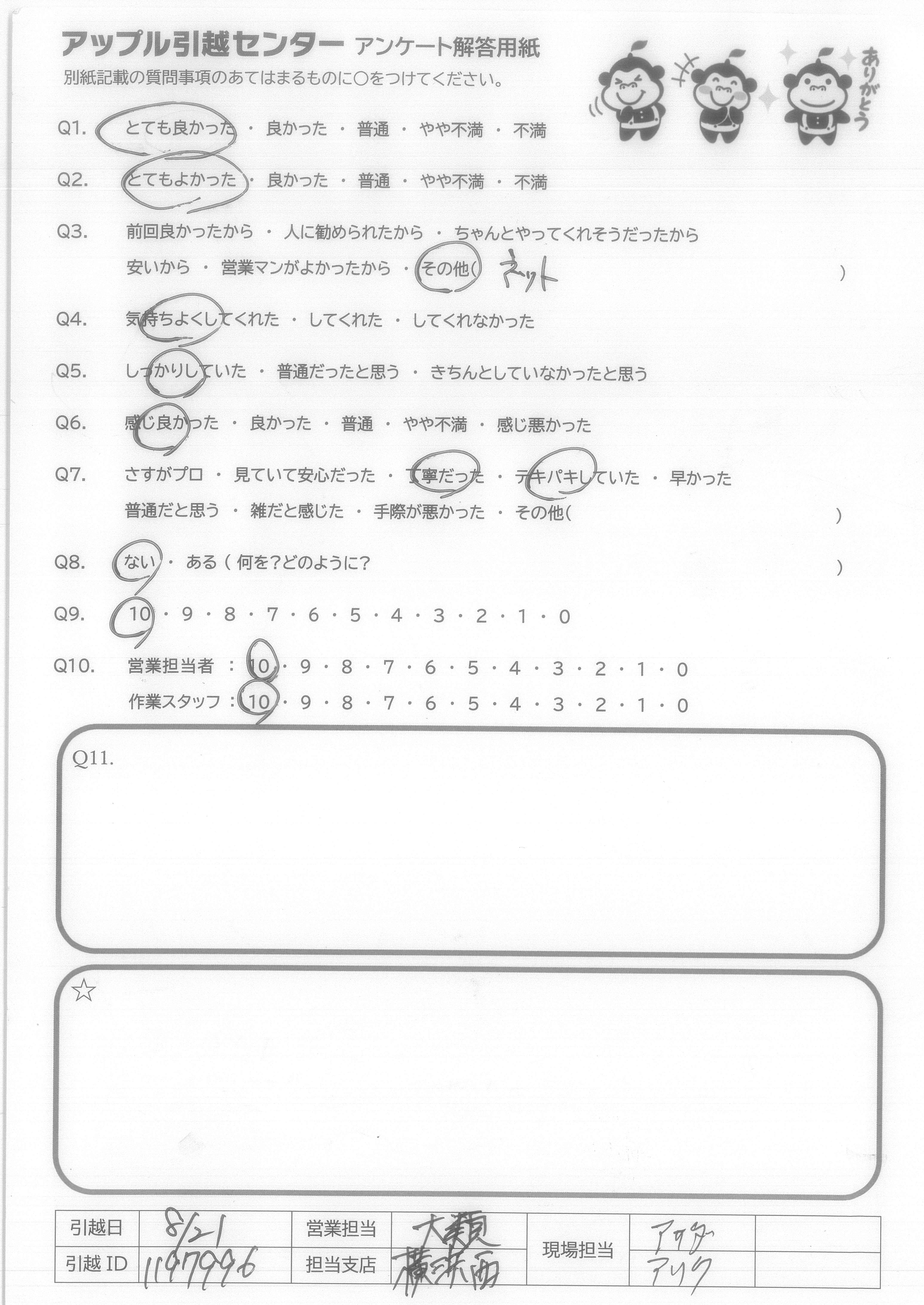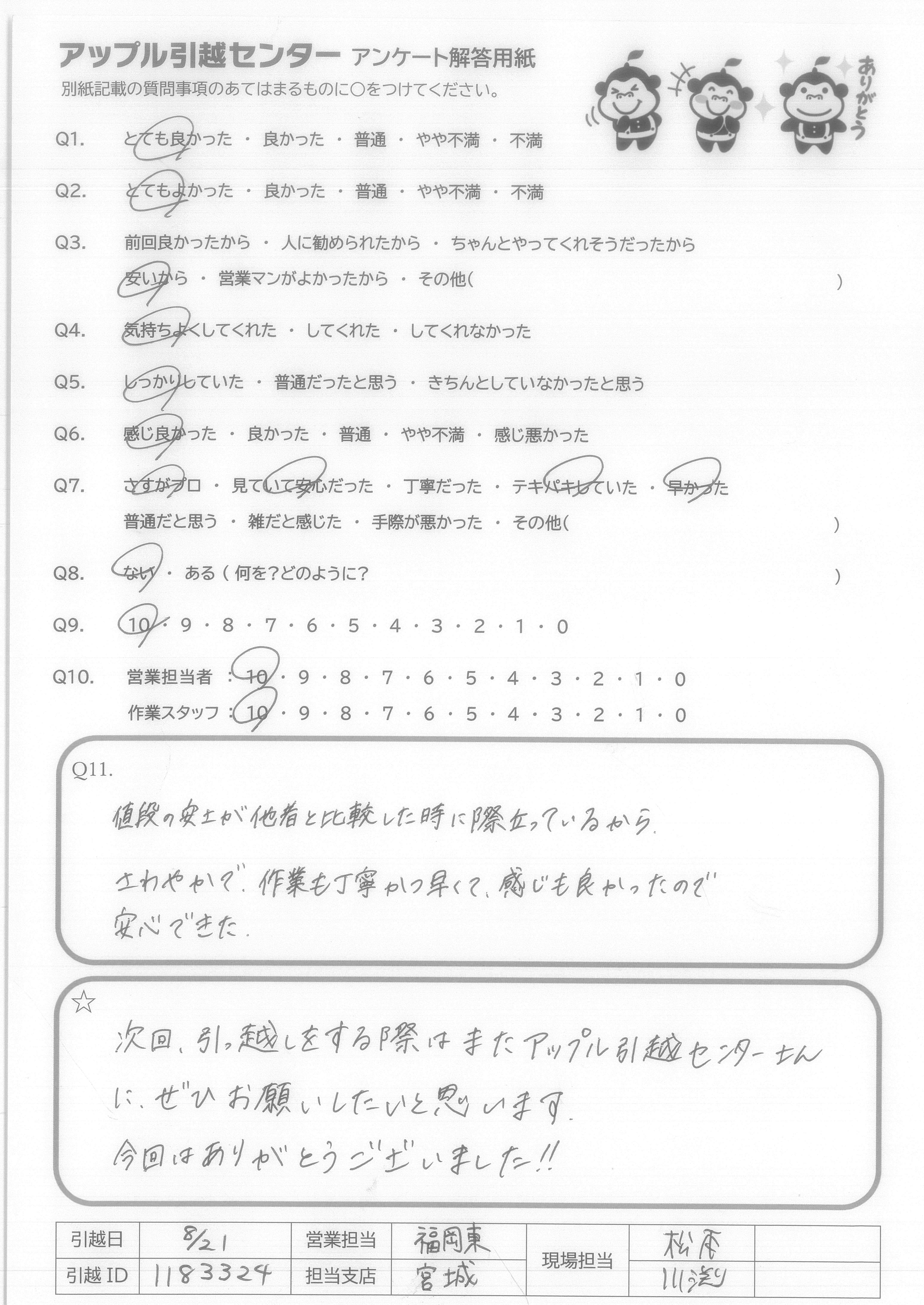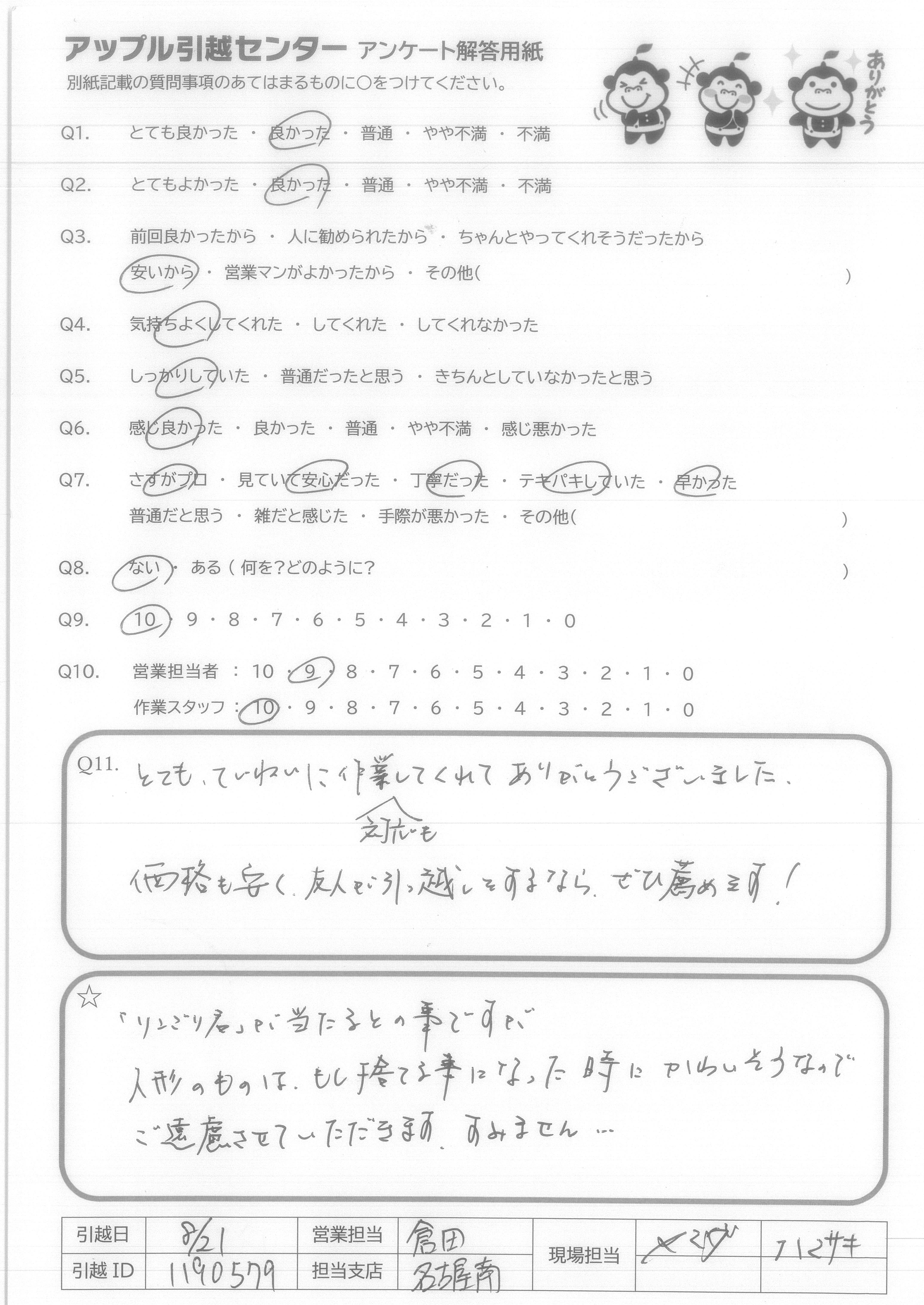 A.次回、引っ越しをする際はまたアップル引越センターさんにぜひお願いしたいと思います。 今回はありがとうございました!!