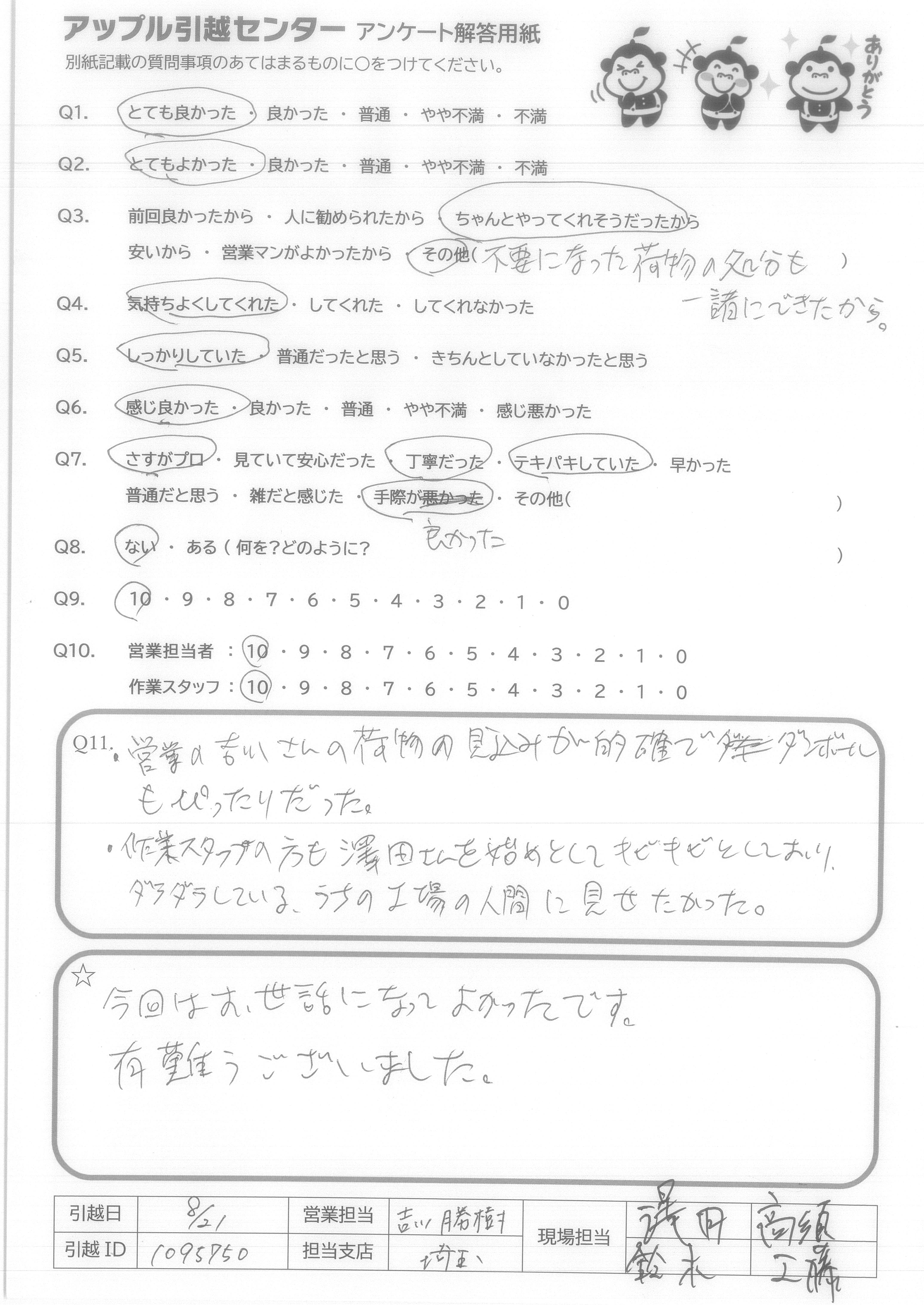 A.・営業の吉川さんの荷物の見込みが的確でダンボールもぴったりだった。 ・作業スタッフの方も澤田さんを始めとしてキビキビとしており、ダラダラしている、うちの工場の人間に見せたかった。