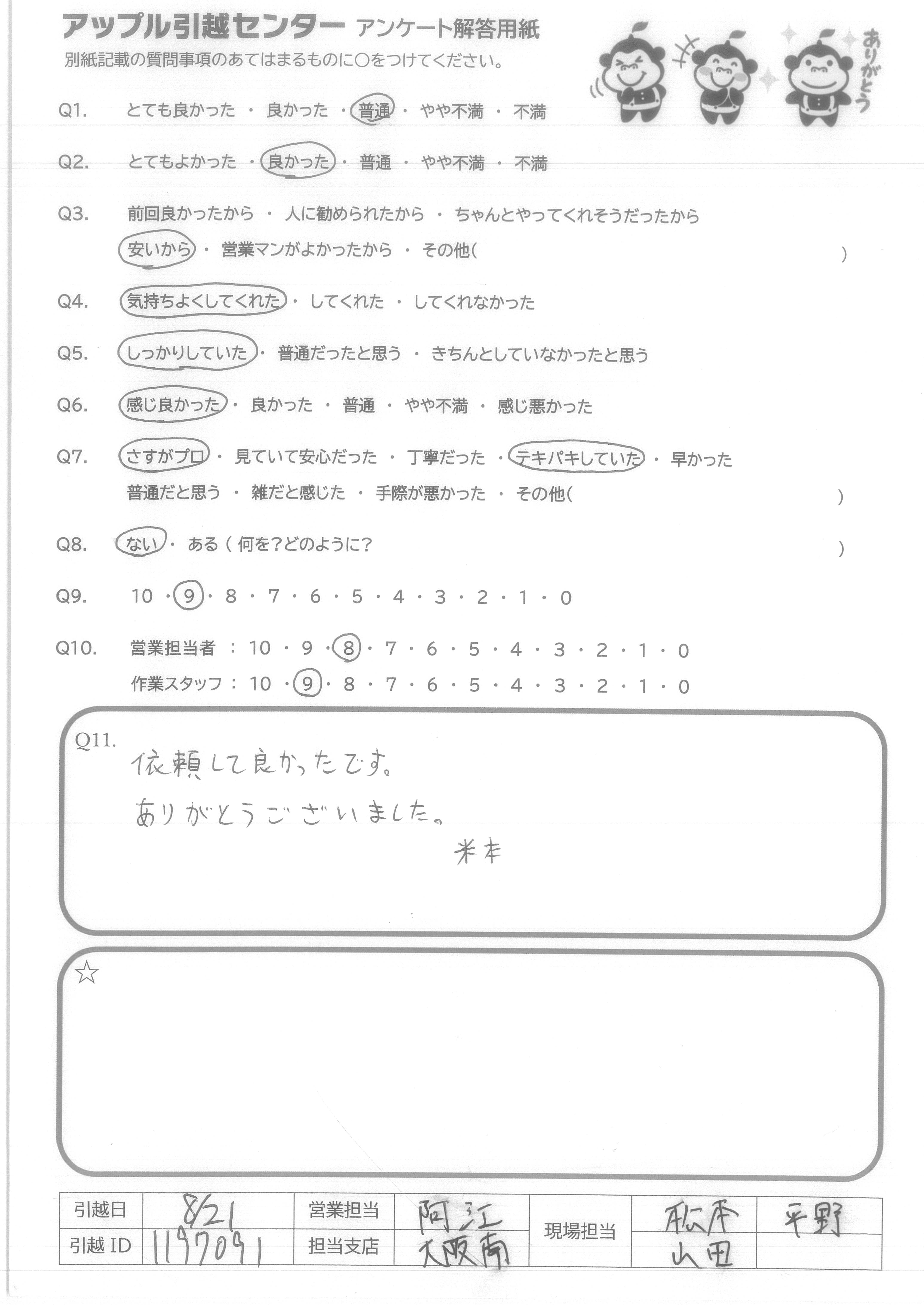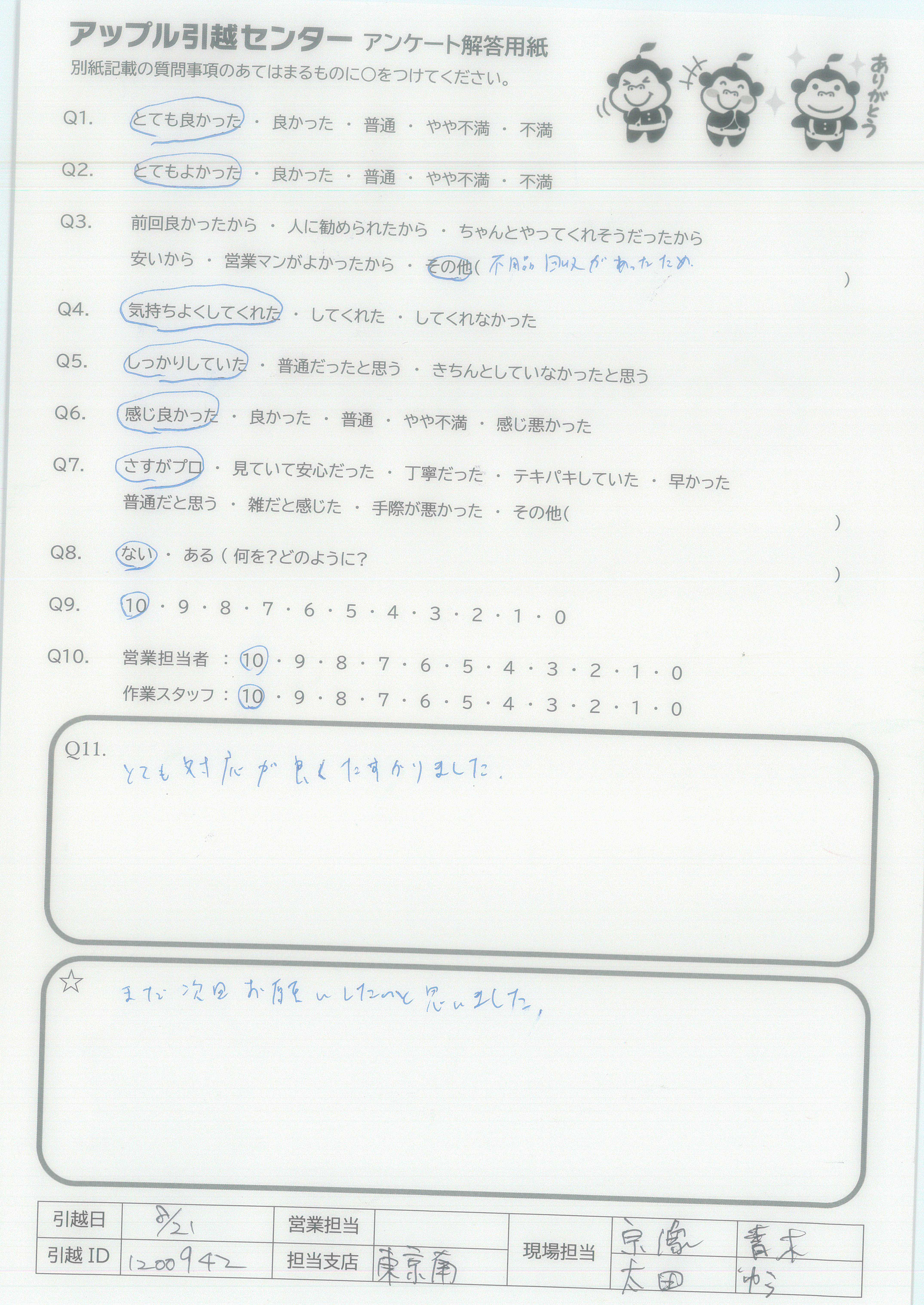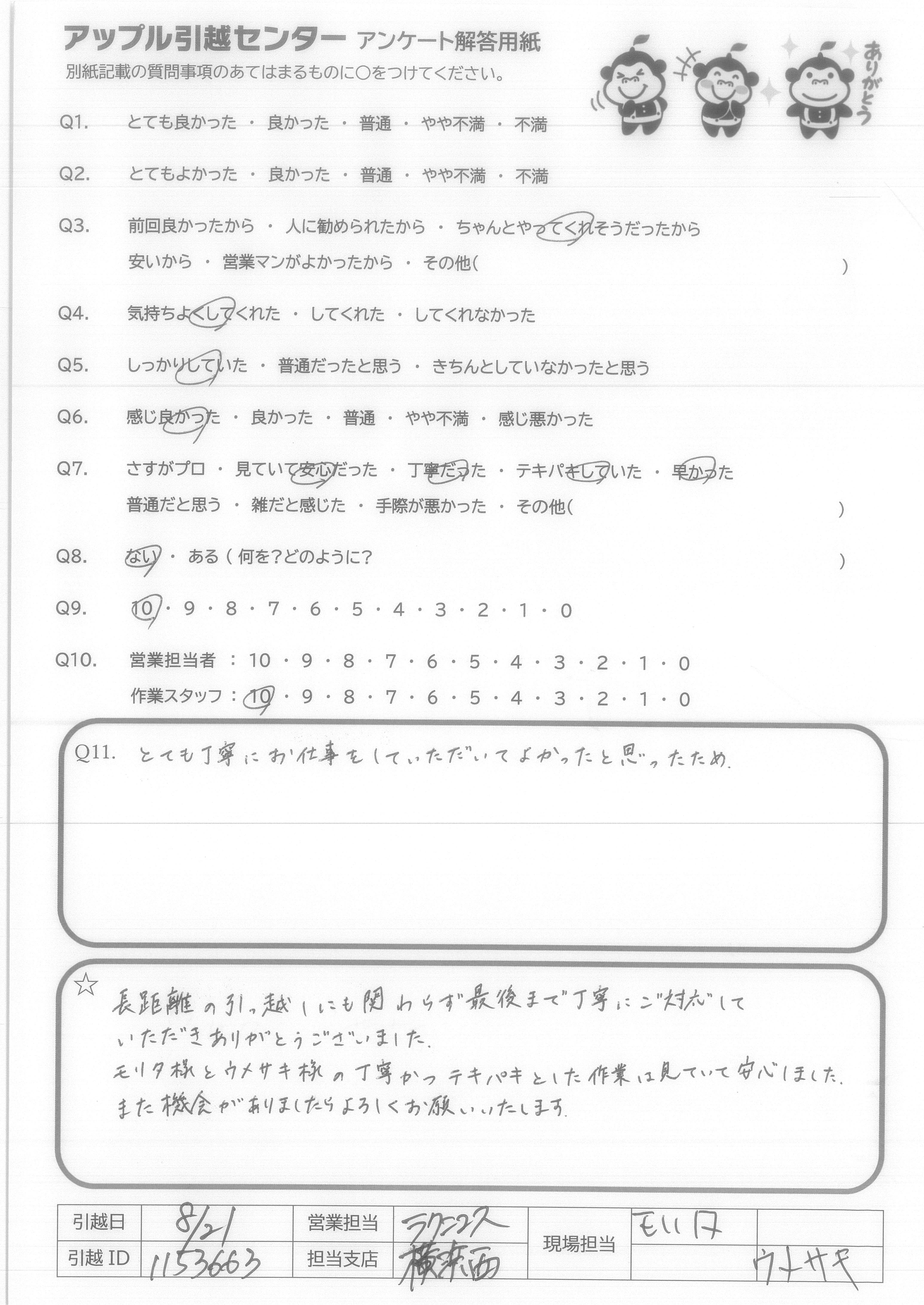 A.長距離の引っ越しにも関わらず最後まで丁寧にご対応していただきありがとうございました。 モリタ様とウメサキ様の丁寧かつテキパキとした作業は見ていて安心しました。 また機会がありましたらよろしくお願いいたします。