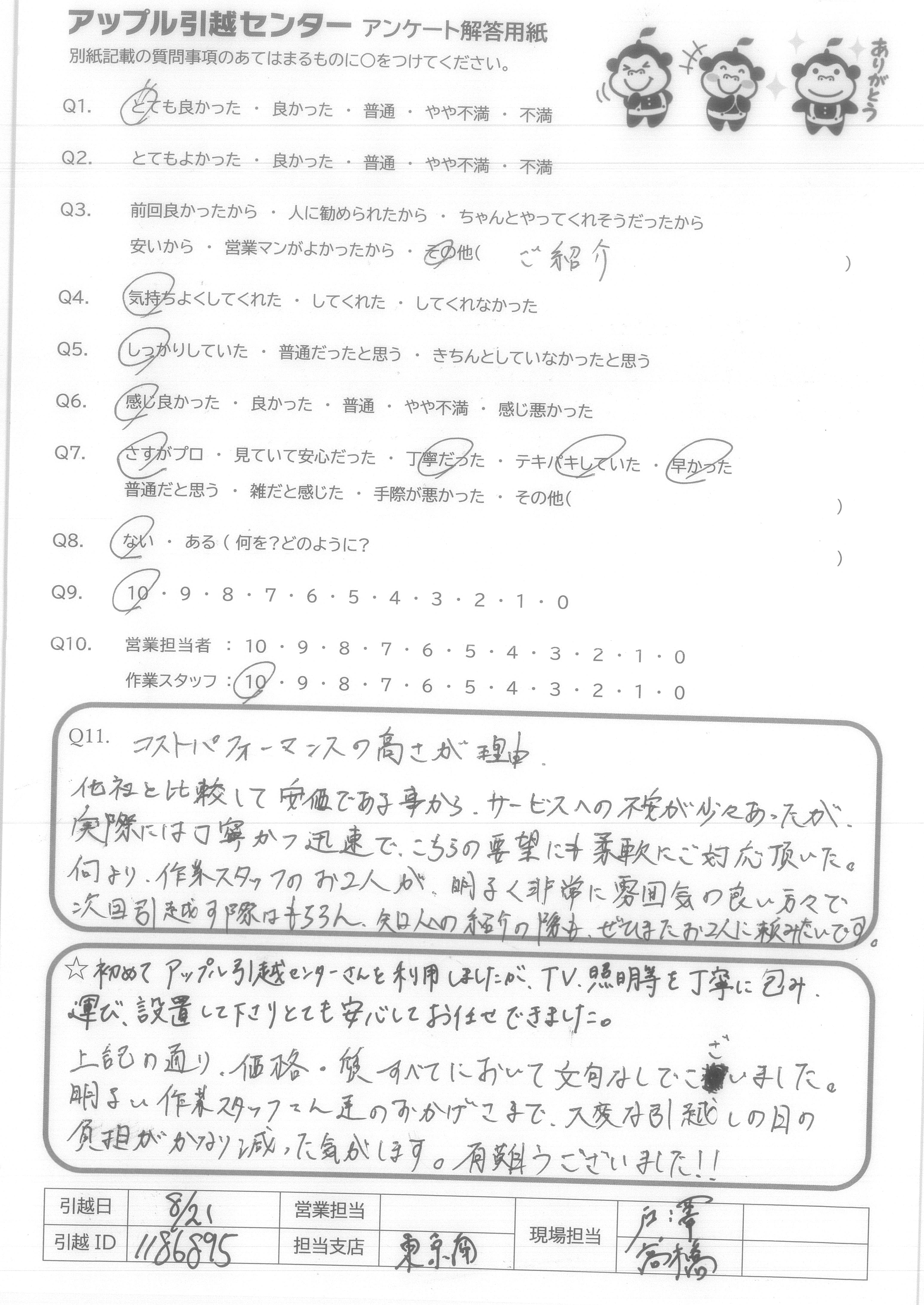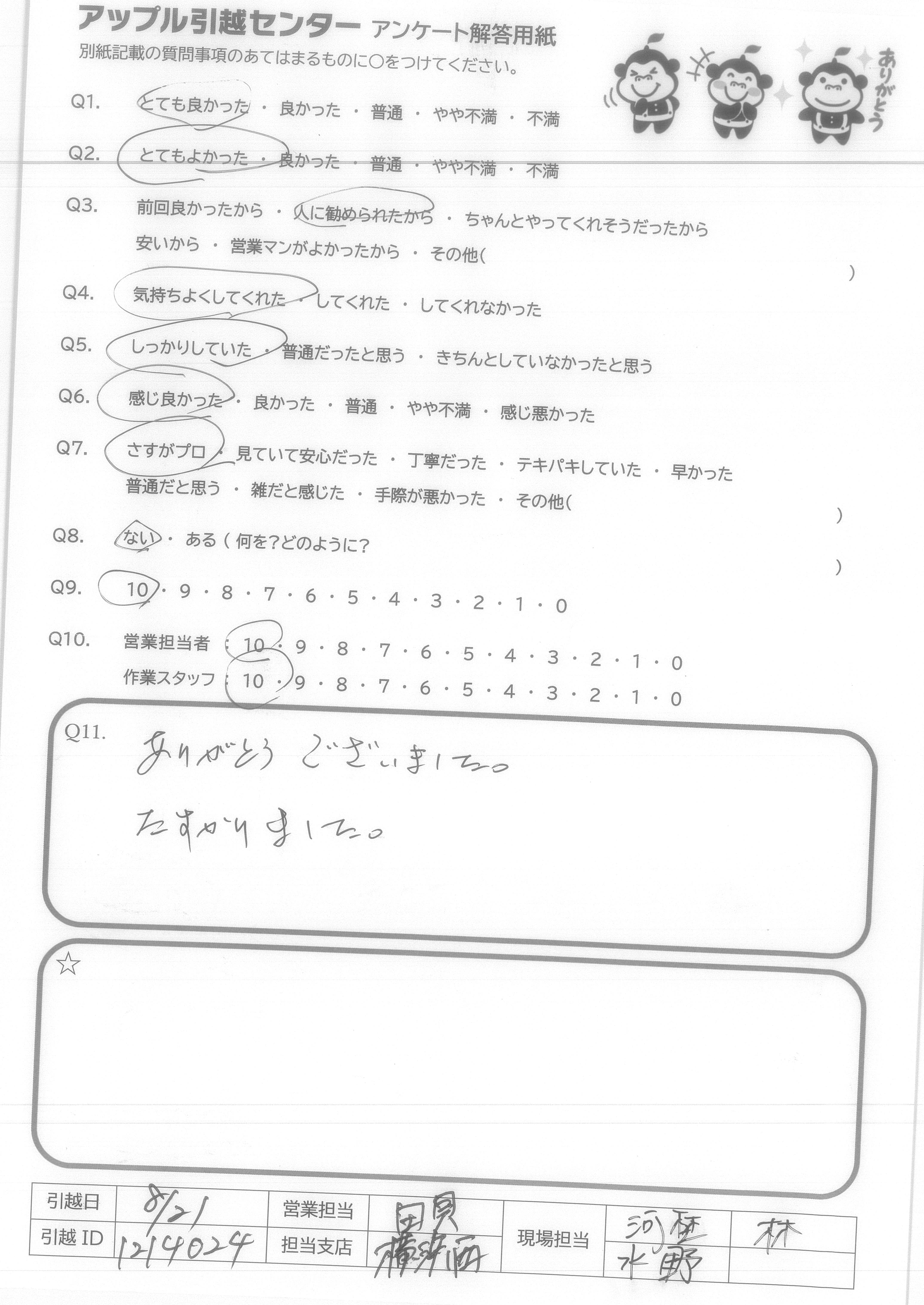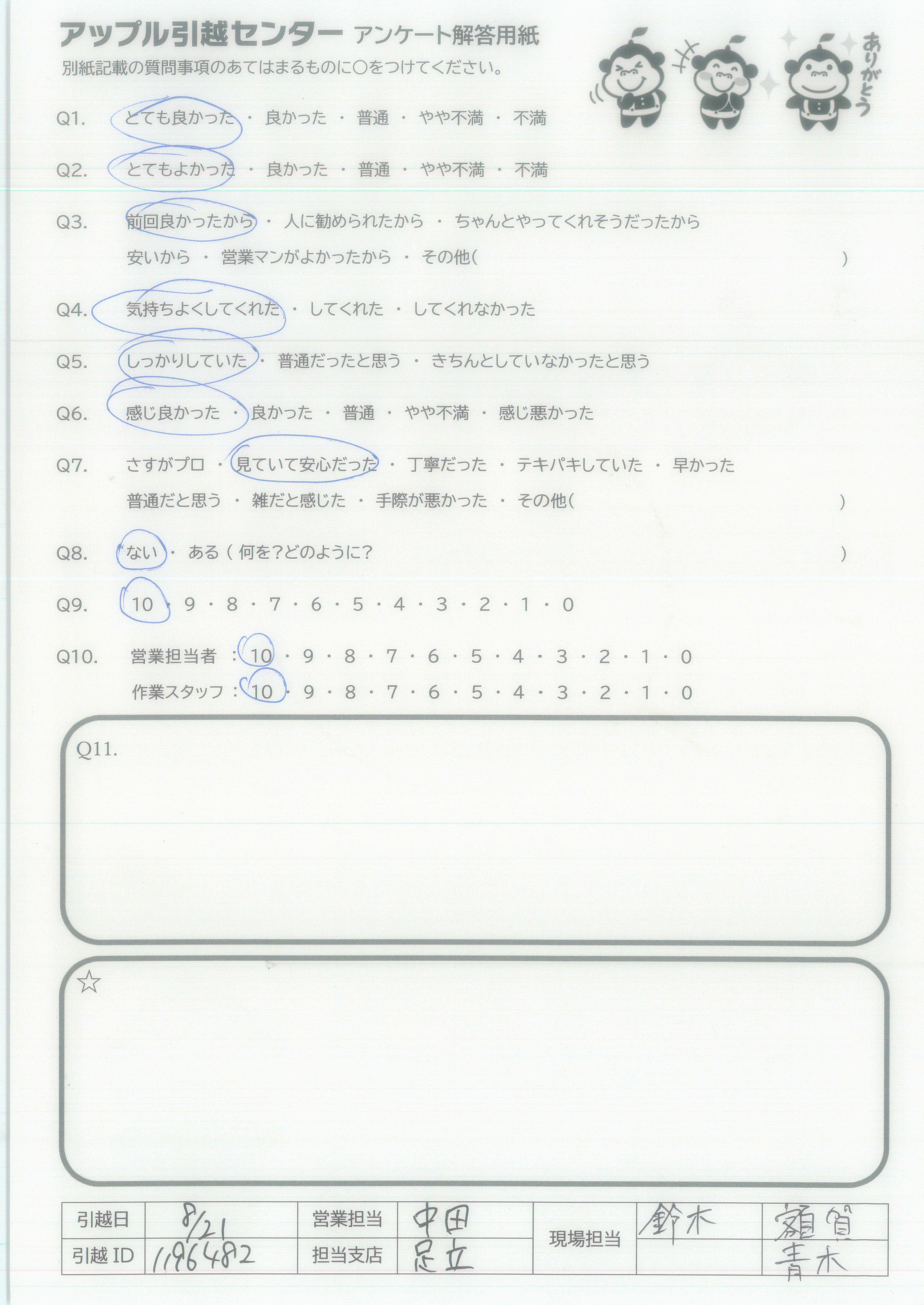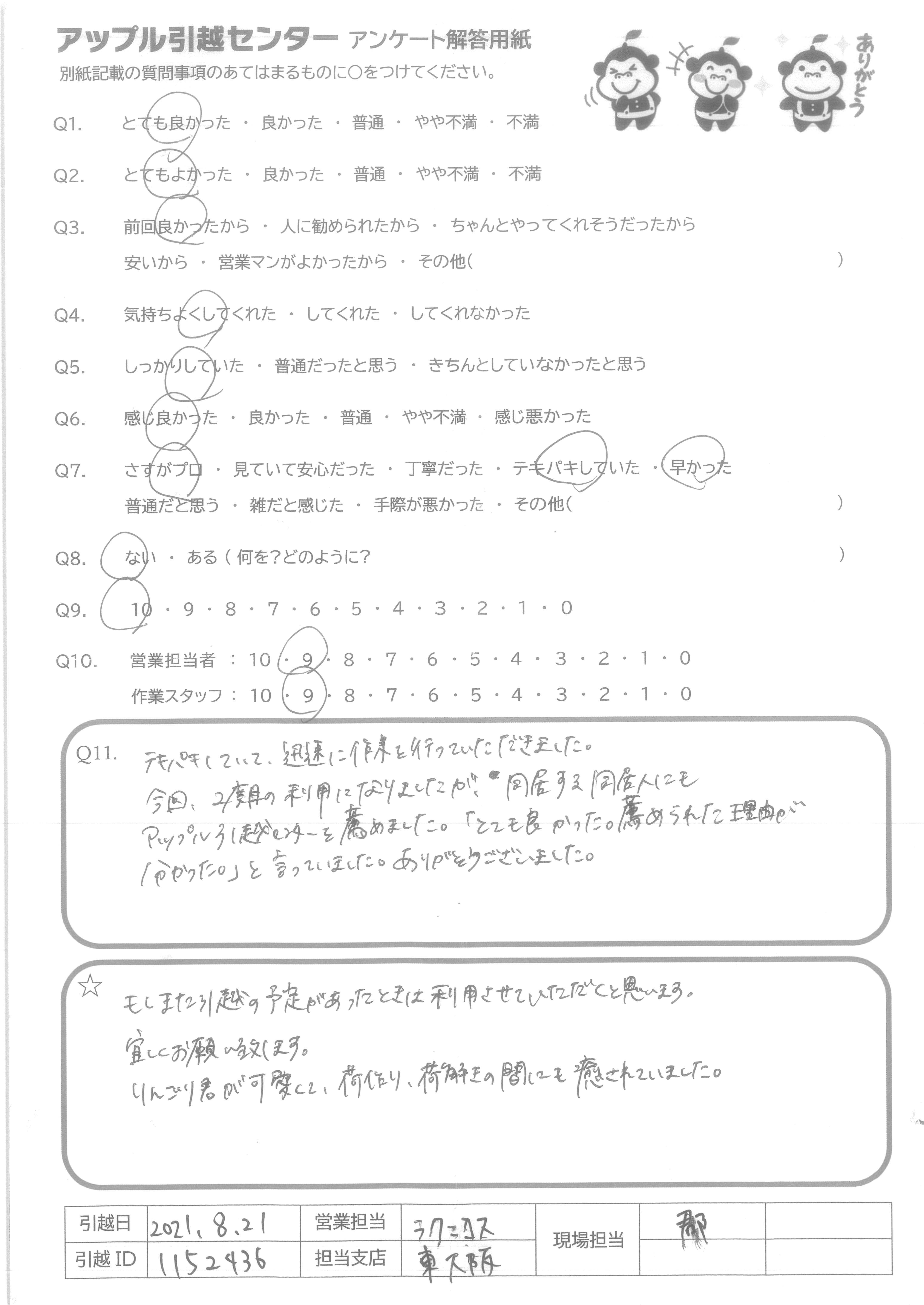A.長距離の引っ越しにも関わらず最後まで丁寧にご対応していただきありがとうございました。 モリタ様とウメサキ様の丁寧かつテキパキとした作業は見ていて安心しました。 また機会がありましたらよろしくお願いいたします。