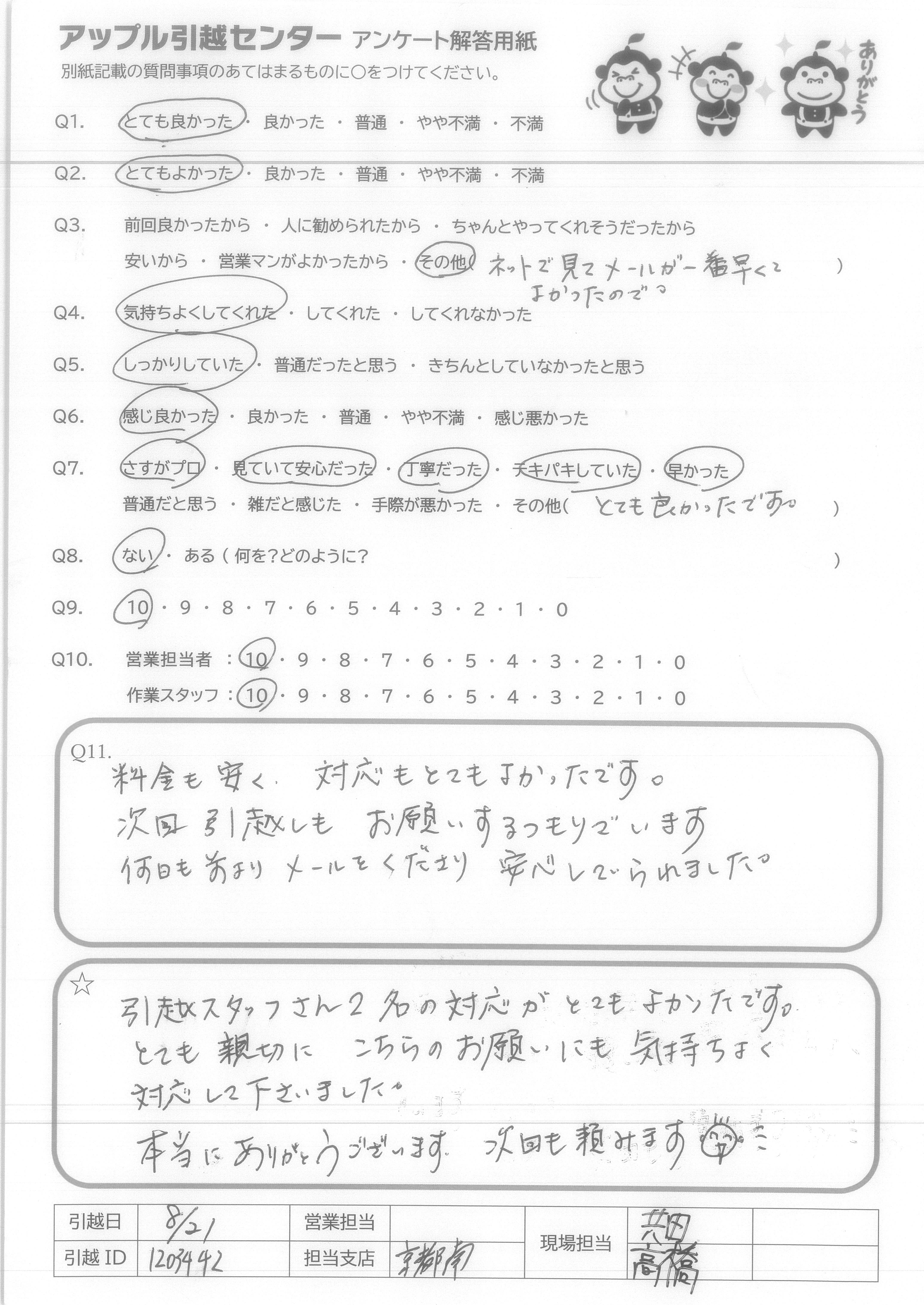 A.料金も安く、対応もとてもよかったです。次回引越しもお願いするつもりでいます。 何日も前よりメールをくださり安心してられました。