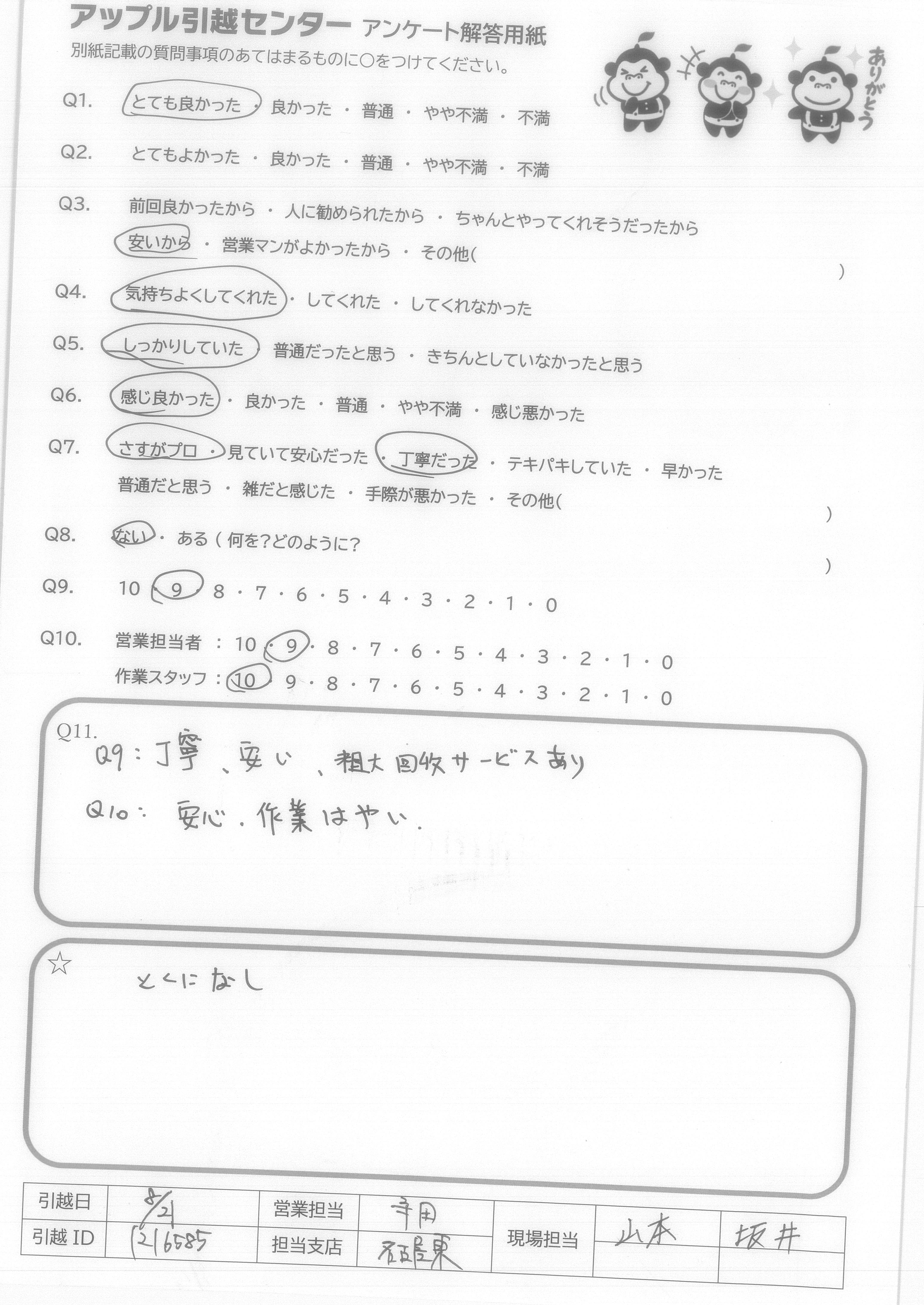 A.Q9:丁寧、安心、粗大回収サービスあり Q10:安心、作業はやい
