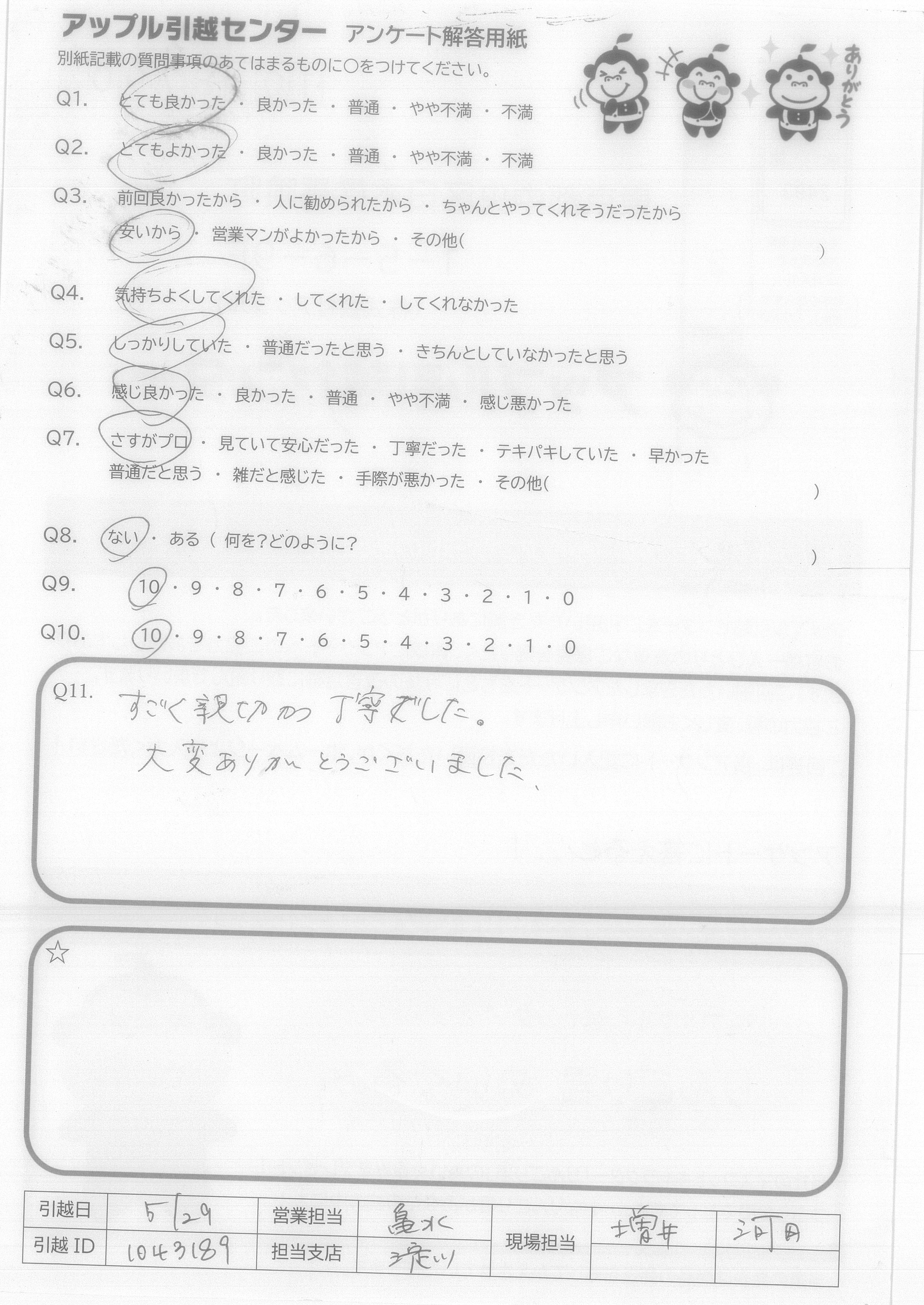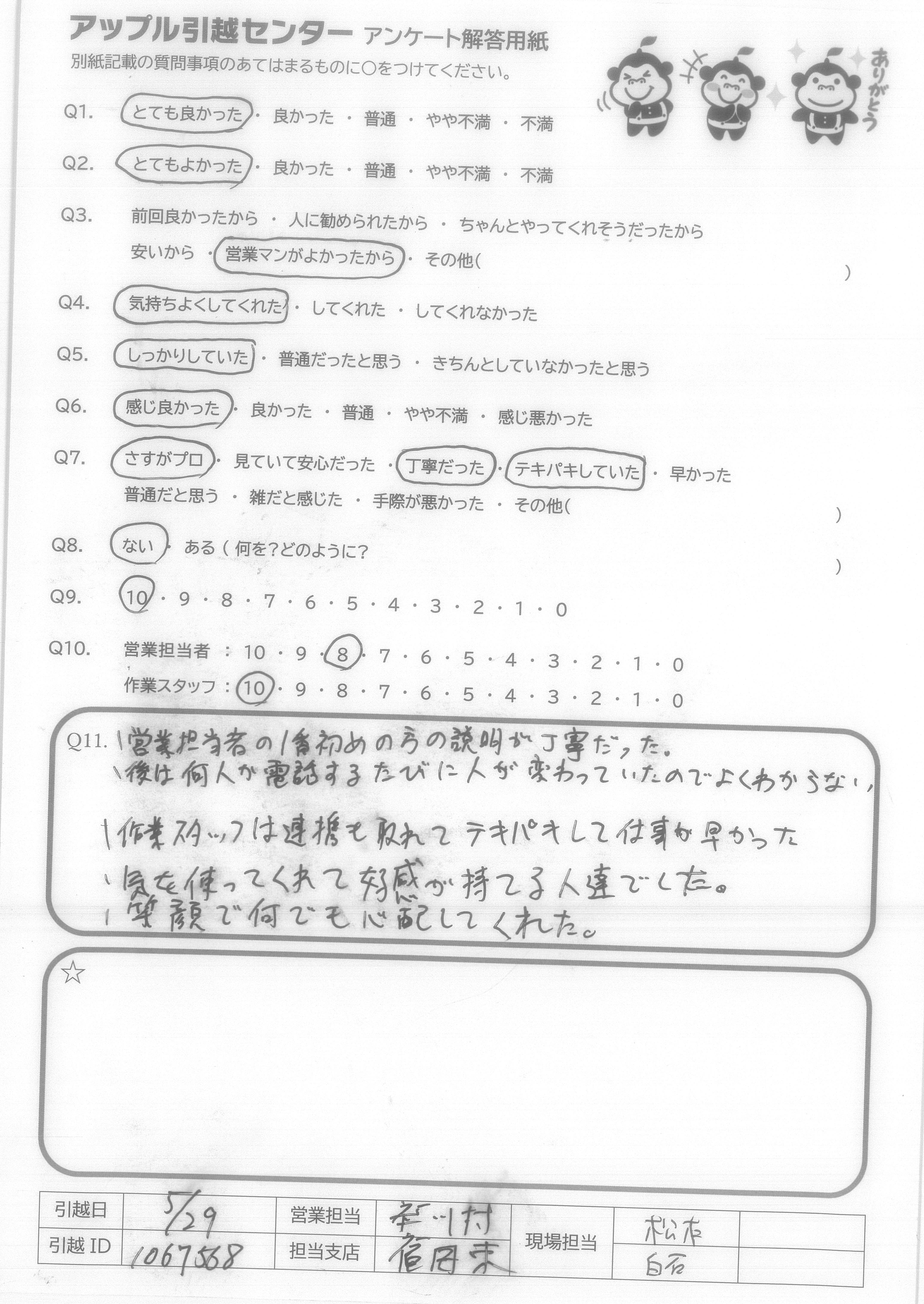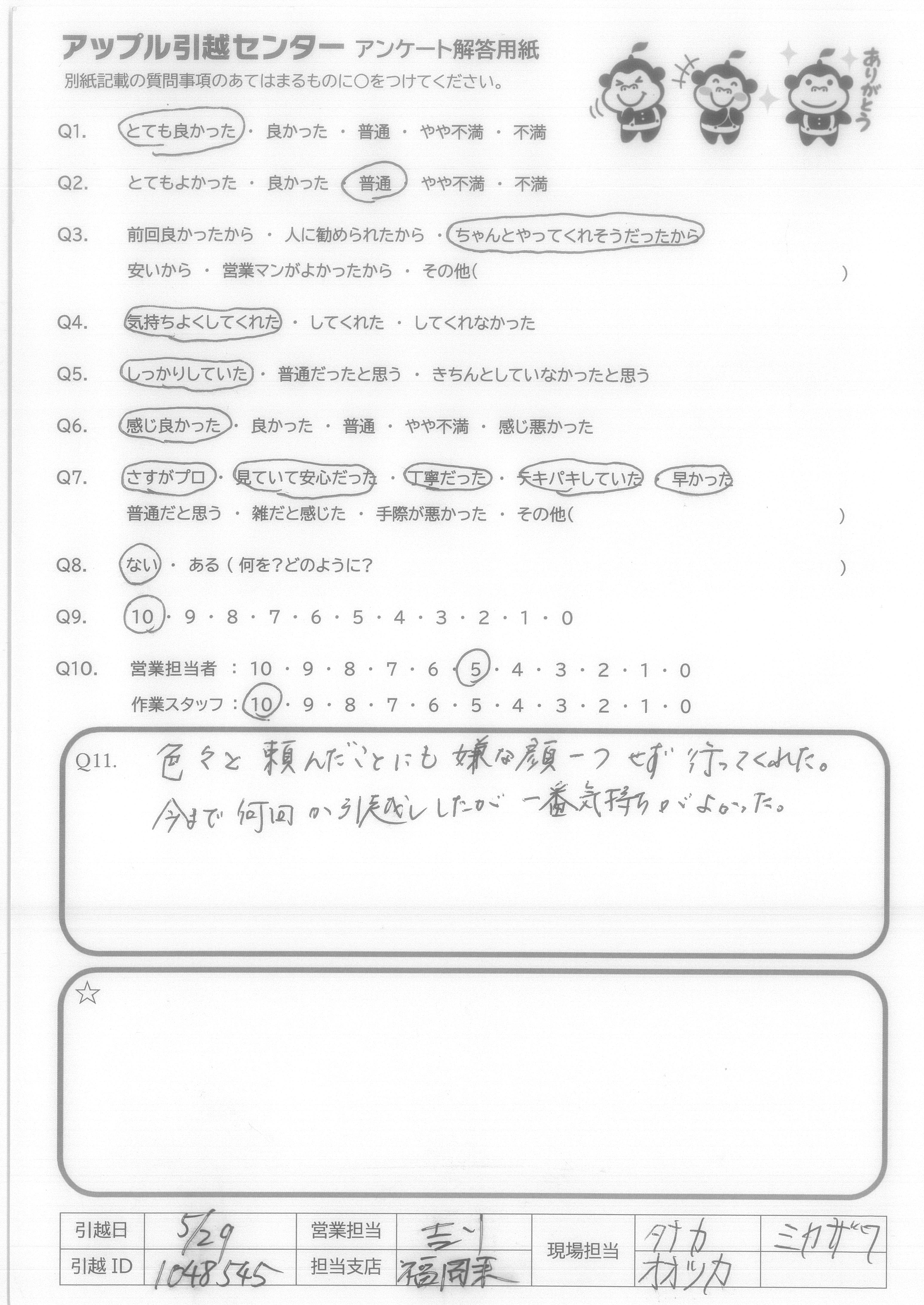 A.色々と頼んだことにも嫌な顔一つせず行ってくれた。 今まで何回か引越ししたが一番気持ちがよかった。