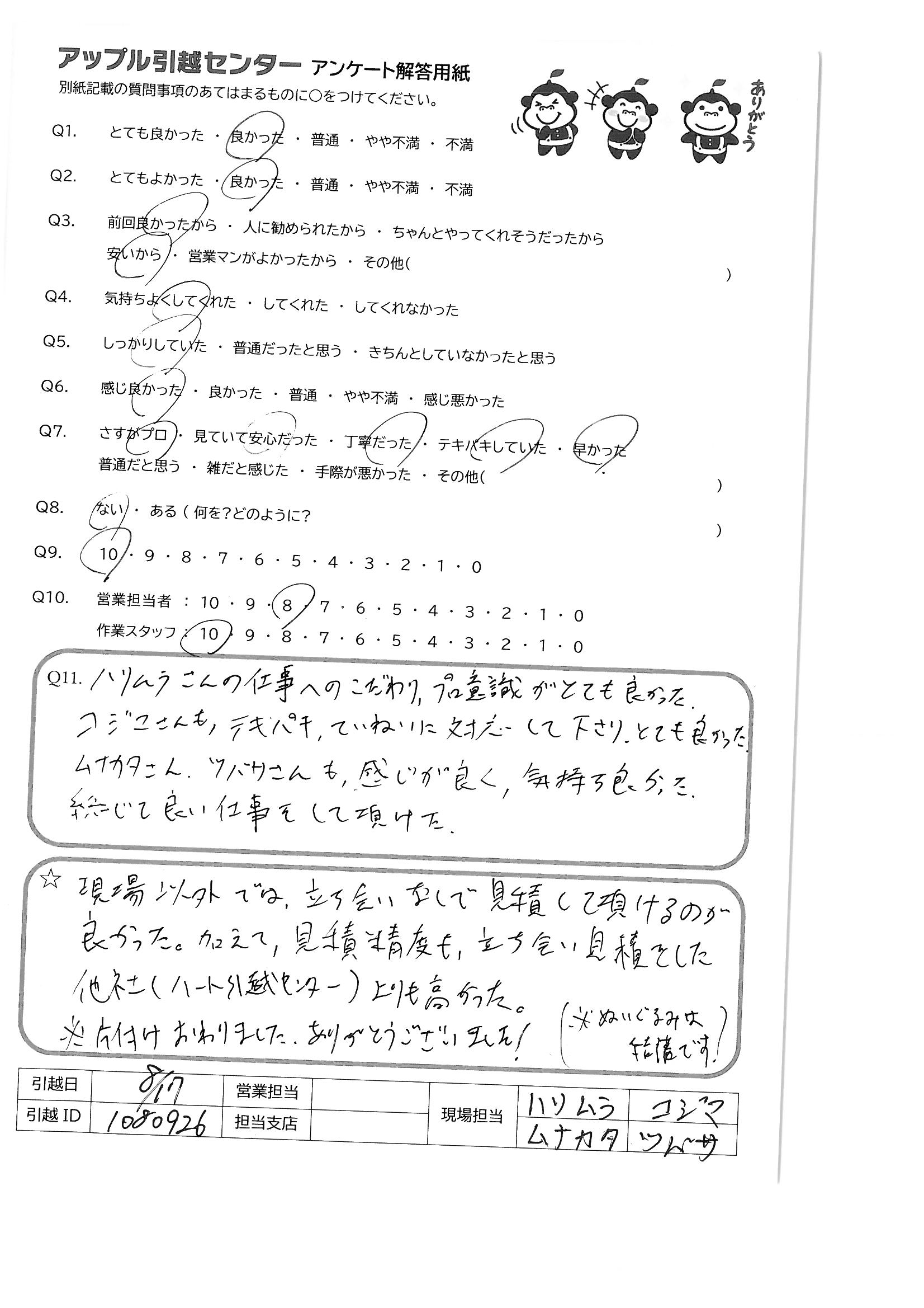 A.現場以外では、立ち合いなしで見積して頂けるのが良かった。加えて、見積精度も、立ち合い見積をした他社(ハート引越センター)よりも高かった。 ※片付けおわりました。ありがとうございました!(※ぬいぐるみは結構です。)