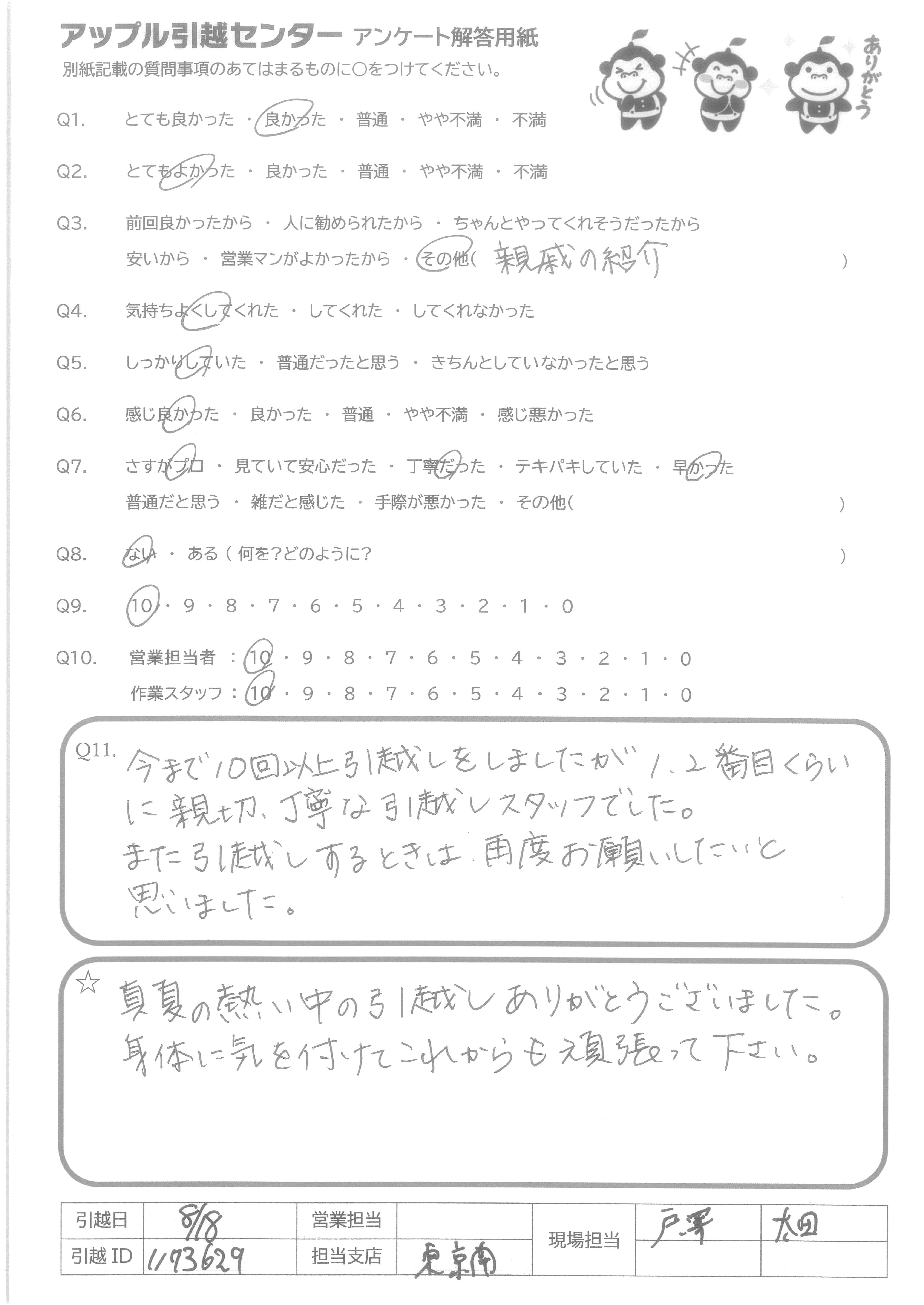 A.真夏の熱い中の引越しありがとうございました。。 身体に気をつけてこれからも頑張ってください。
