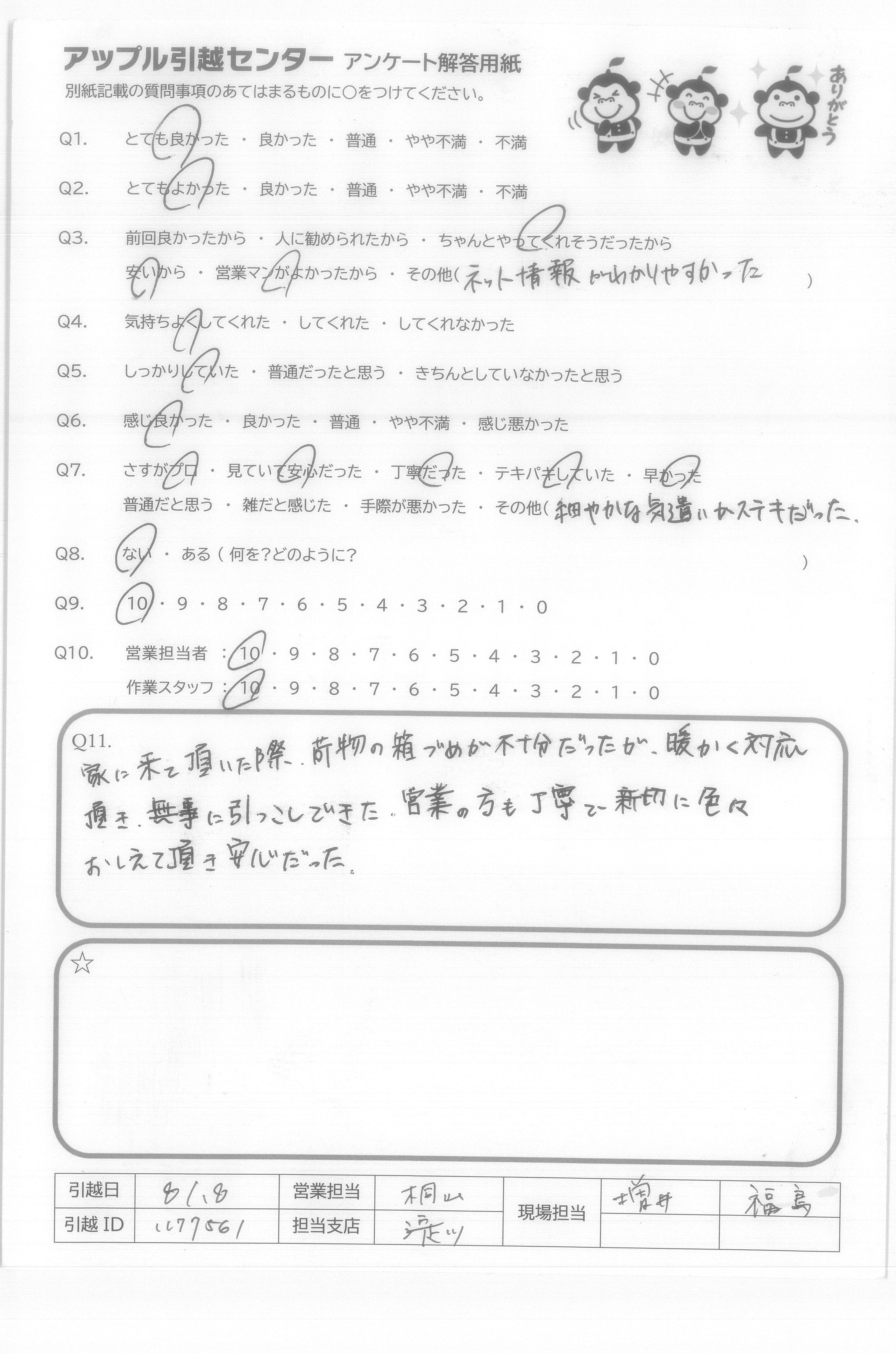 A.今まで10回以上引越しをしましたが、1,2番目くらいに親切、丁寧な引越しスタッフでした。 また引越しするときは、再度お願いしたいと思いました。