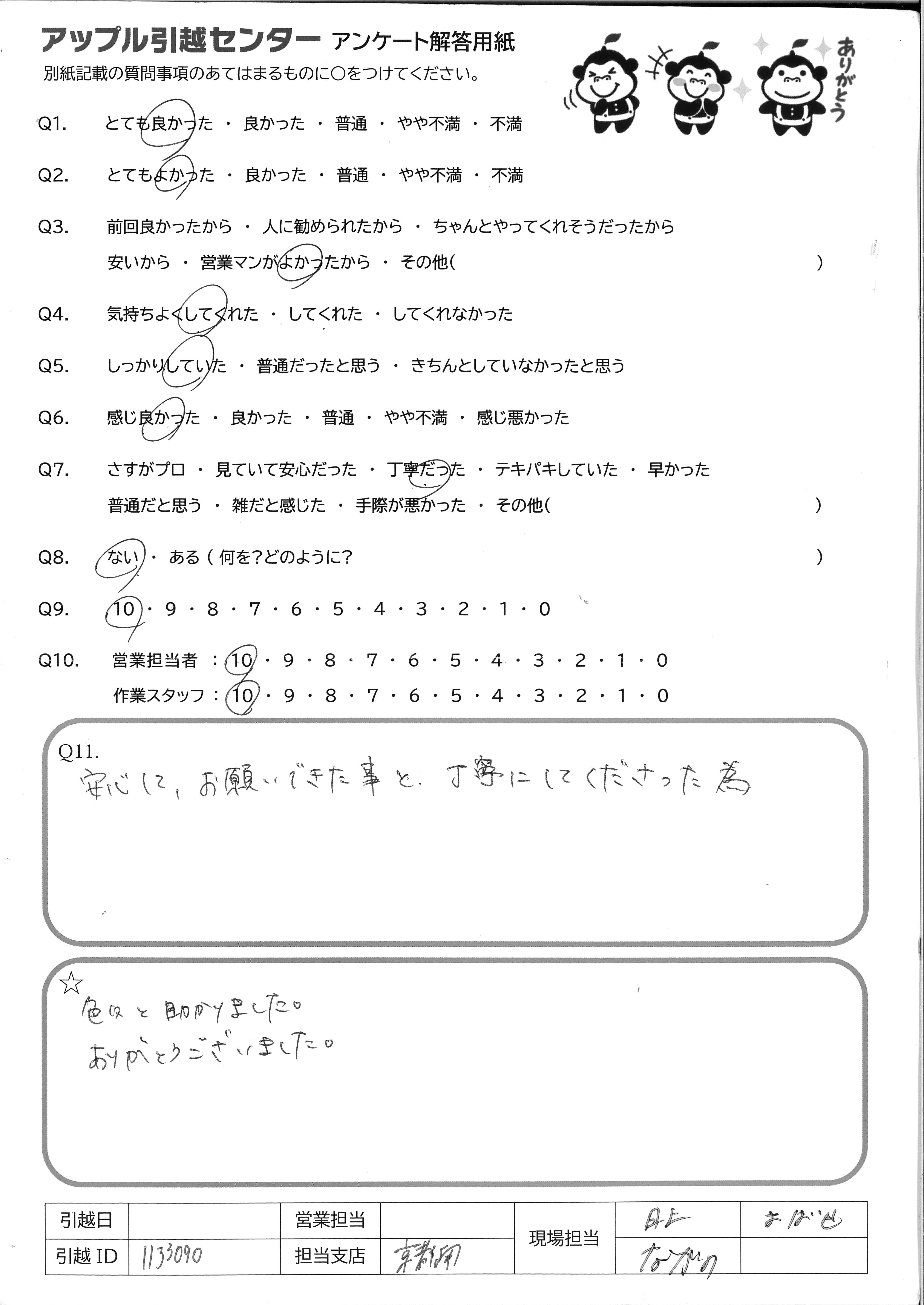 A.当日はありがとうございました。こちらの不手際で、事前に申し込んでいた内容とは違うことを相談してしまいましたがその場で臨機応変に対処して下さいました。 今回はネットの口コミで評判が良かったので、利用しました。また、お引越しの際は依頼させていただきます?♀️