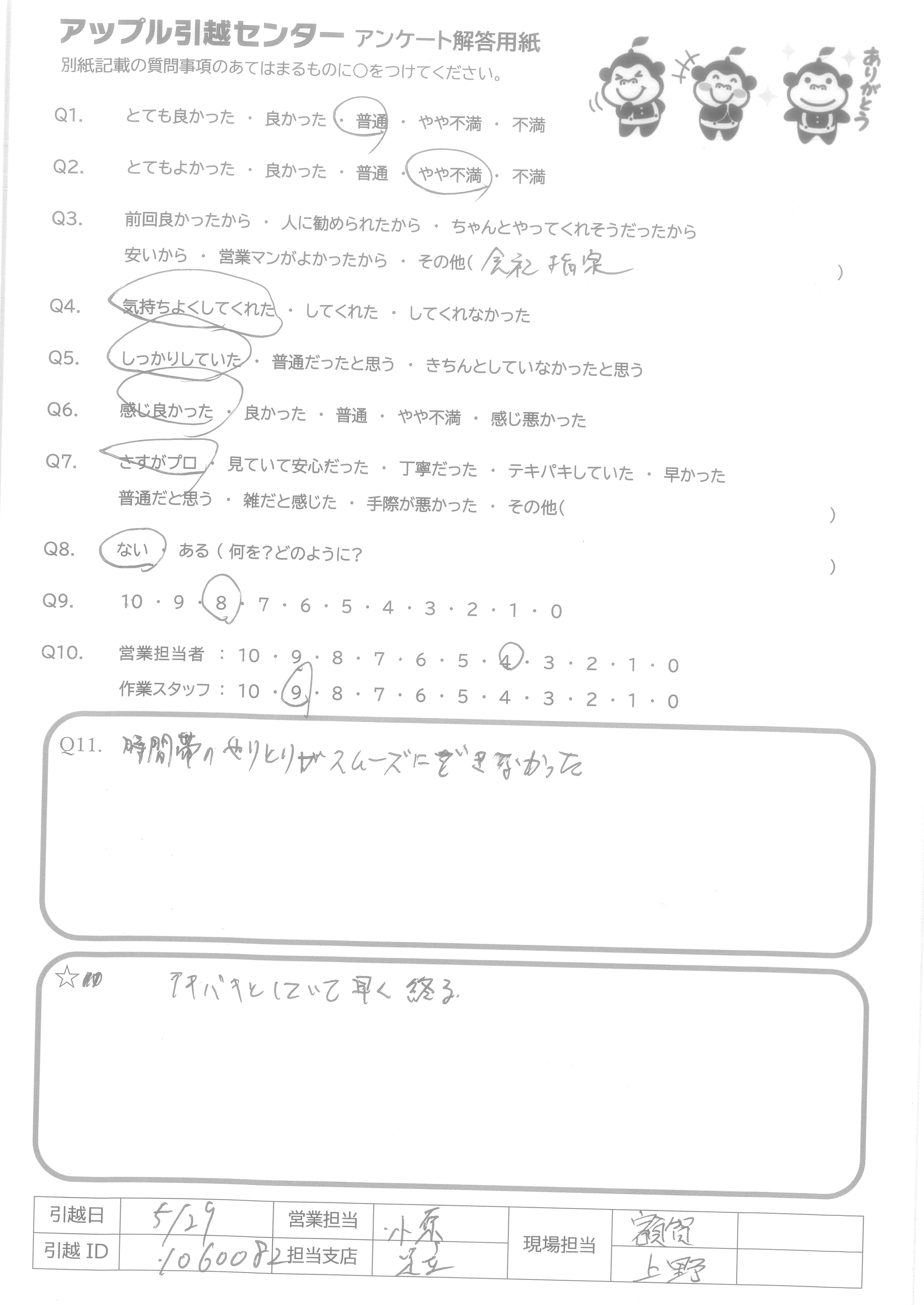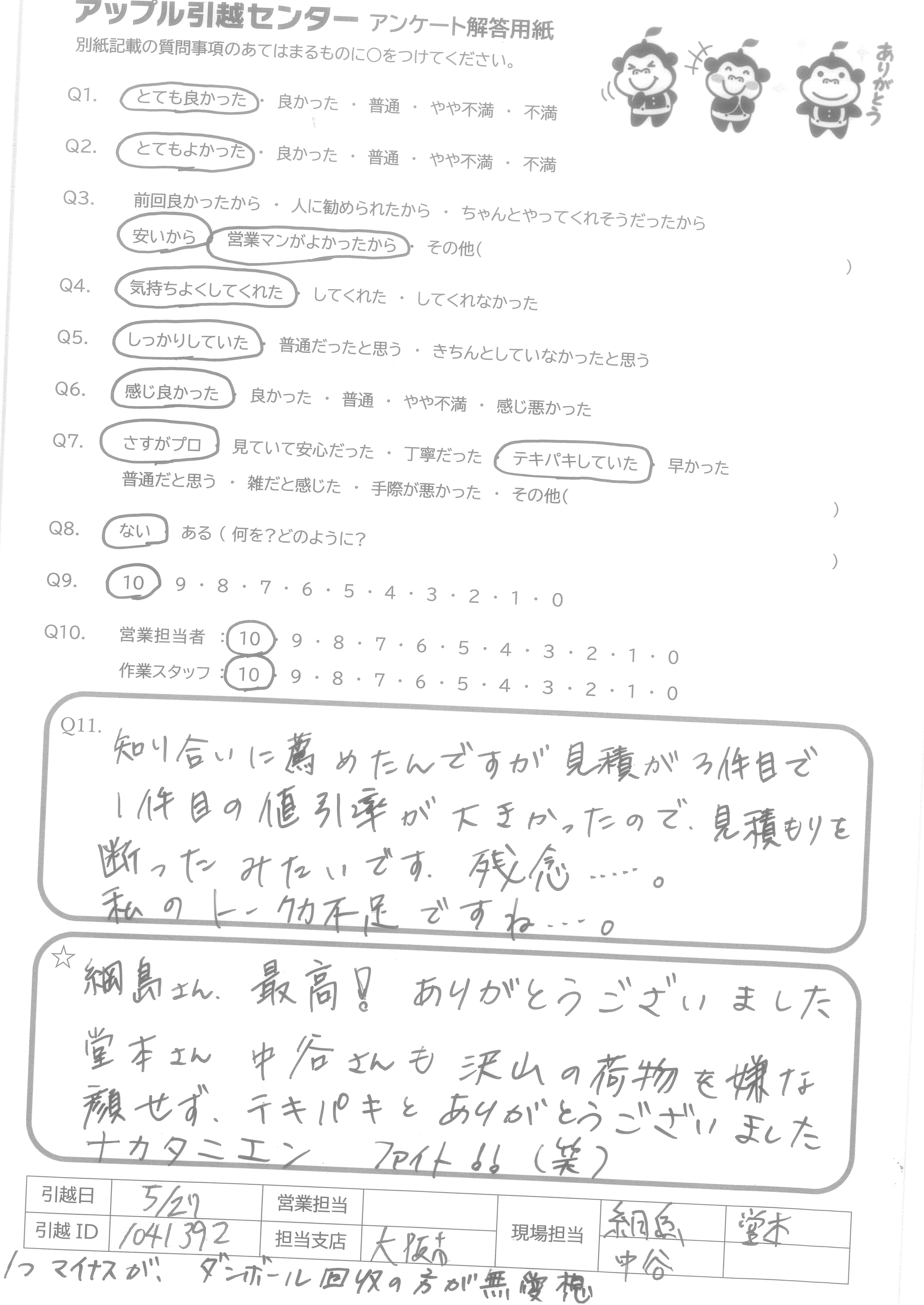 A.運びにくい形状の荷物を文句も言わずに運んでいただけたのはよかったのですが、遅い時間帯で疲れていたのか荷物の扱いがやや雑で家屋を傷つけそうな場面が見られたため。