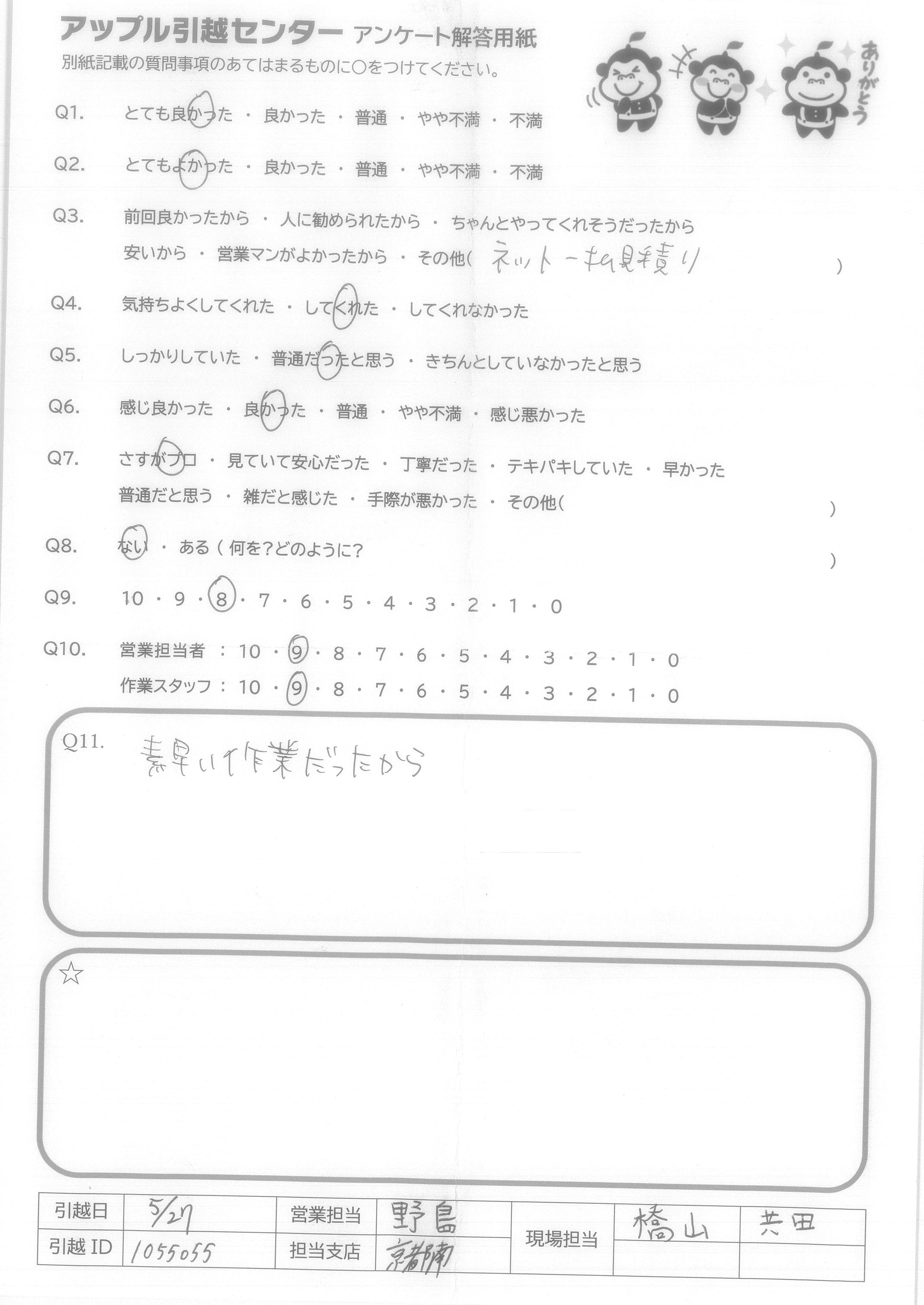 A.オンライン見積もりサービスも、本当にありがたく安心してお願いできました。多くのスタッフの方々にお世話になり、とても丁寧に対応いただきありがとうございました。