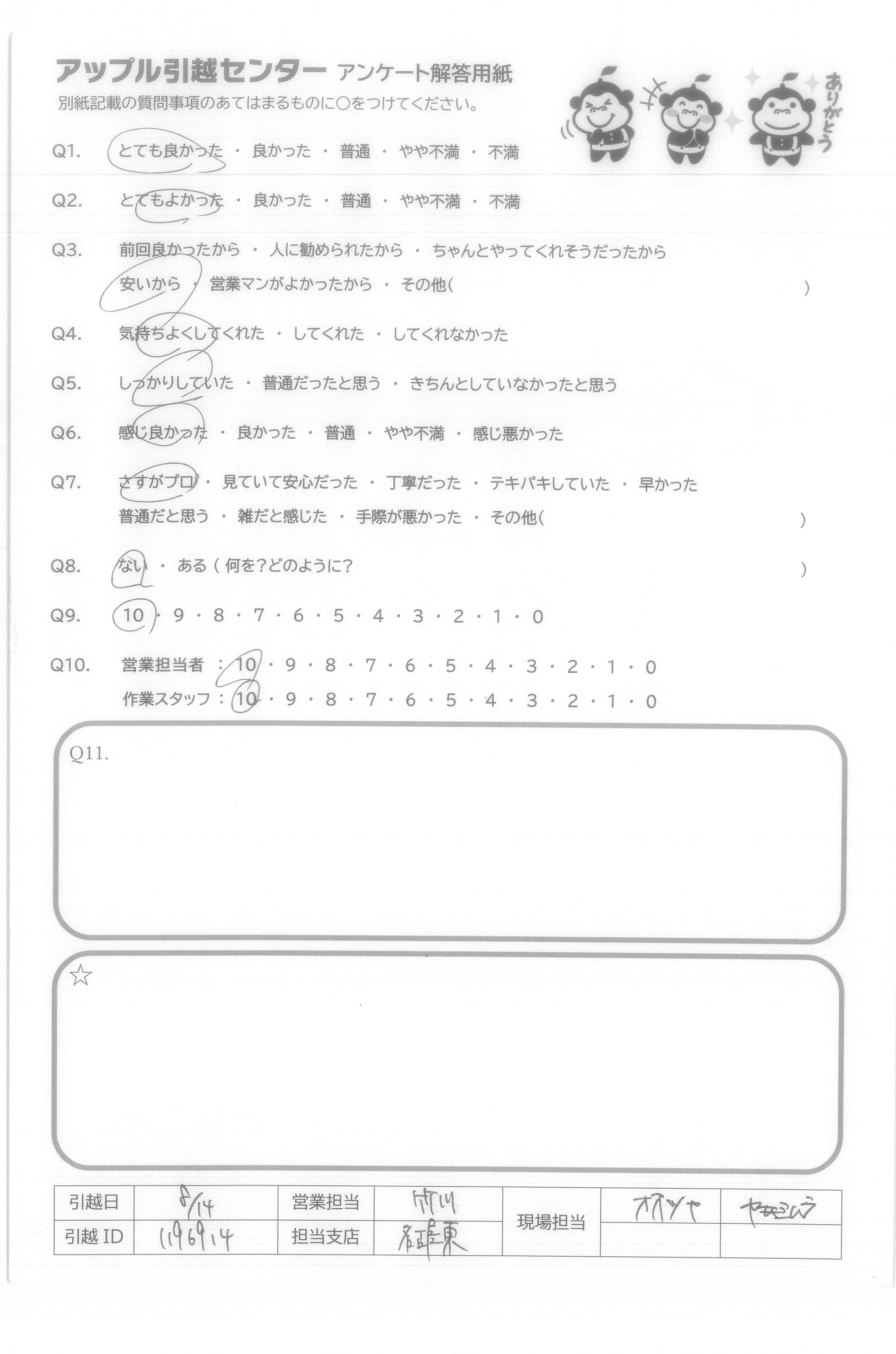A.3回目くらいの利用ですが、やはりアップルさんにお願いして良かったです。まず、他の引越業者にも見積もりしていただきましたが、アップルさんが1番安かったのと、電話の応対も良かったです。そして今回のスタッフさん2人も、とてもテキパキとスピーディーに運んでくださり、洗濯機の設置や家具の設置も丁寧にやってくれました。細かい心配りもしてくださいました。アップルさんは毎回若いスタッフさんですが、非常に安心してお任せでき、感謝しています。また引っ越す機会があればアップルさんにしますので、よろしくお願いいたします。