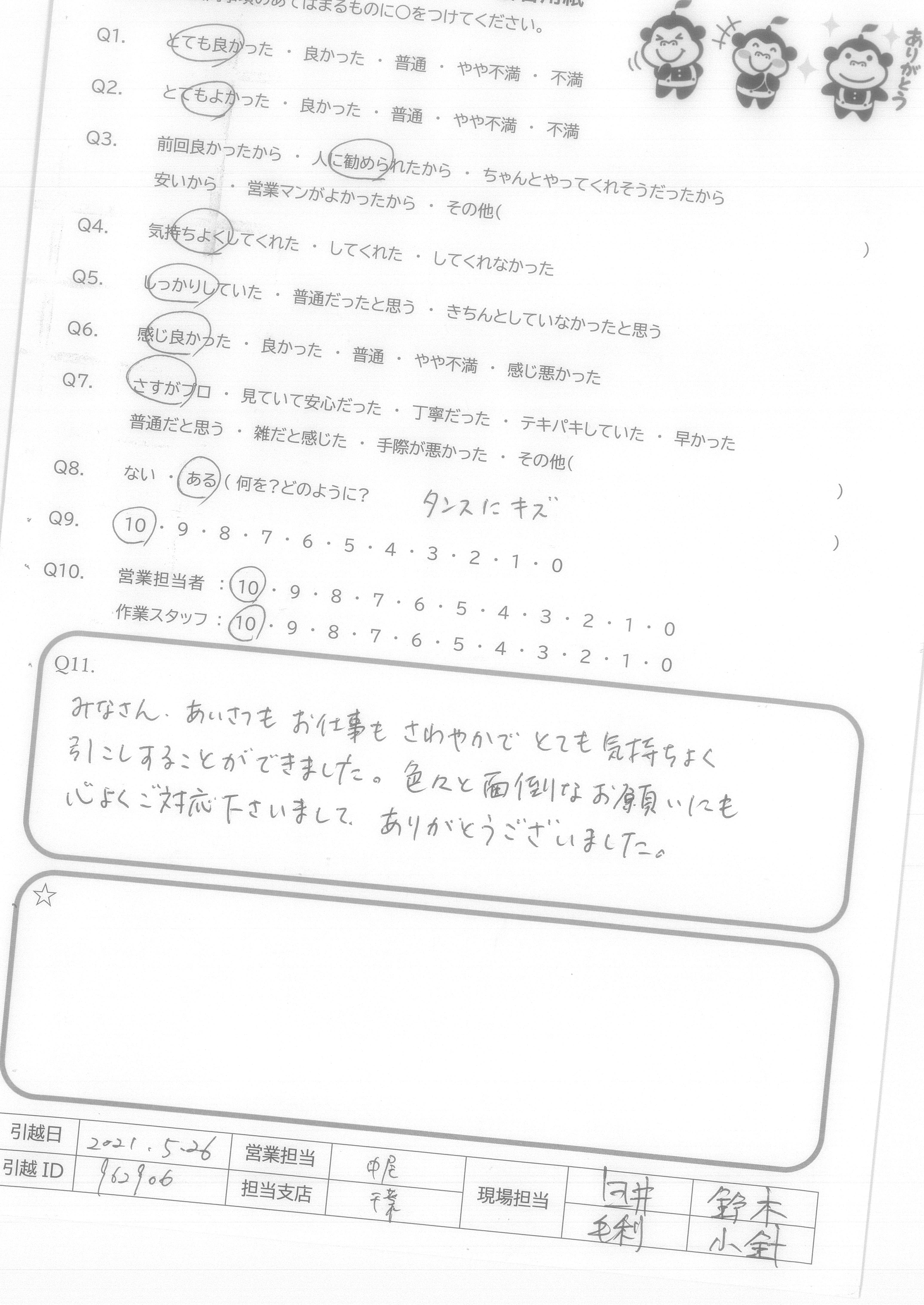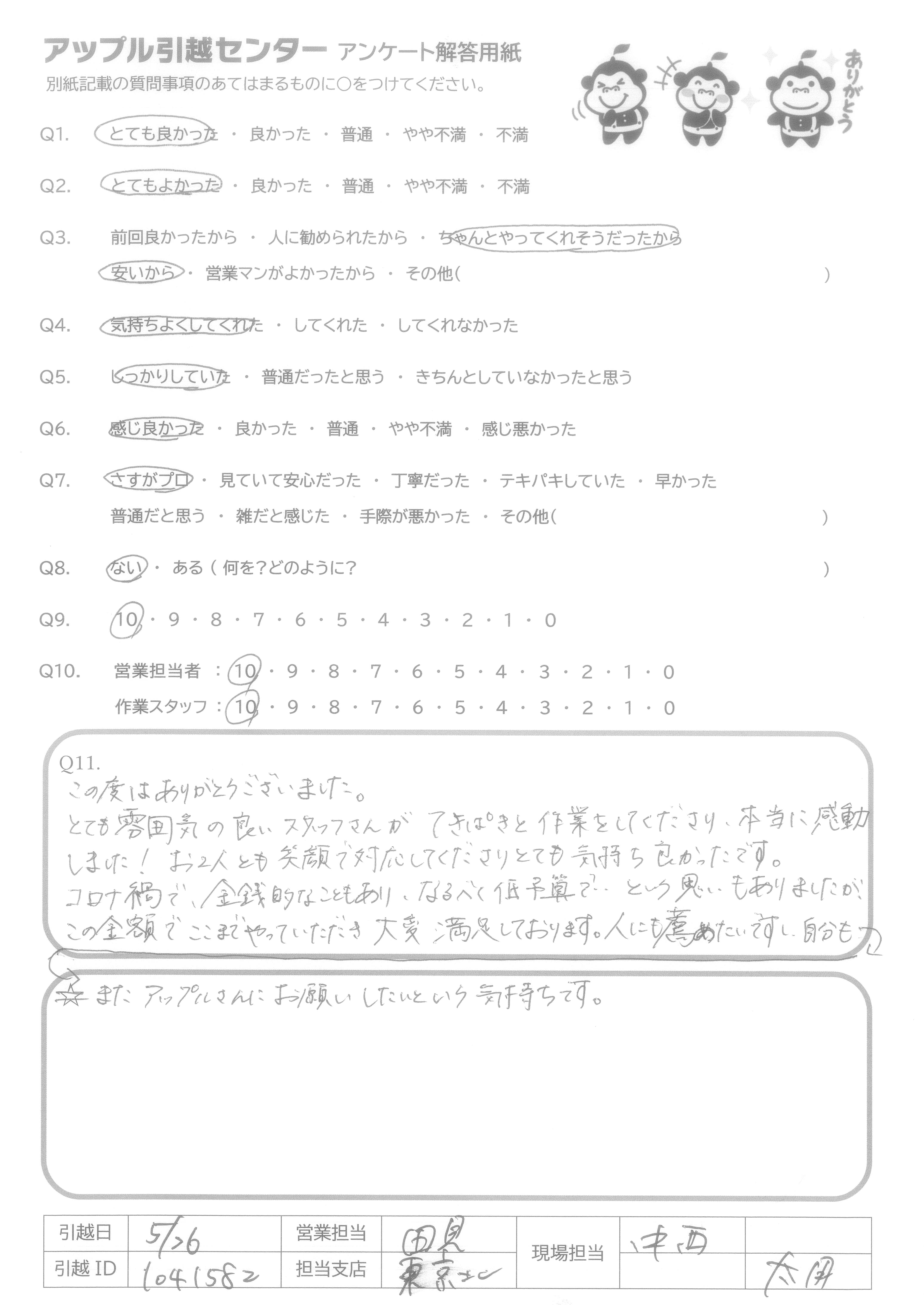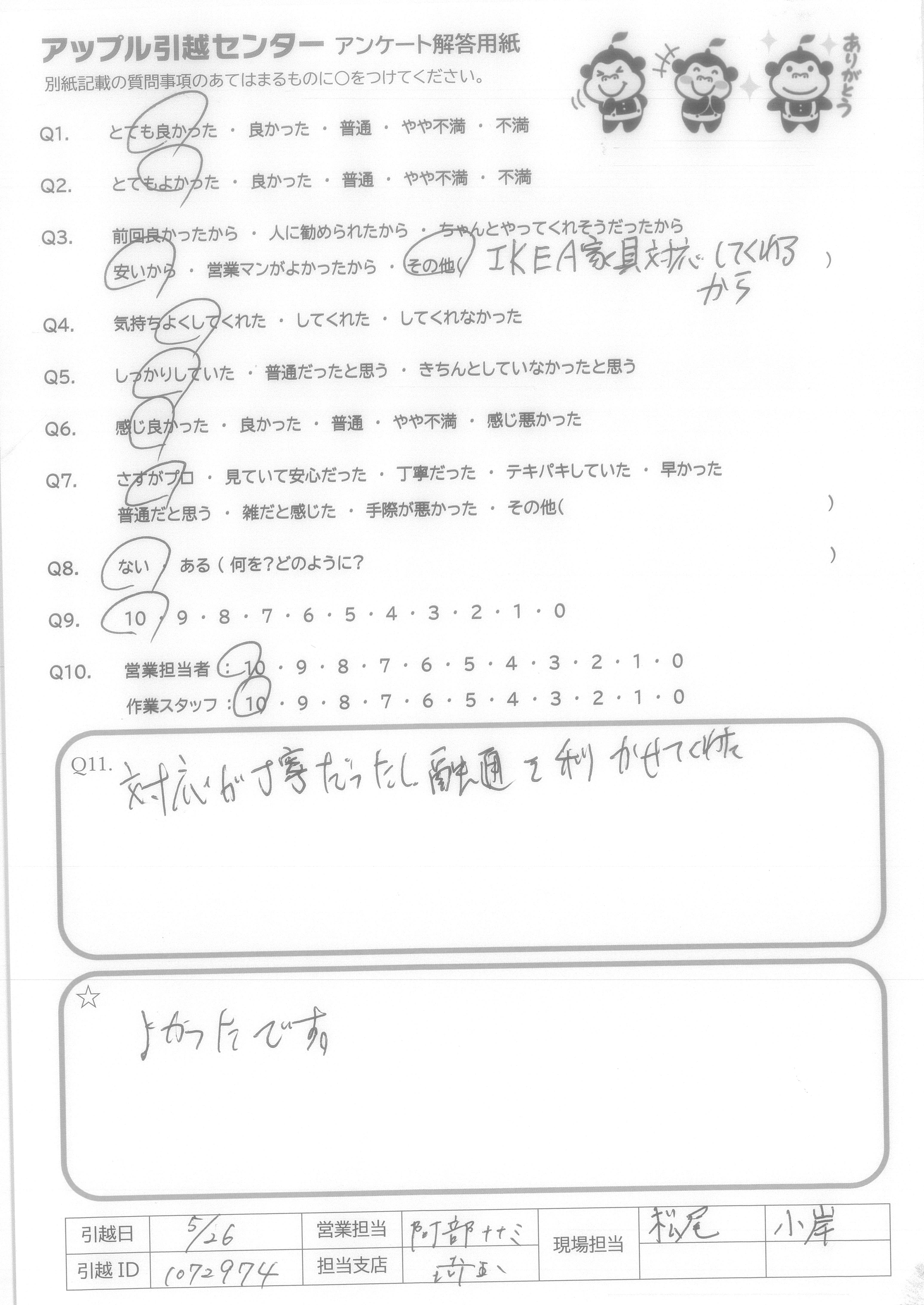 A.みなさん、あいさつもお仕事もさわやかでとても気持ちよく引こしすることができました。色々と面倒なお願いにも心よくご対応下さいまして、ありがとうございました。