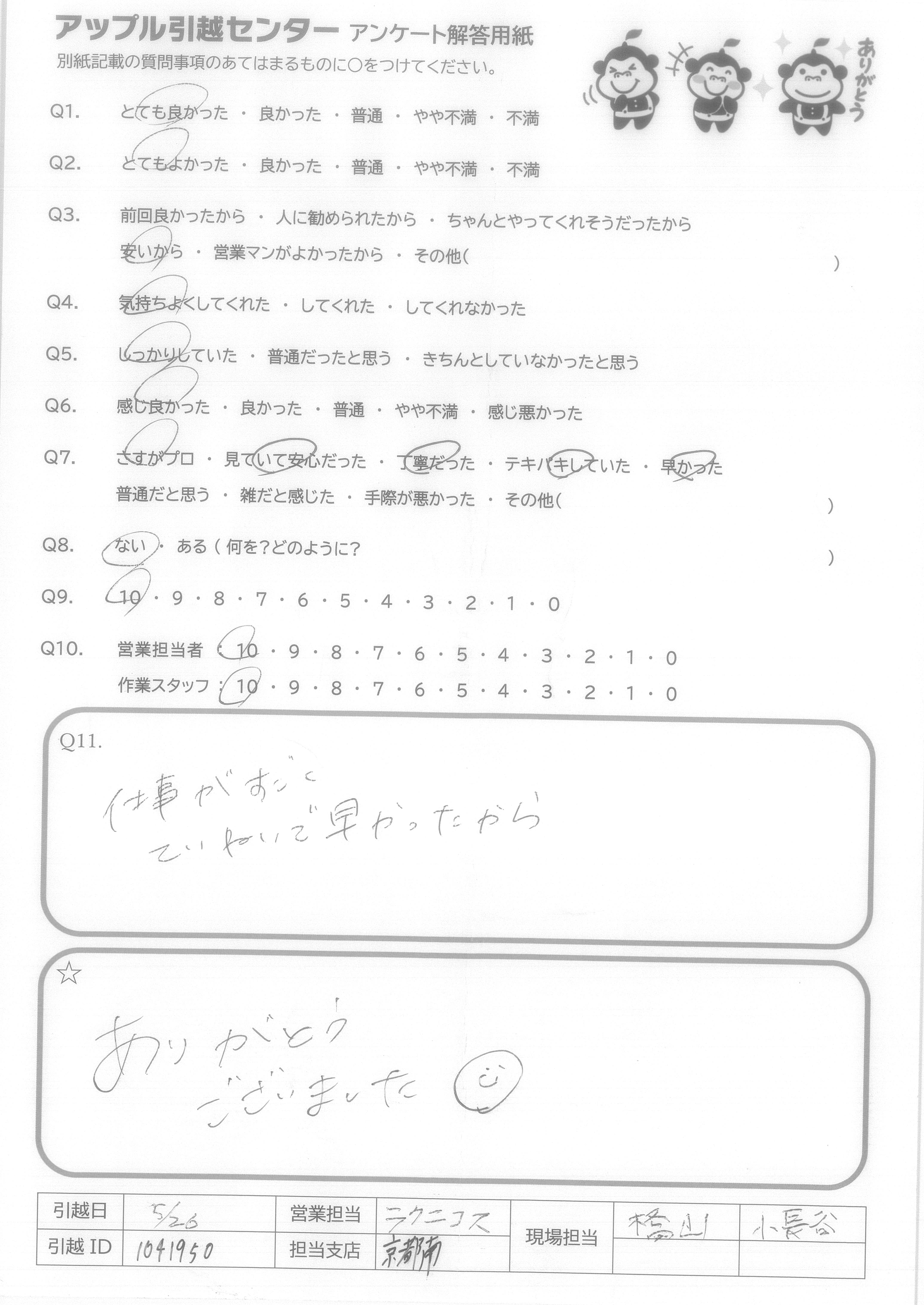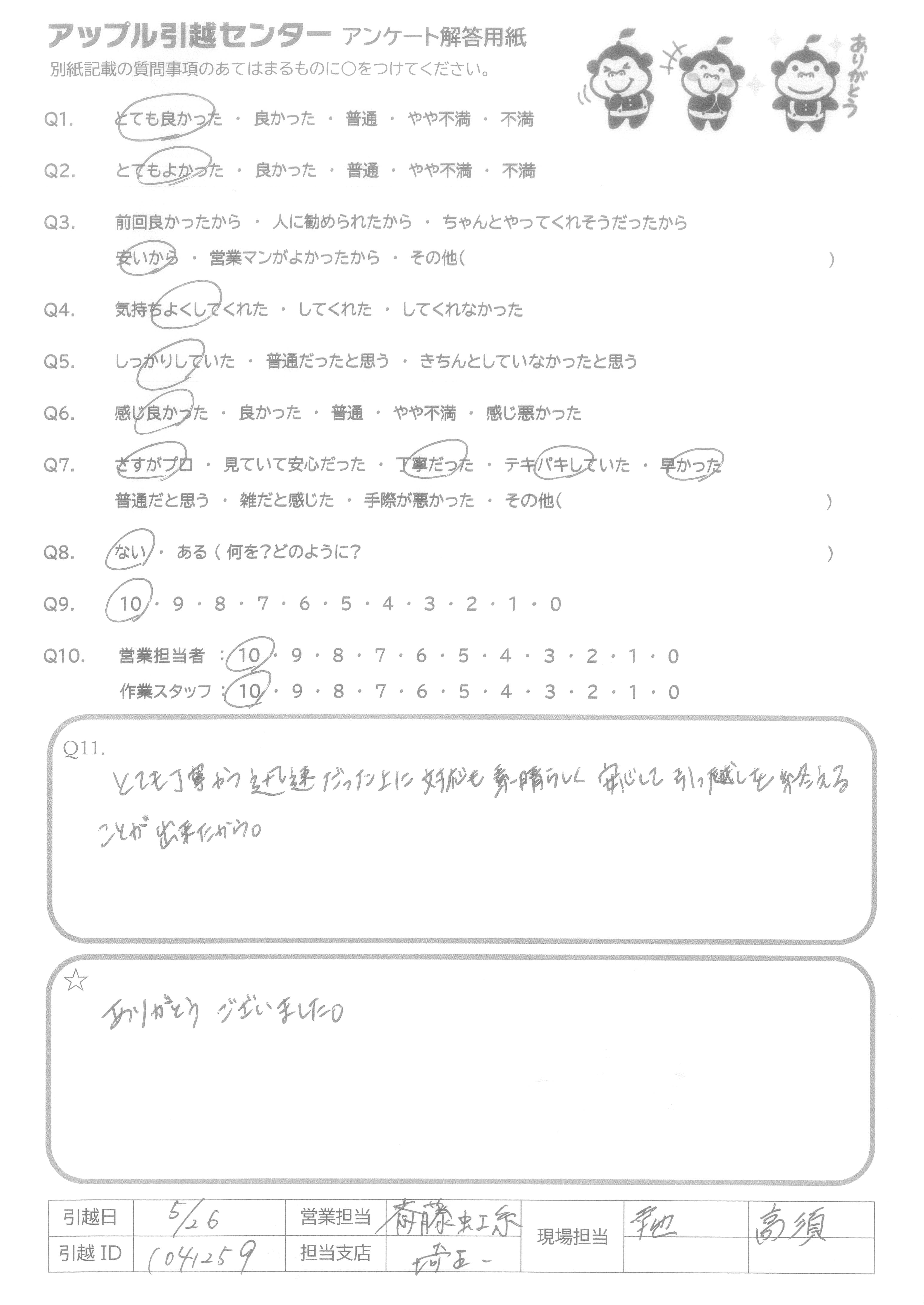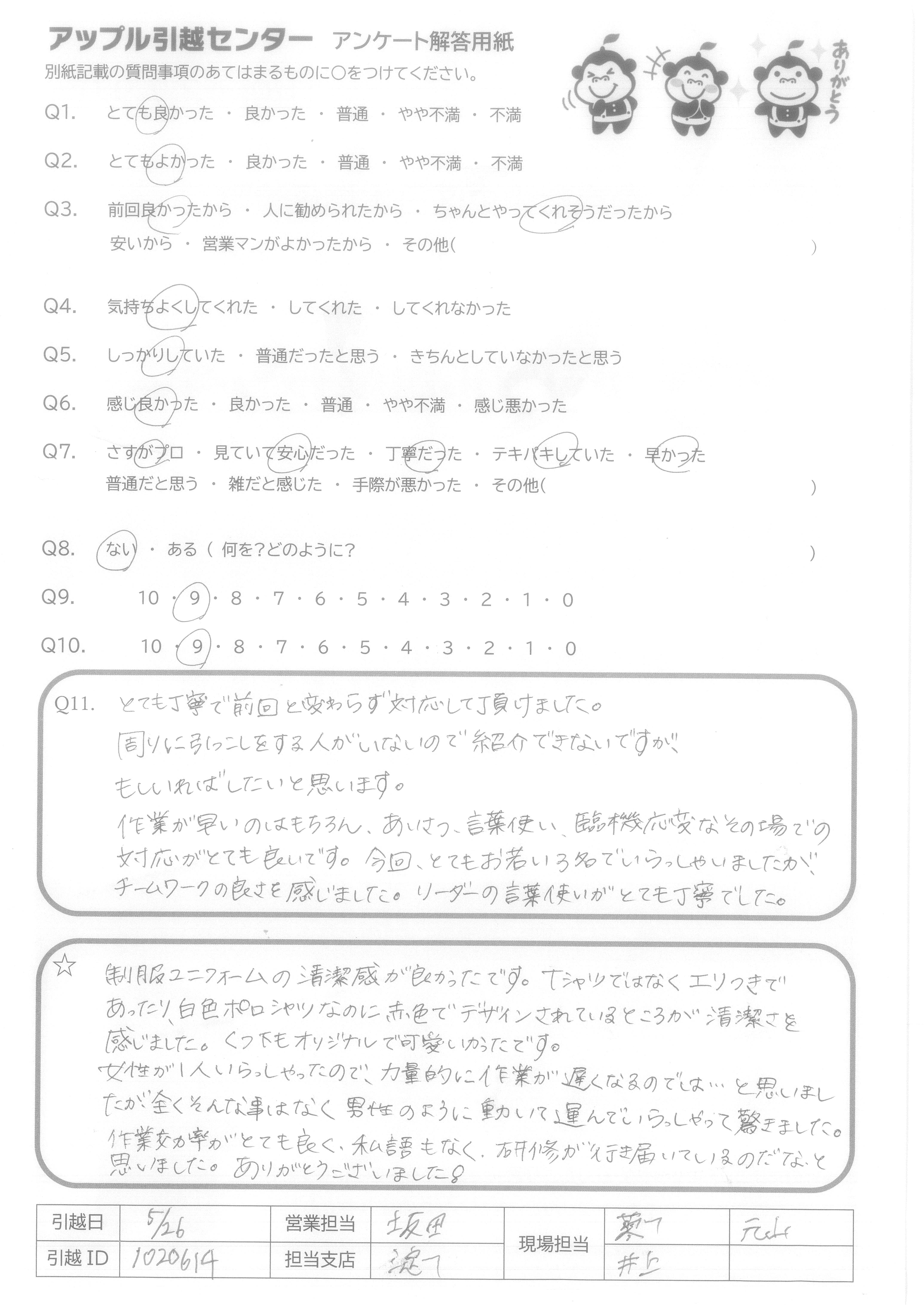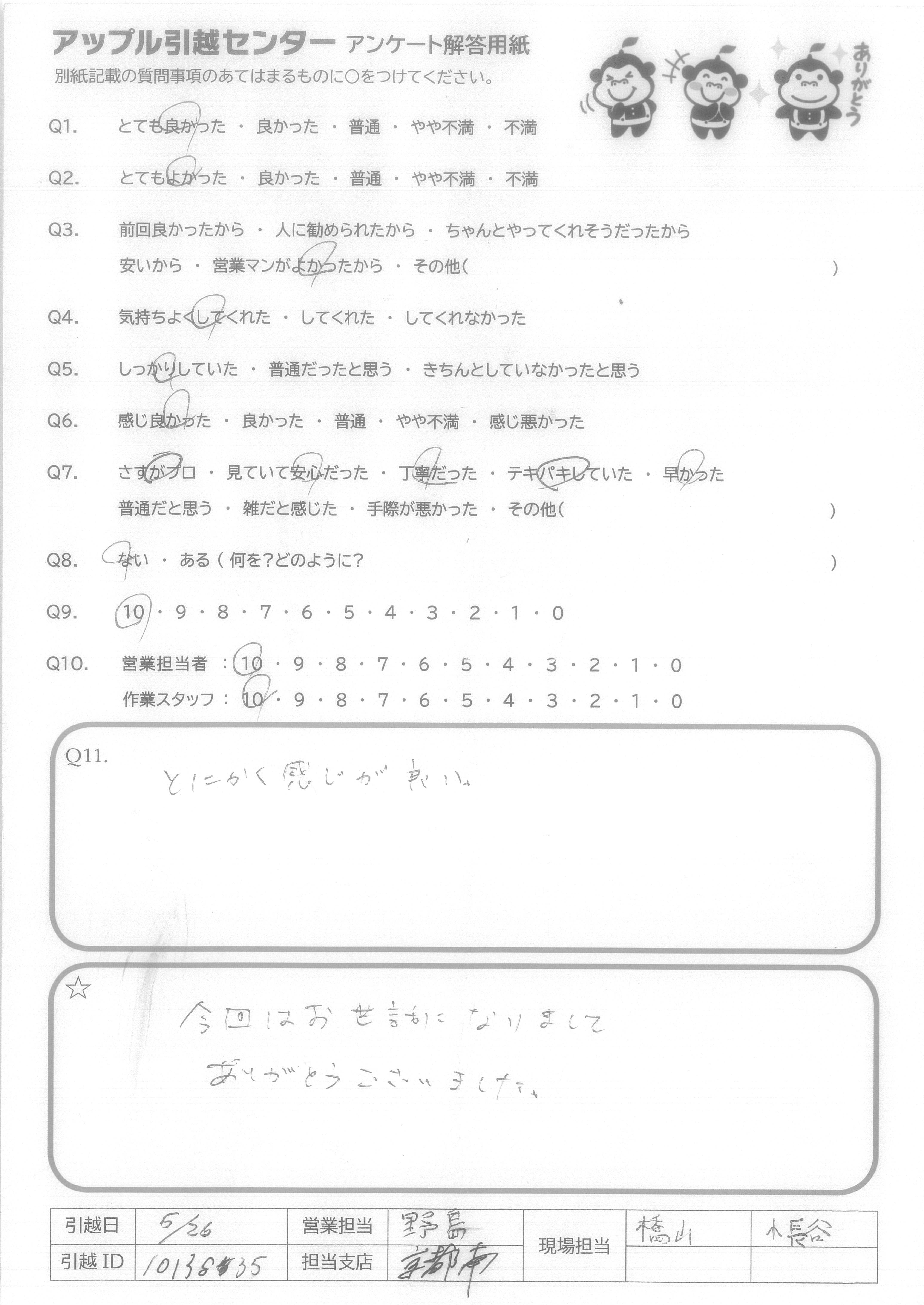A.みなさん、あいさつもお仕事もさわやかでとても気持ちよく引こしすることができました。色々と面倒なお願いにも心よくご対応下さいまして、ありがとうございました。