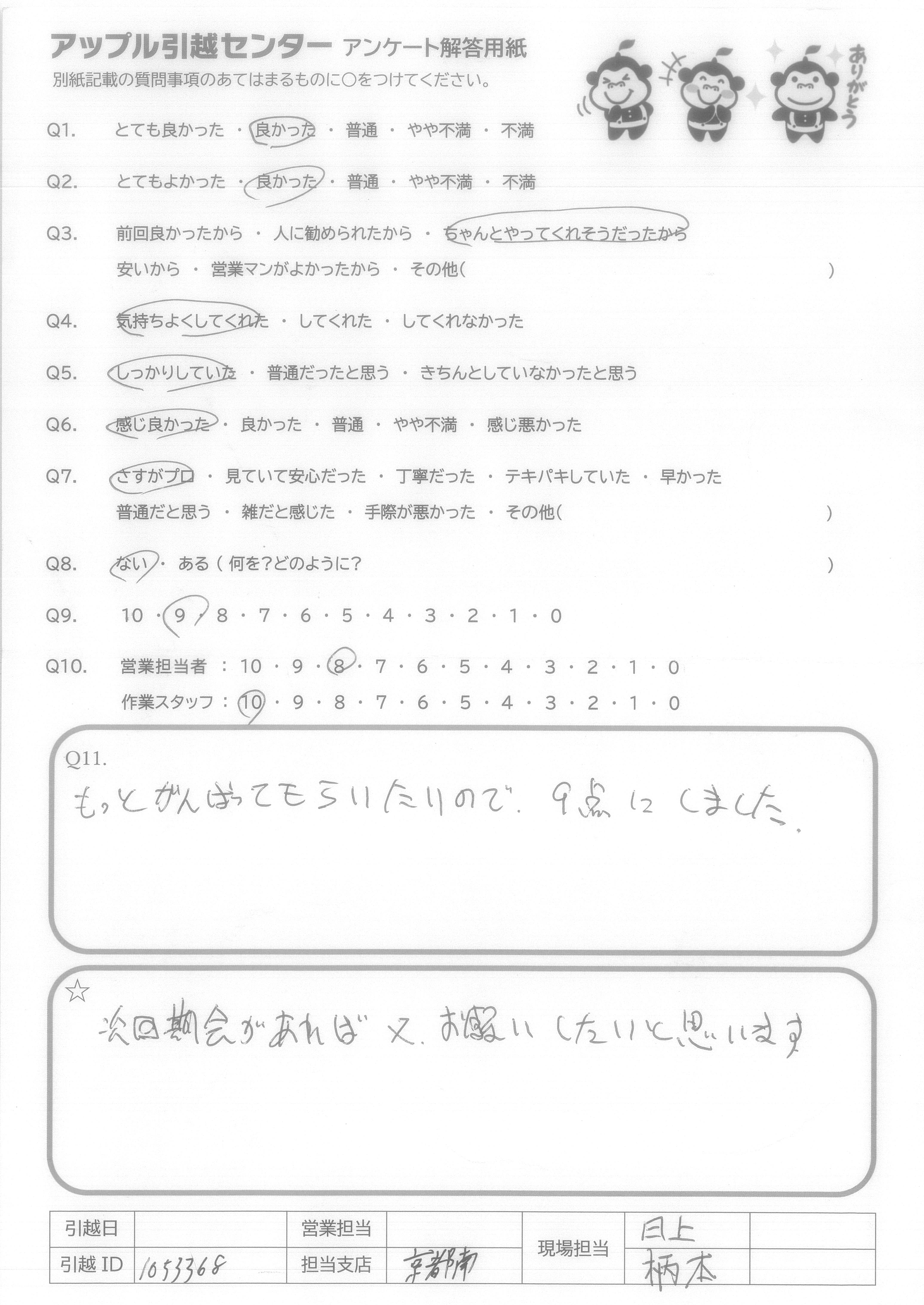 A.Q9 TEL対応から、作業スタッフさんとても感じが良かったですし、作業もすごく早くていねいでした。そして他社に比べて安い。 次もお願いしたいですし、引越しする方が周りにいたらオススメしたいです。 Q10 また、ぜひお願いします。