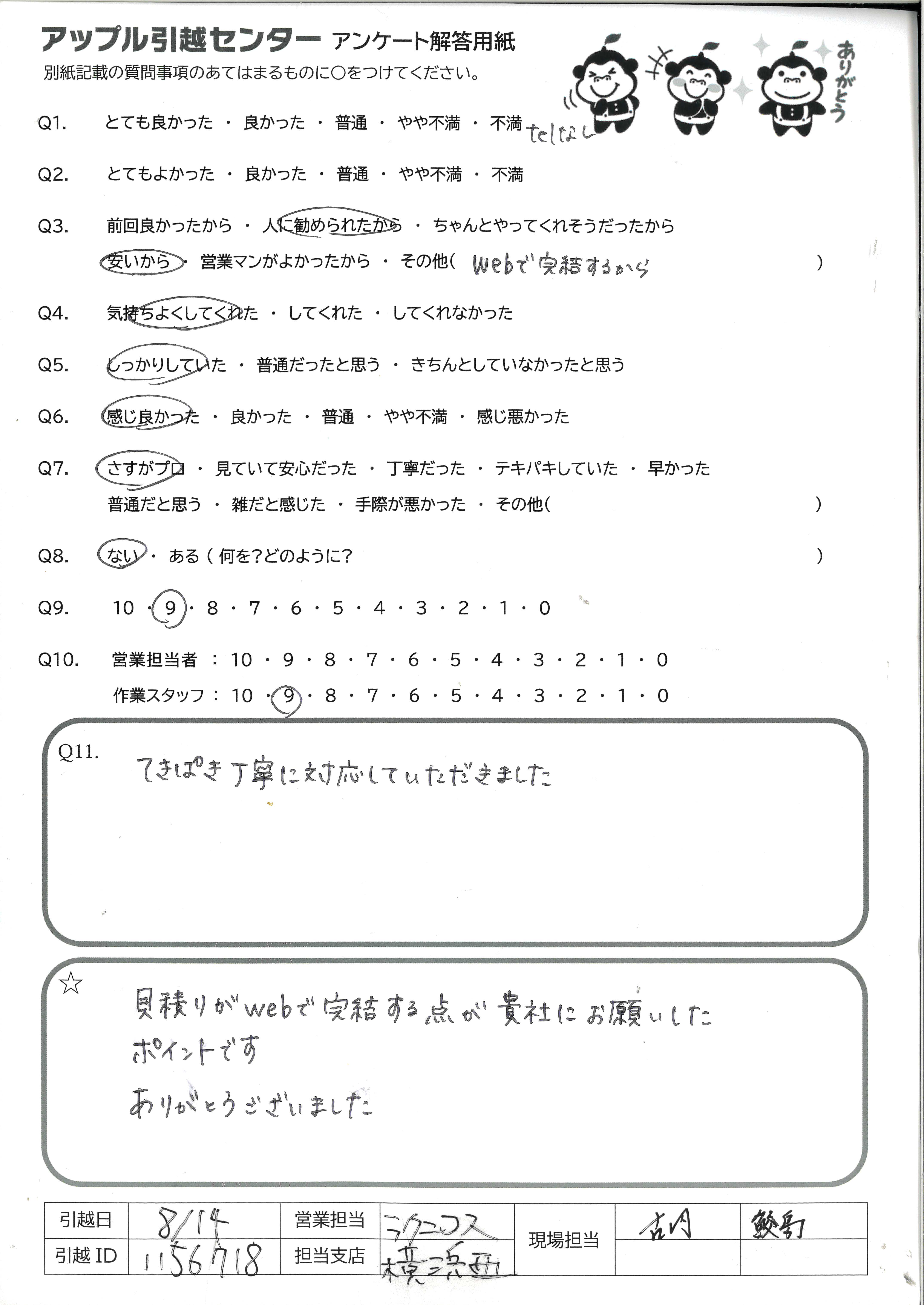 A.本当にありがとうございました! 次回の引越しも是非よろしくお願いします!