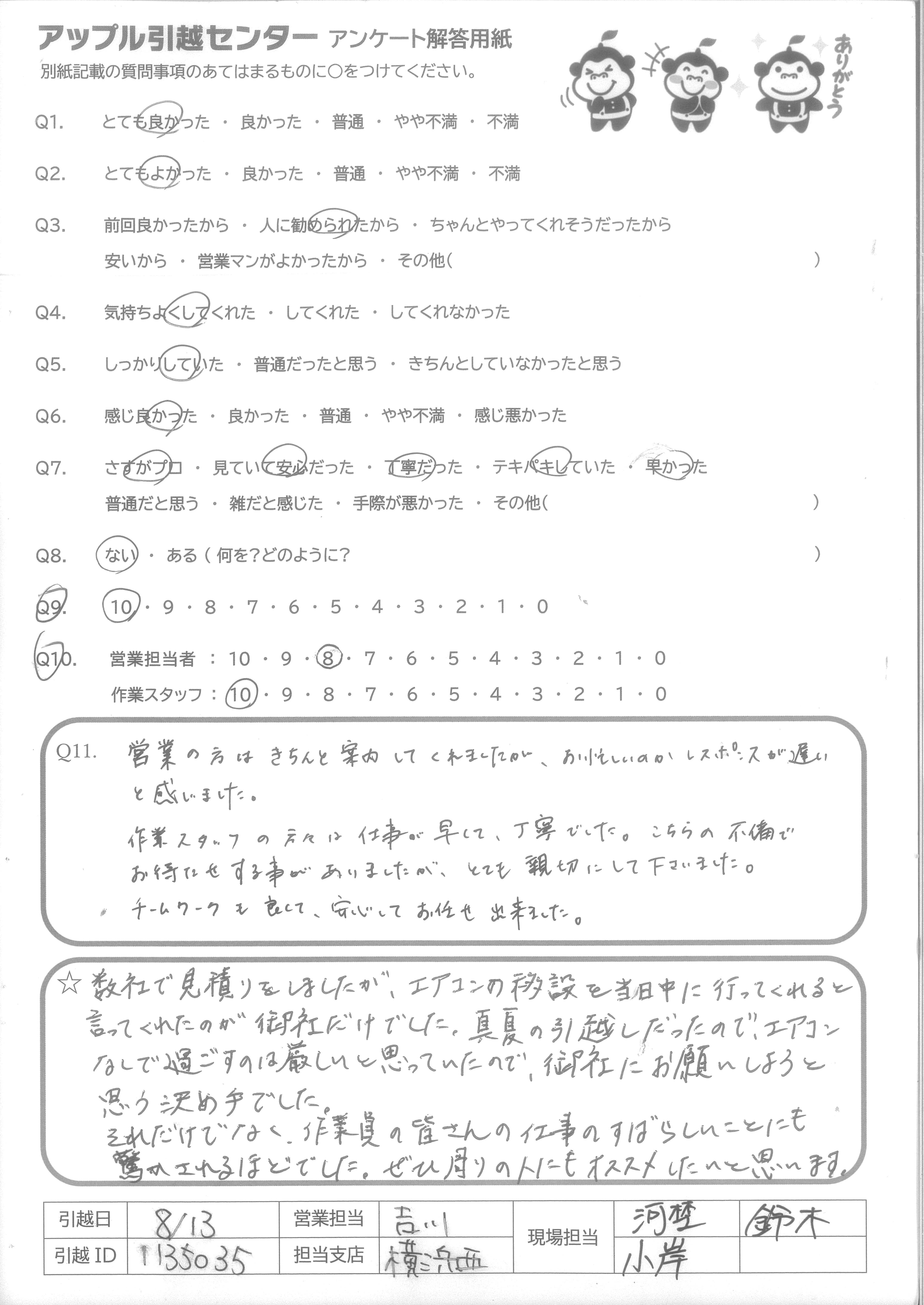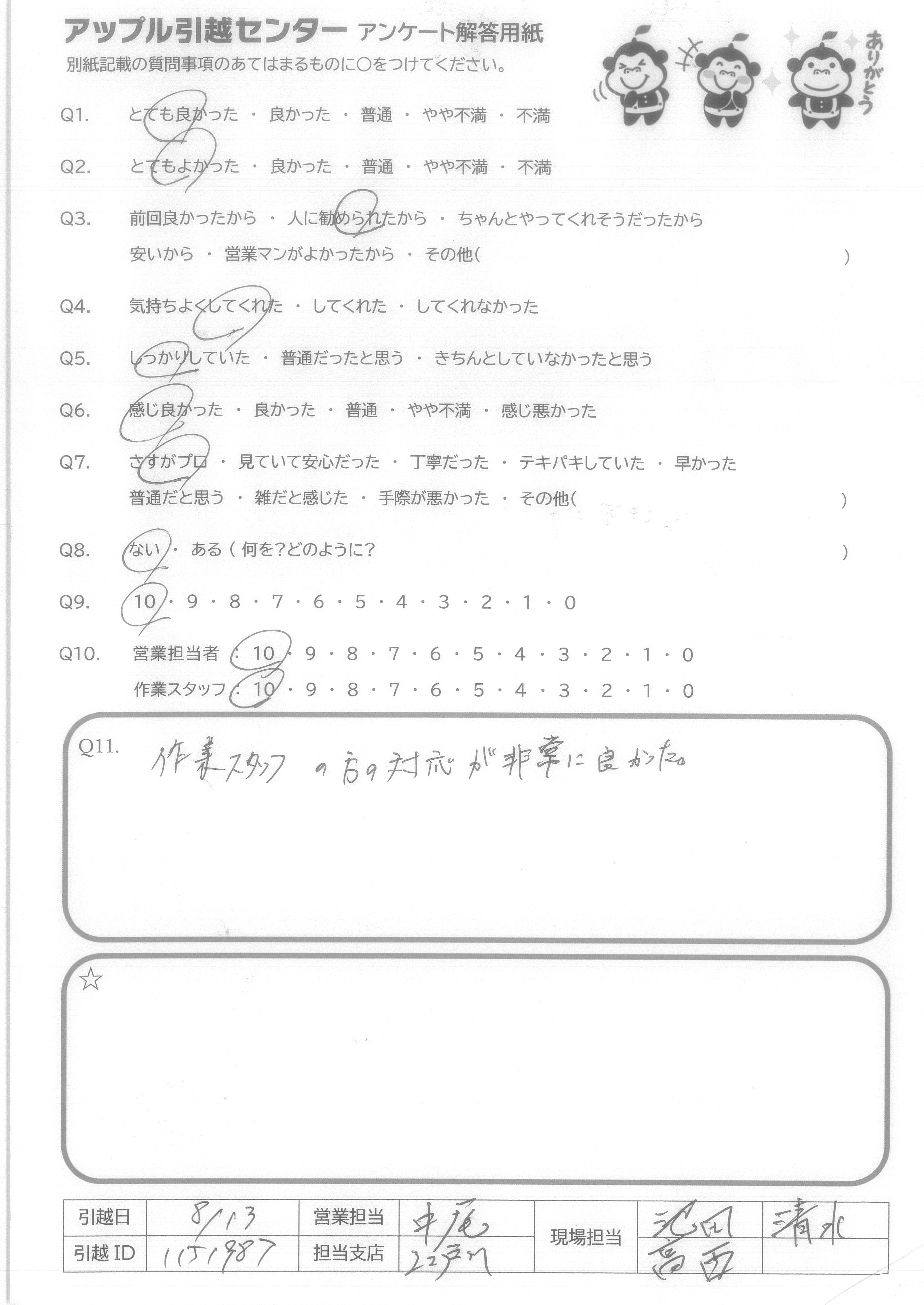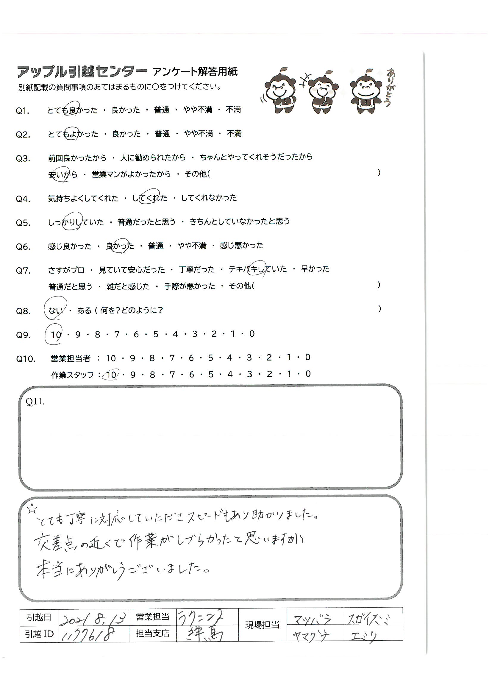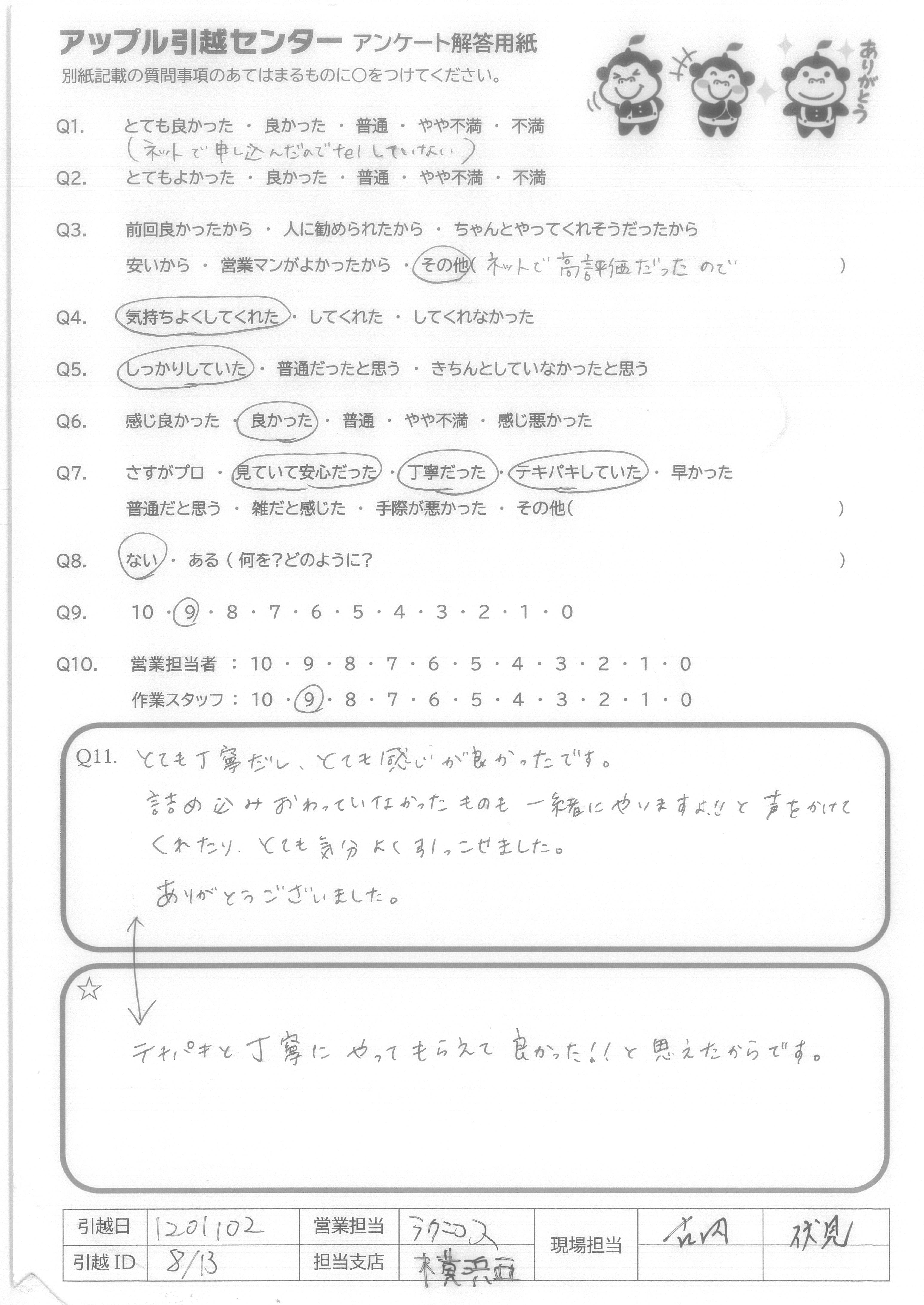 A.今回は暑い夏場の引っ越しであったにも関わらず、精力的にご対応いただき有難う御座いました。引っ越しの作業はもちろんですが、マイページの構成や引っ越し前の準備に関するフォローも充実しており、久々の引っ越しでしたが安心することができました。 また機会がありましたら利用させていただきたいと思います!