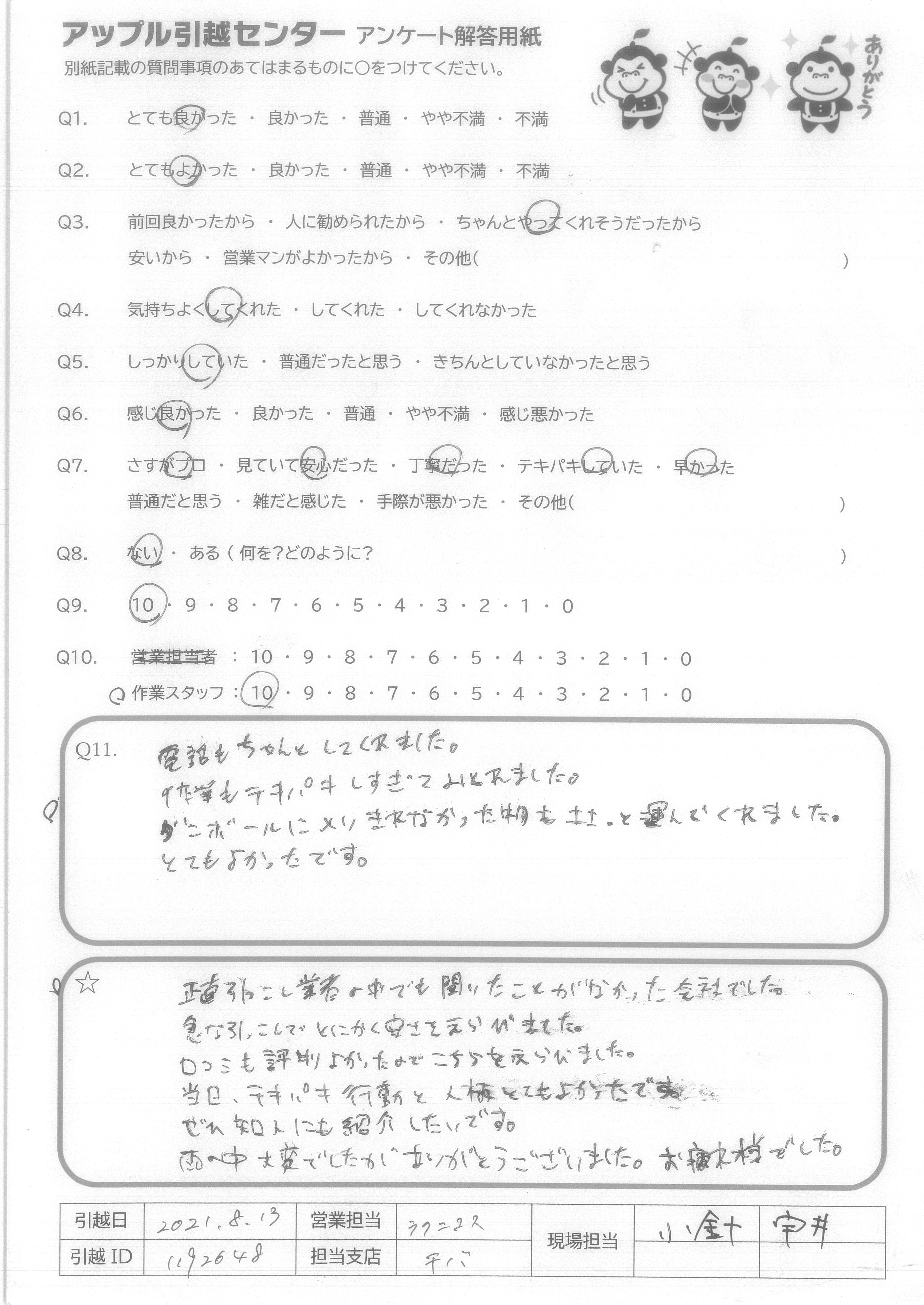引越し日:2021年08月13日 エリア:千葉県市川市