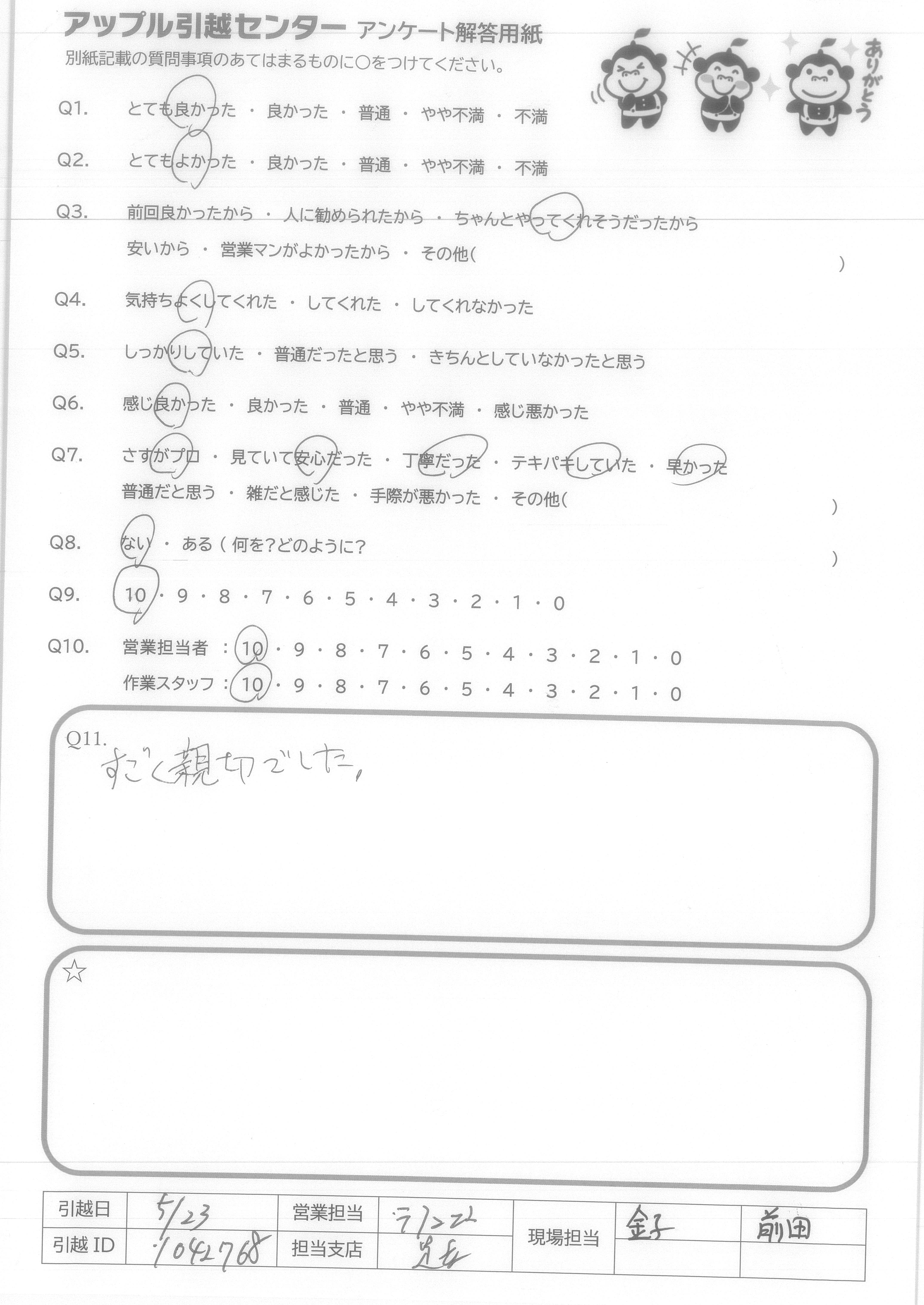 A.初めての業者さんにお願いした引っ越しだったため、いろいろ勝手がわからず、当日作業を担当してくれた方にもご迷惑をおかけしたと思いますが、 笑顔で対応して頂き、作業も凄く早くとても助かりました。 実のところ、料金の安さが一番の決め手でしたが、それよりも対応して頂いた方の感じの良さが一番印象に残る引っ越しになりました。 おかげで新たな生活をスムーズに始められそうです。本当にありがとうございました。