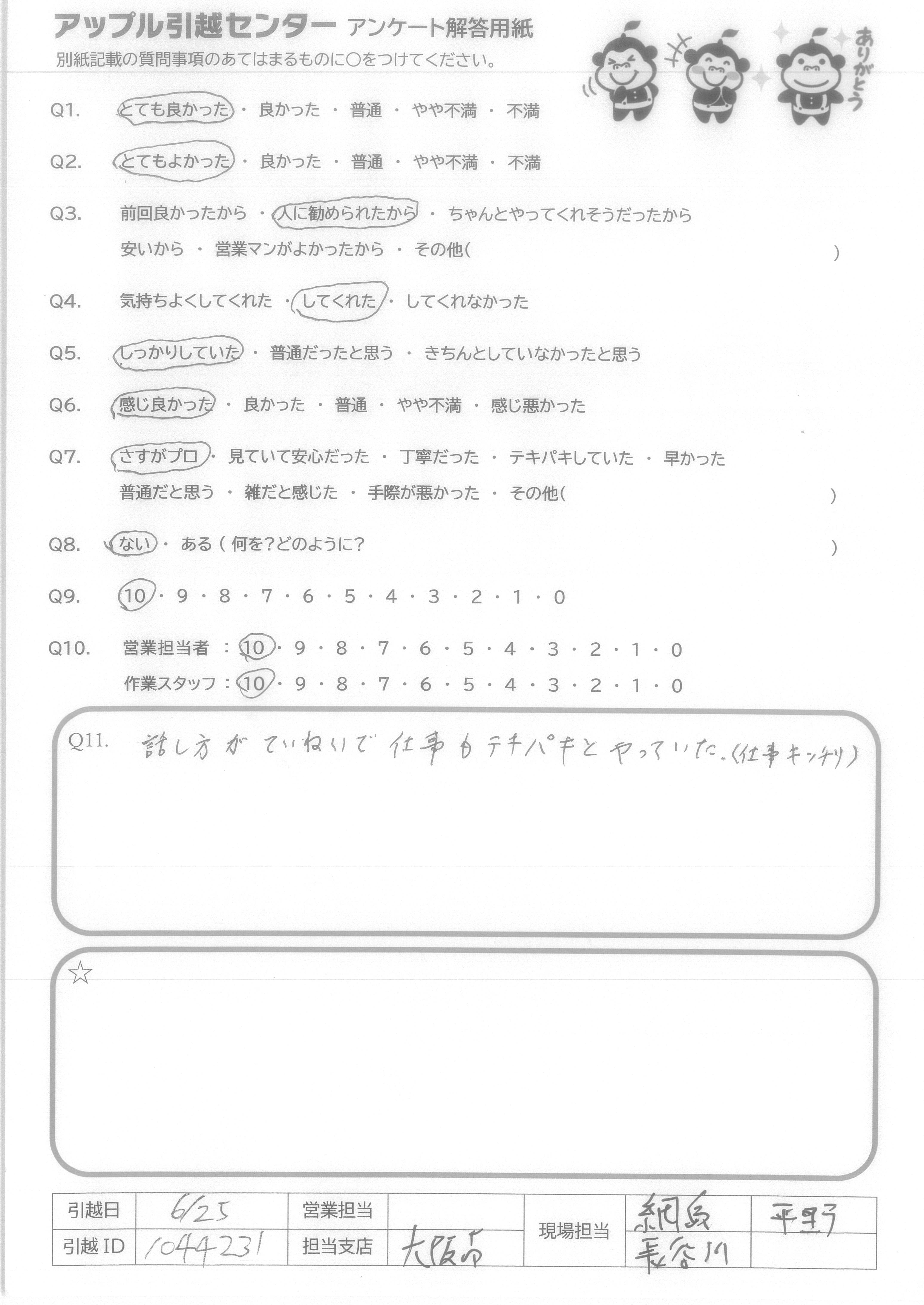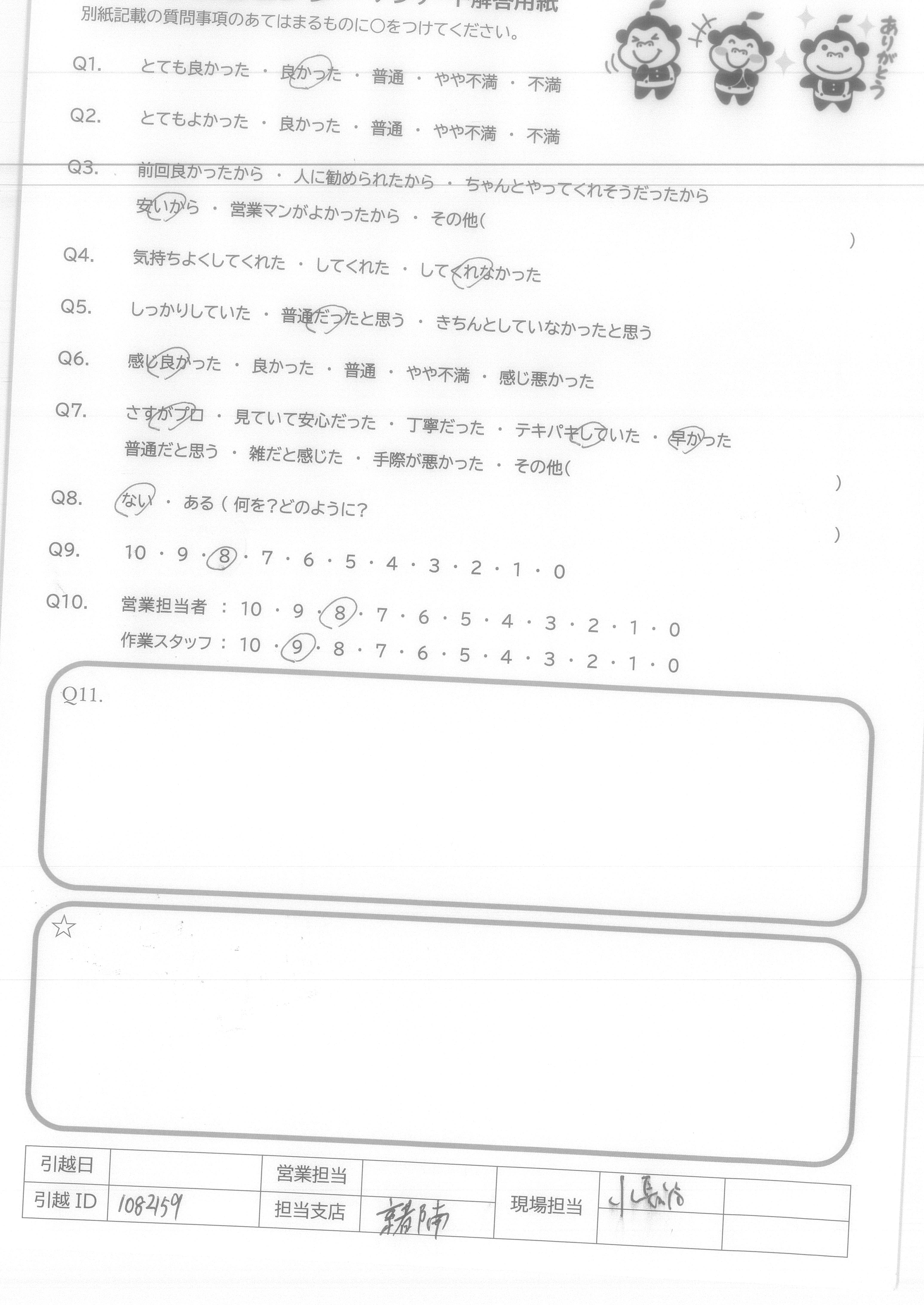 A.作業スタッフ:最初はベテランの方と若い方の人(前回他社)が来ると思ってたので若い方ばかりで不安だったのですが、こちらの意向を1つずつ丁寧に聞きながら、進めていただいて、それでいて作業の手際もよく、驚きました。又、引越先の管理人にも作業初めに挨拶をしてくれたとの事で、全てにおいて満足です。
