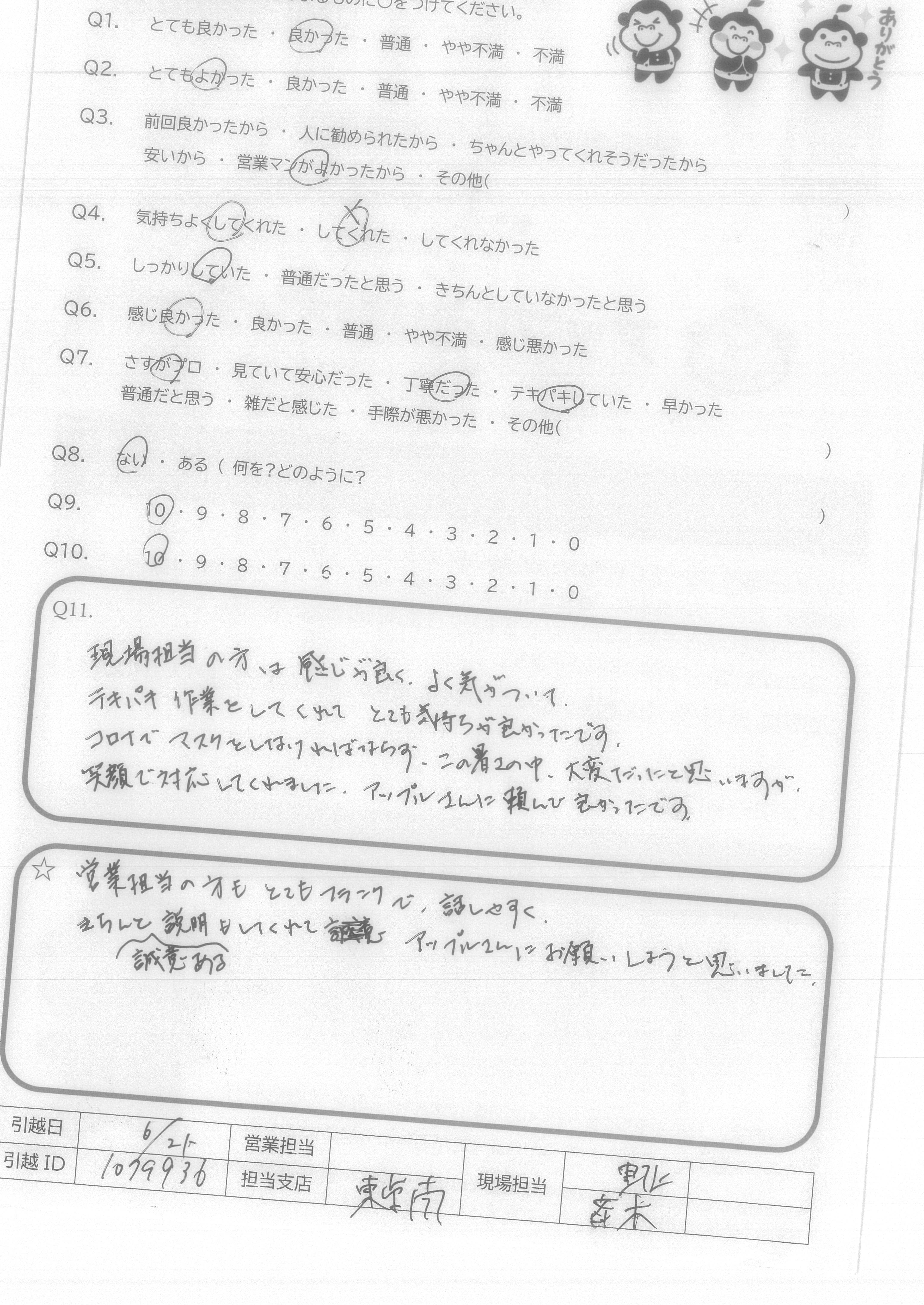 A.初めての引っ越しで勝手がよくわかりませんでしたが、スタッフの方がテキパキとしていて作業時間も早かったので驚きました。搬入が終わったあと、どの荷物をどこに置いたかなど、丁寧な説明があり安心しました。ありがとうございました。