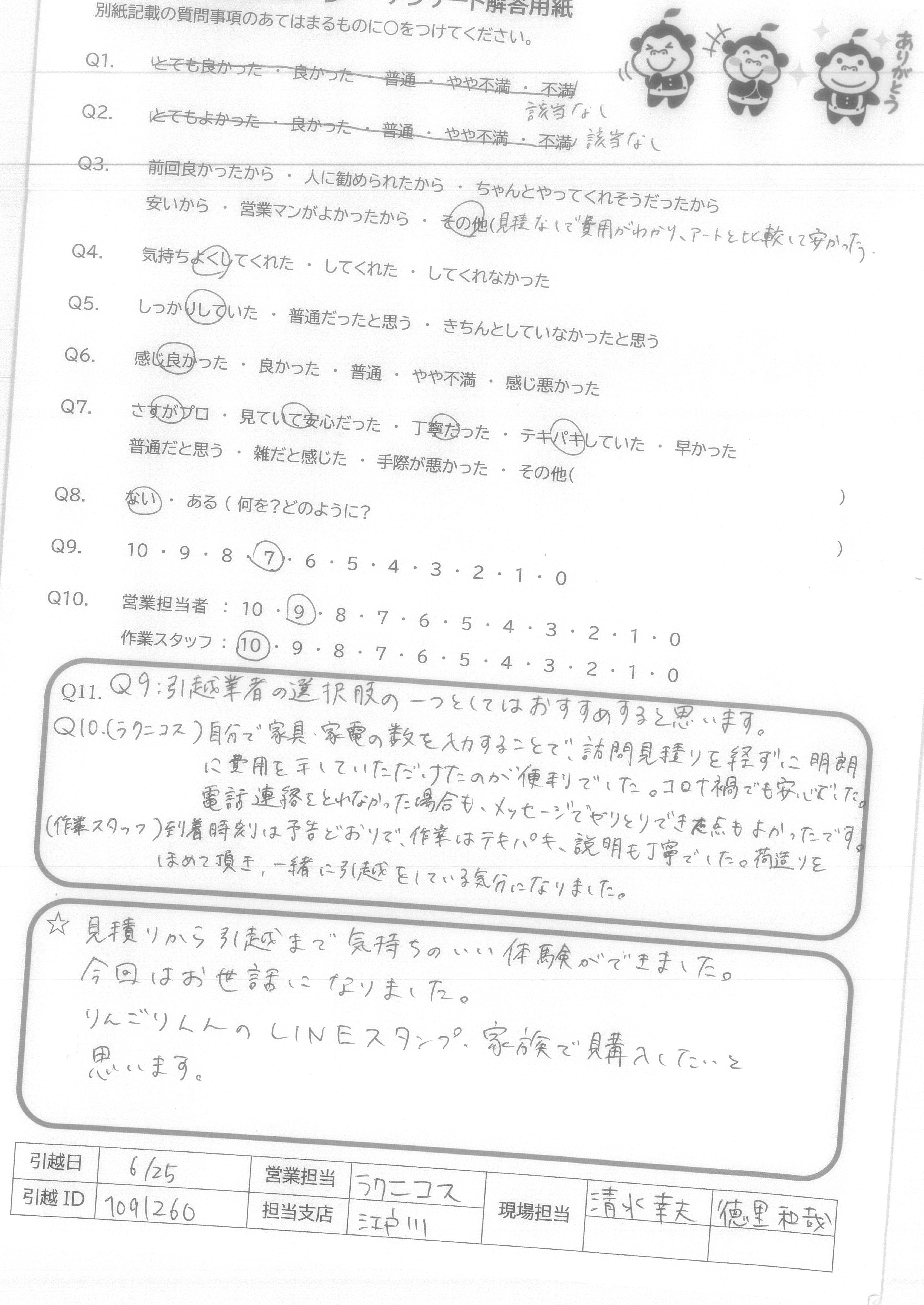 A.見積りから引越まで気持ちのいい体験ができました。 今回はお世話になりました。 りんごりくんのLINEスタンプ、家族で購入したいと思います。