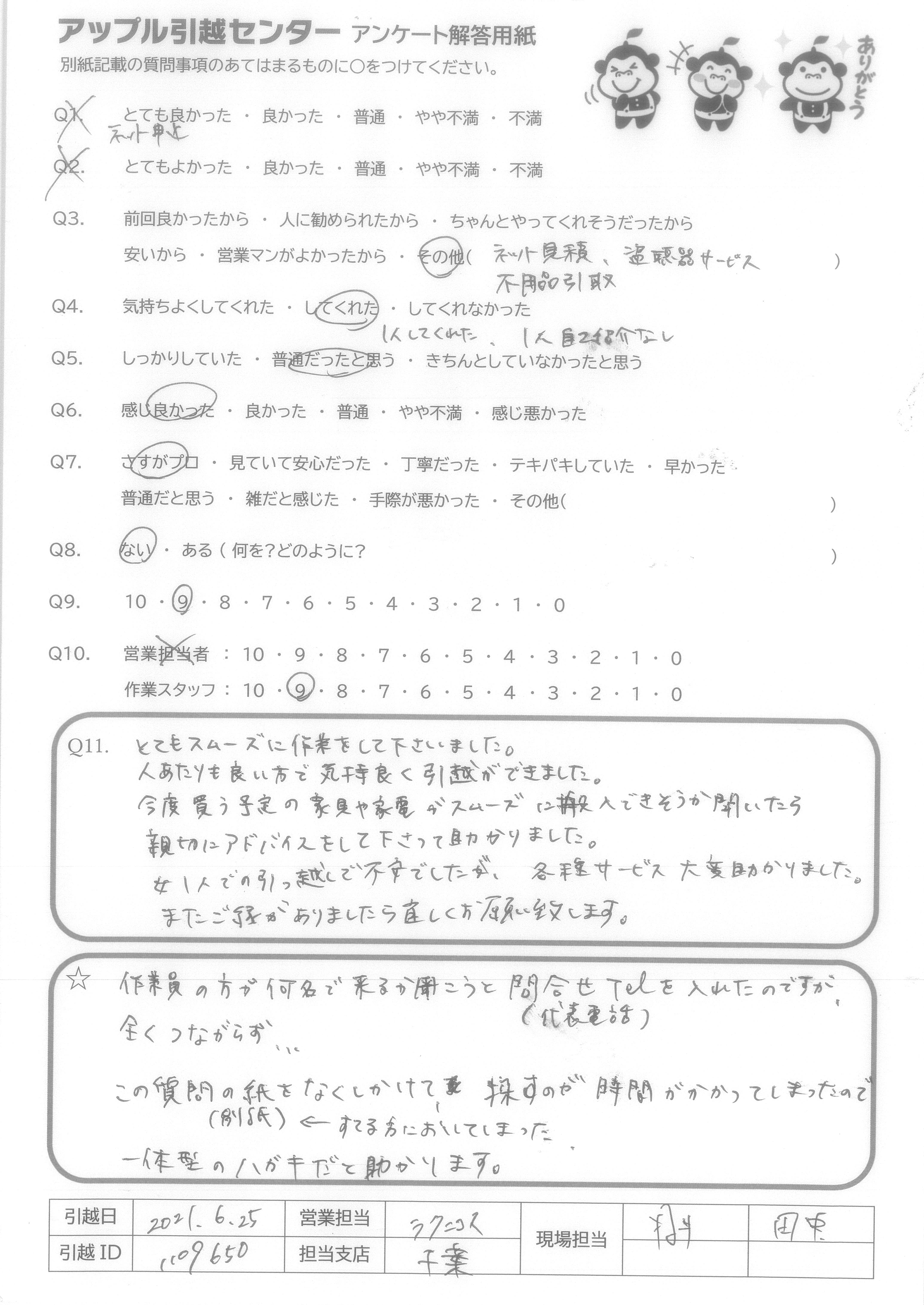 A.Q9:引越業者の選択肢の一つとしてはおすすめすると思います。 Q10:(ラクニコス)自分で家具・家電の数を入力することで、訪問見積りを経ずに、明朗に費用を示していただけたのが便利でした。コロナ禍でも安心でした。電話連絡をとれなかった場合も、メッセージでやりとりできた点もよかったです。 (作業スタッフ)到着時刻は予告どおりで、作業はテキパキ、説明も丁寧でした。荷造りをほめて頂き、一緒に引越をしている気分になりました。