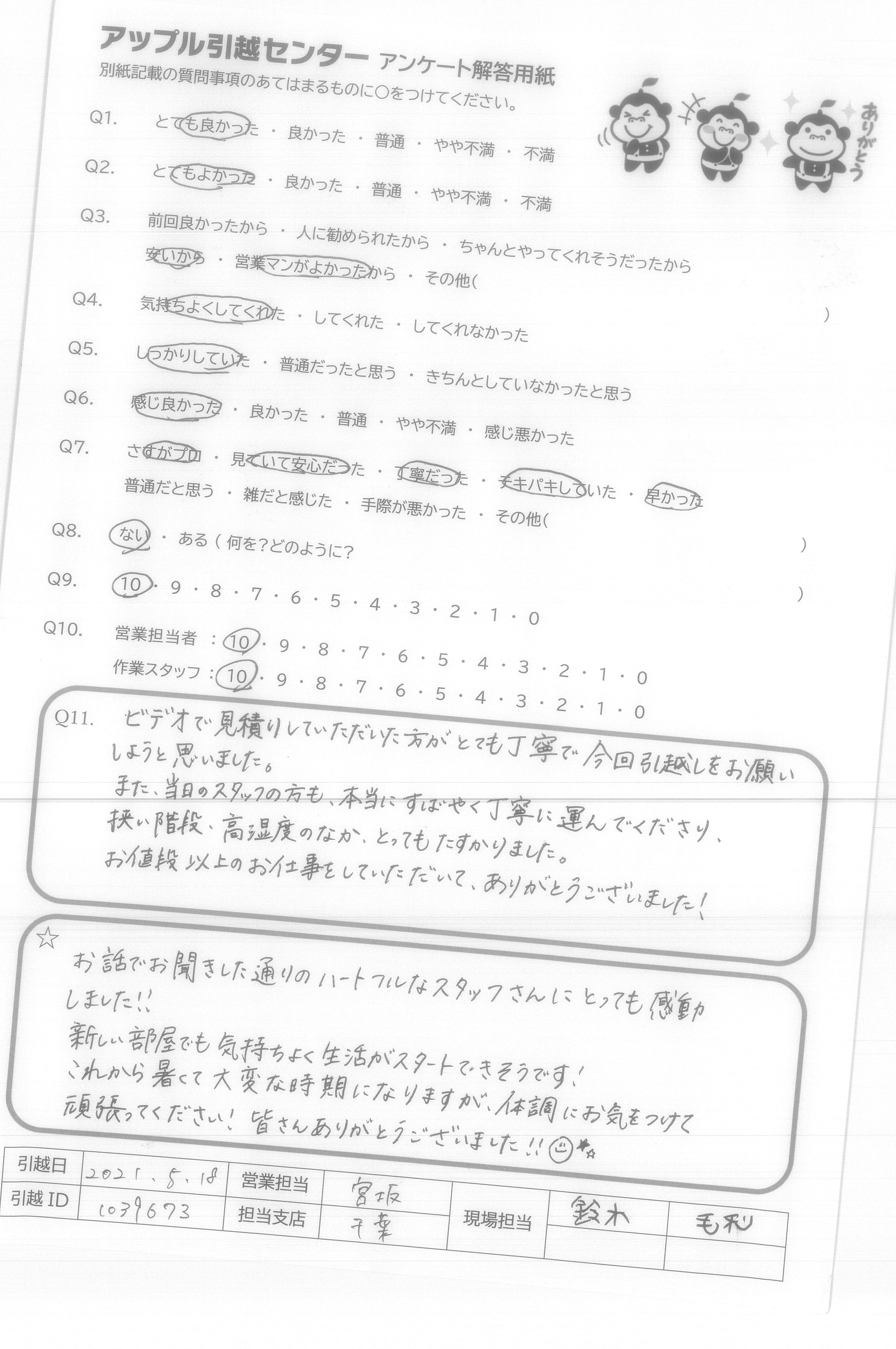 A.ビデオで見積りしていただいた方がとても丁寧で今回引越しをお願いしようと思いました。 また、当日のスタッフの方も、本当にすばやく丁寧に運んでくださり、狭い階段、高湿度のなか、とってもたすかりました。 お値段以上のお仕事をしていただいて、ありがとうございました!
