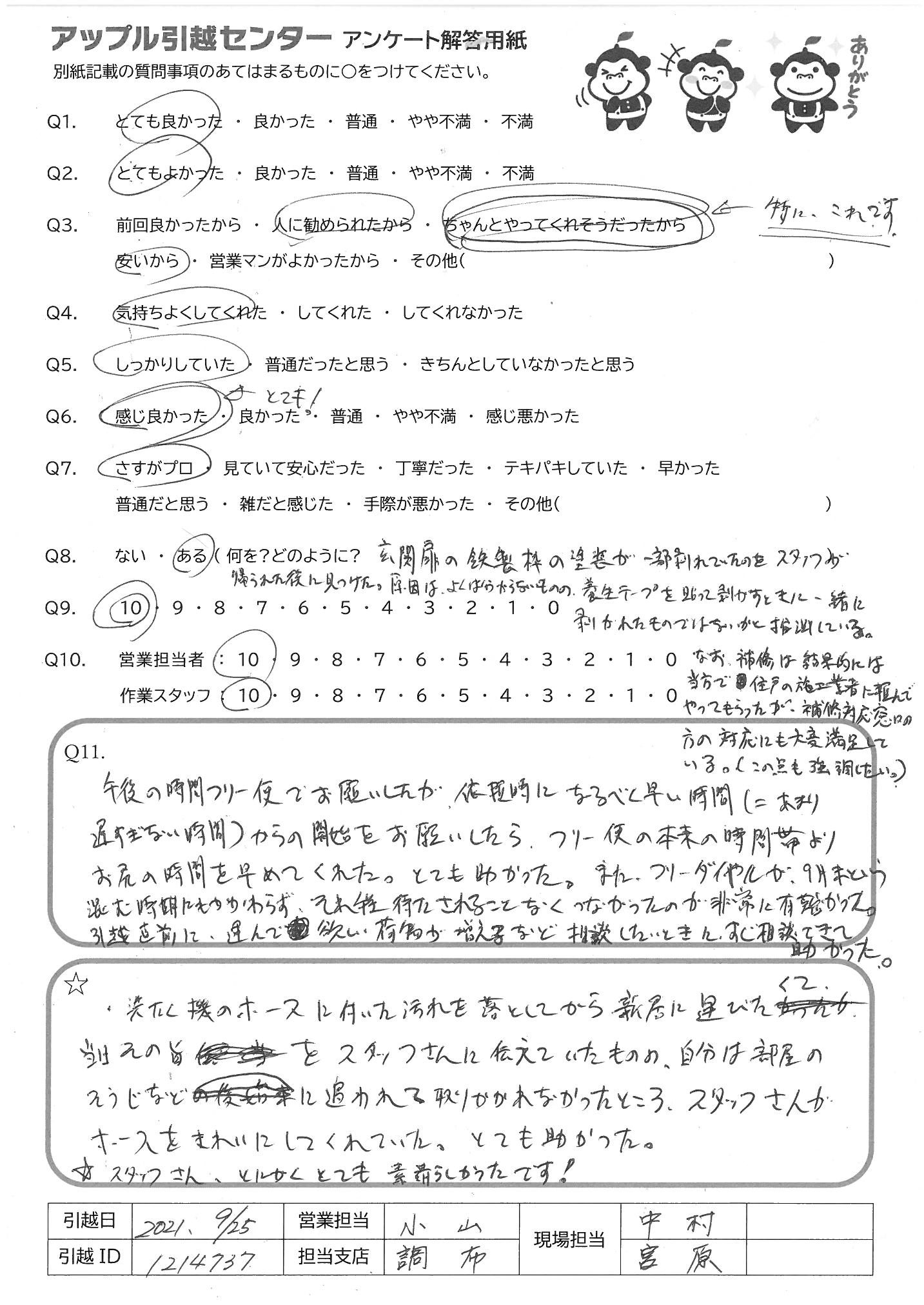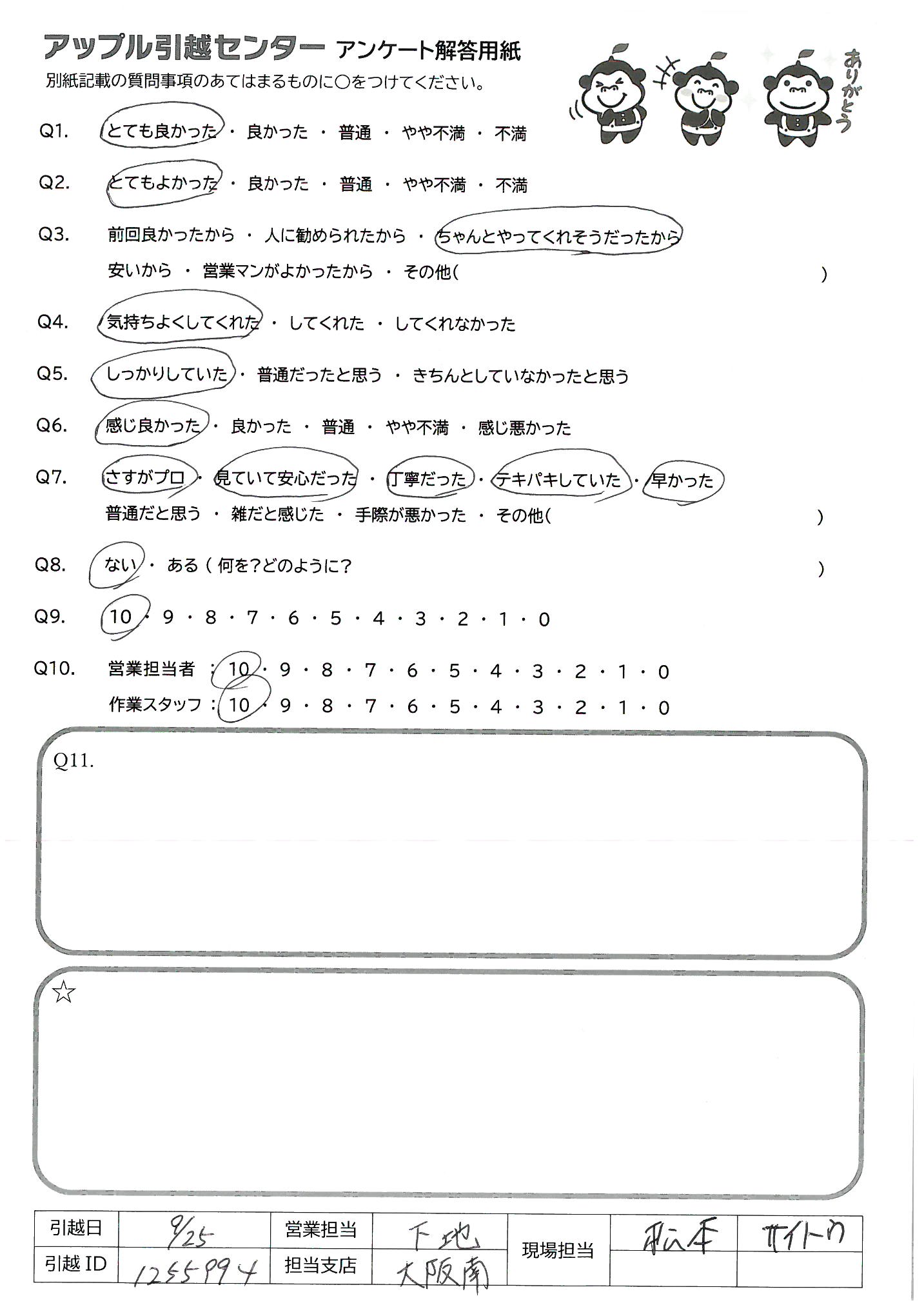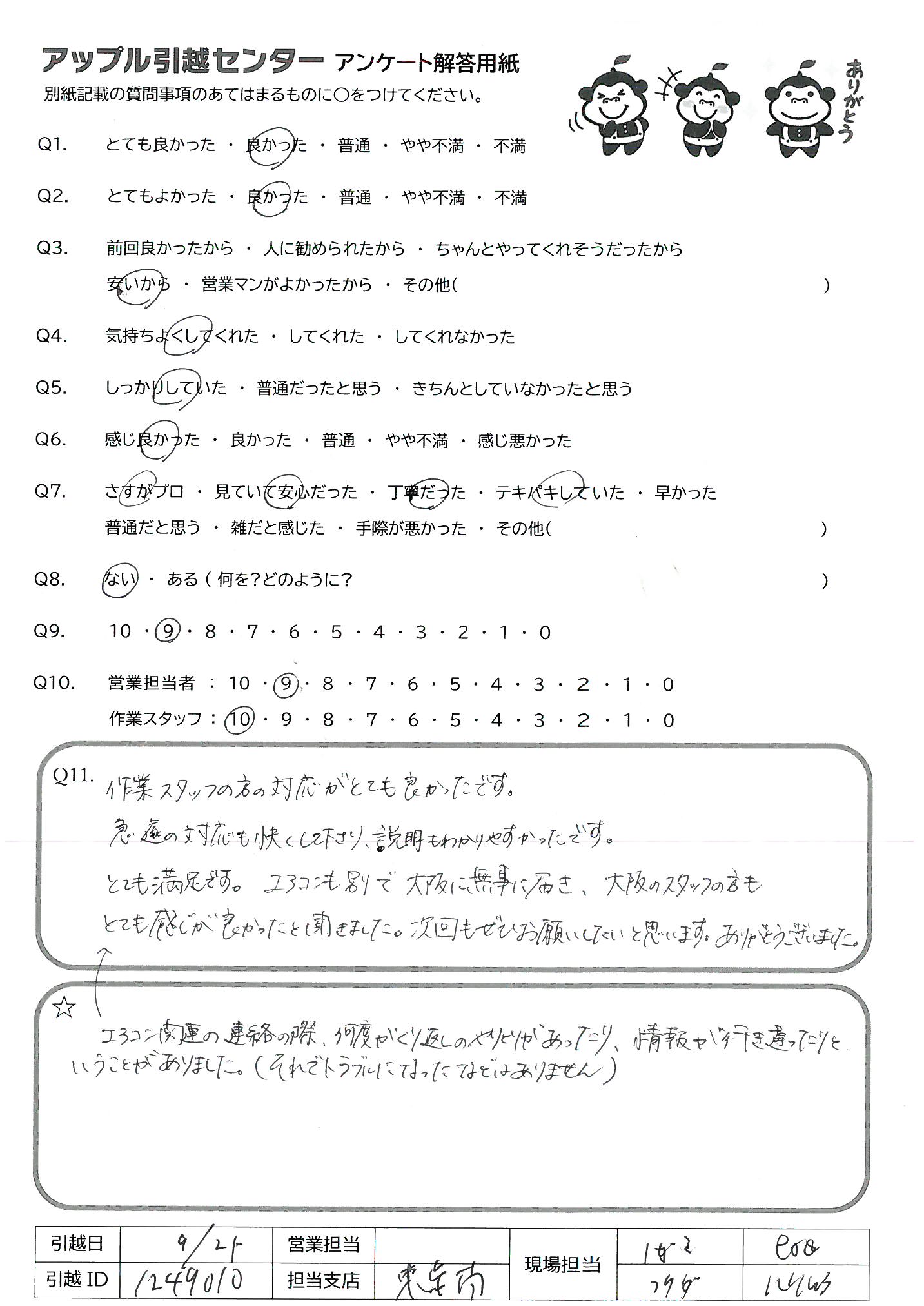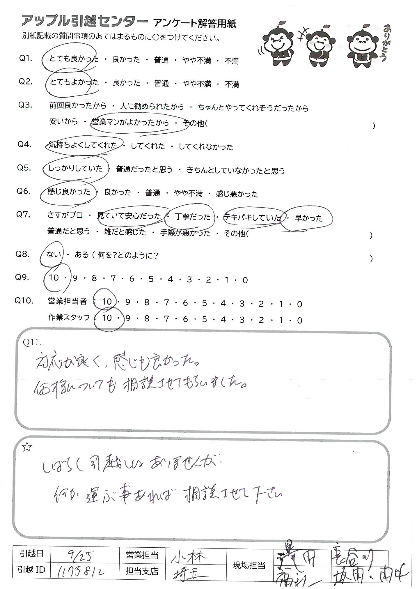 A.<営業担当> 何社か見積りのお電話をしましたが、大島さんの感じがとても良く、お値段もお安く安心して任せることができました。 <作業スタッフ> 元気でハキハキしていました。当日は手際良く進めて下さり、大変助かりました!ありがとうございました。