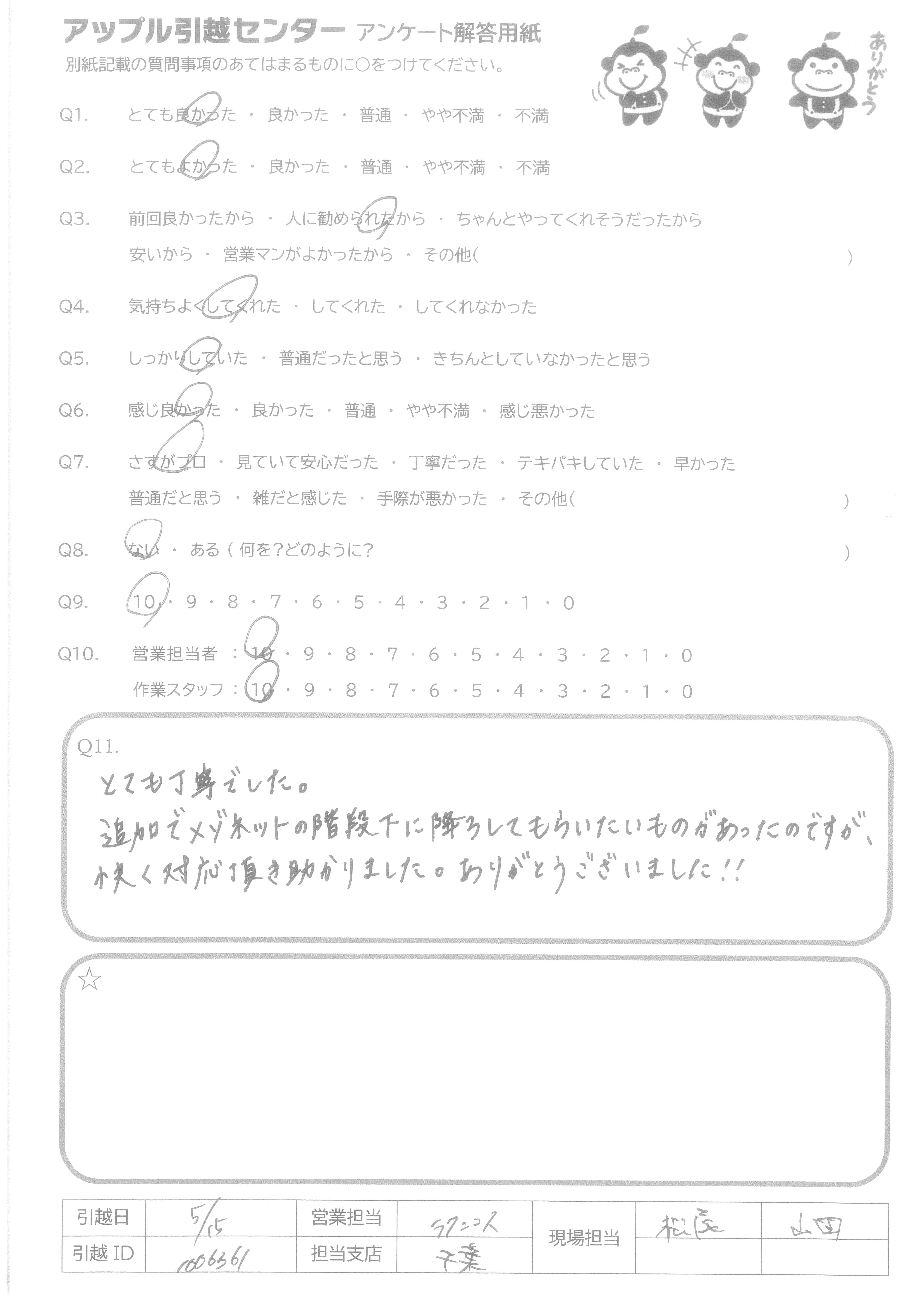 A.本日はご対応ありがとうございます。 是非、また引越しの際にご協力お願い致します。