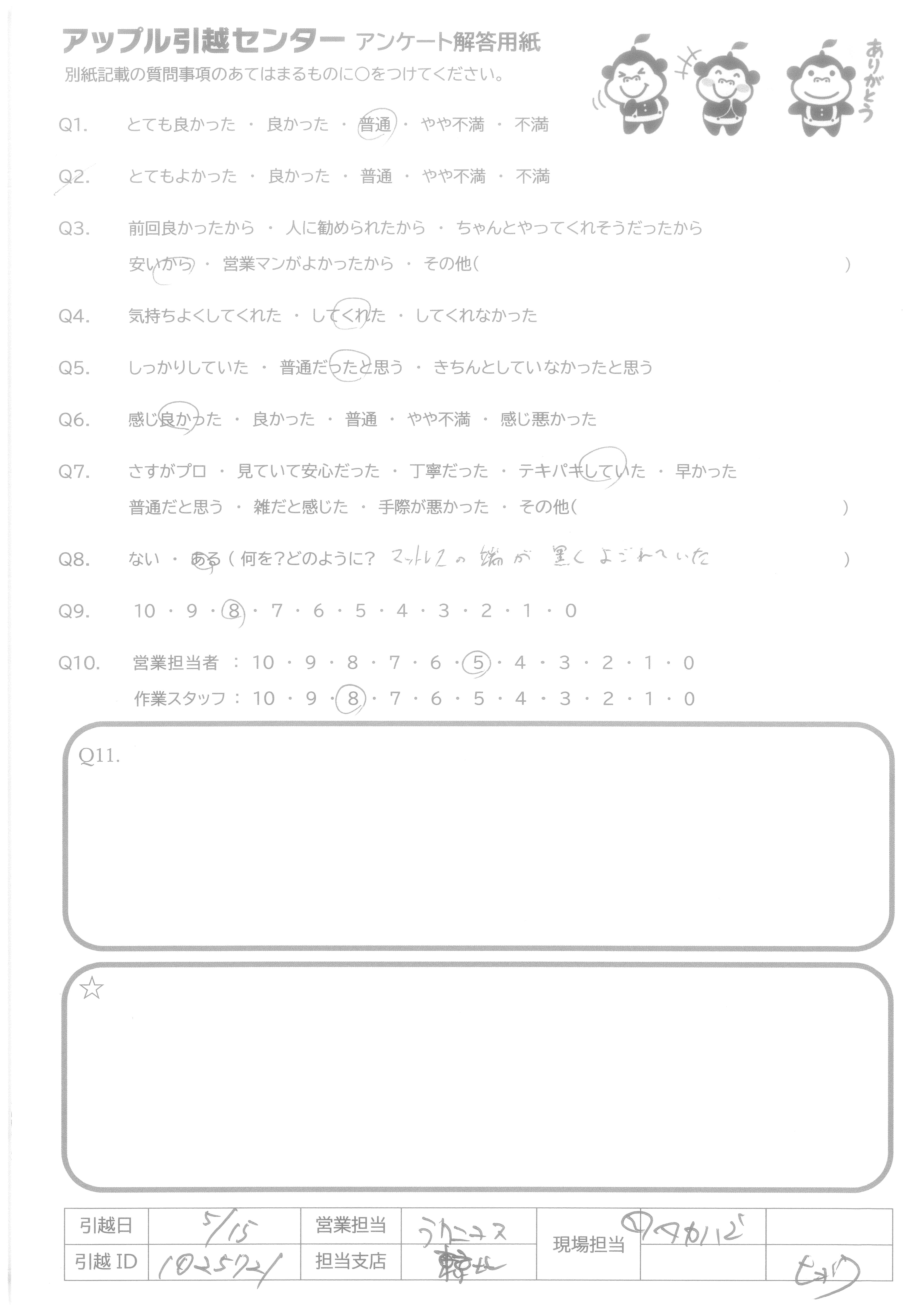 A.印象が良く、仕事も素早く、助かりました。 嫌な顔ひとつせず、入りきらない荷物もダンボールを準備していただき、有難うございました。 次回も機会があれば宜しくお願いします。