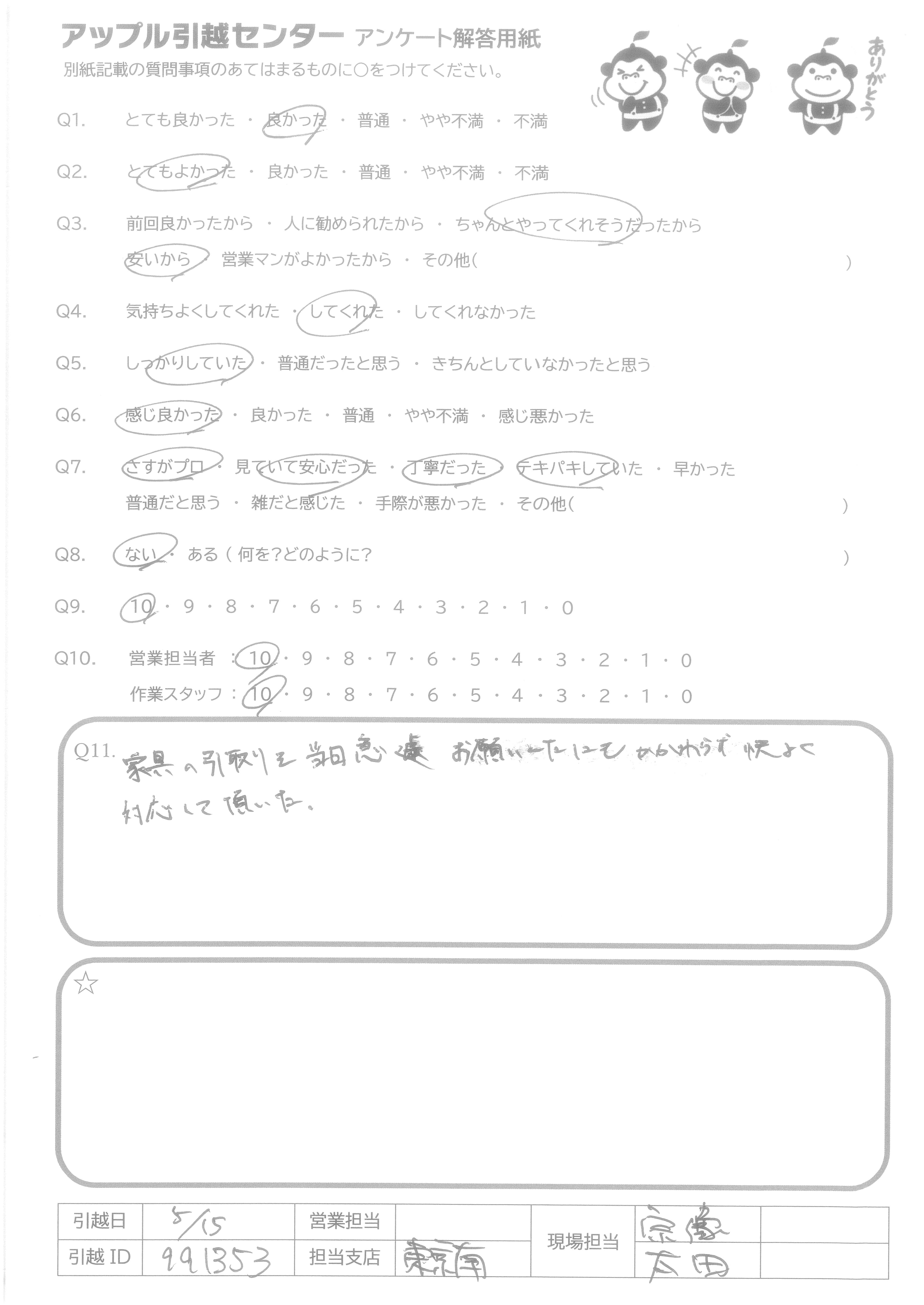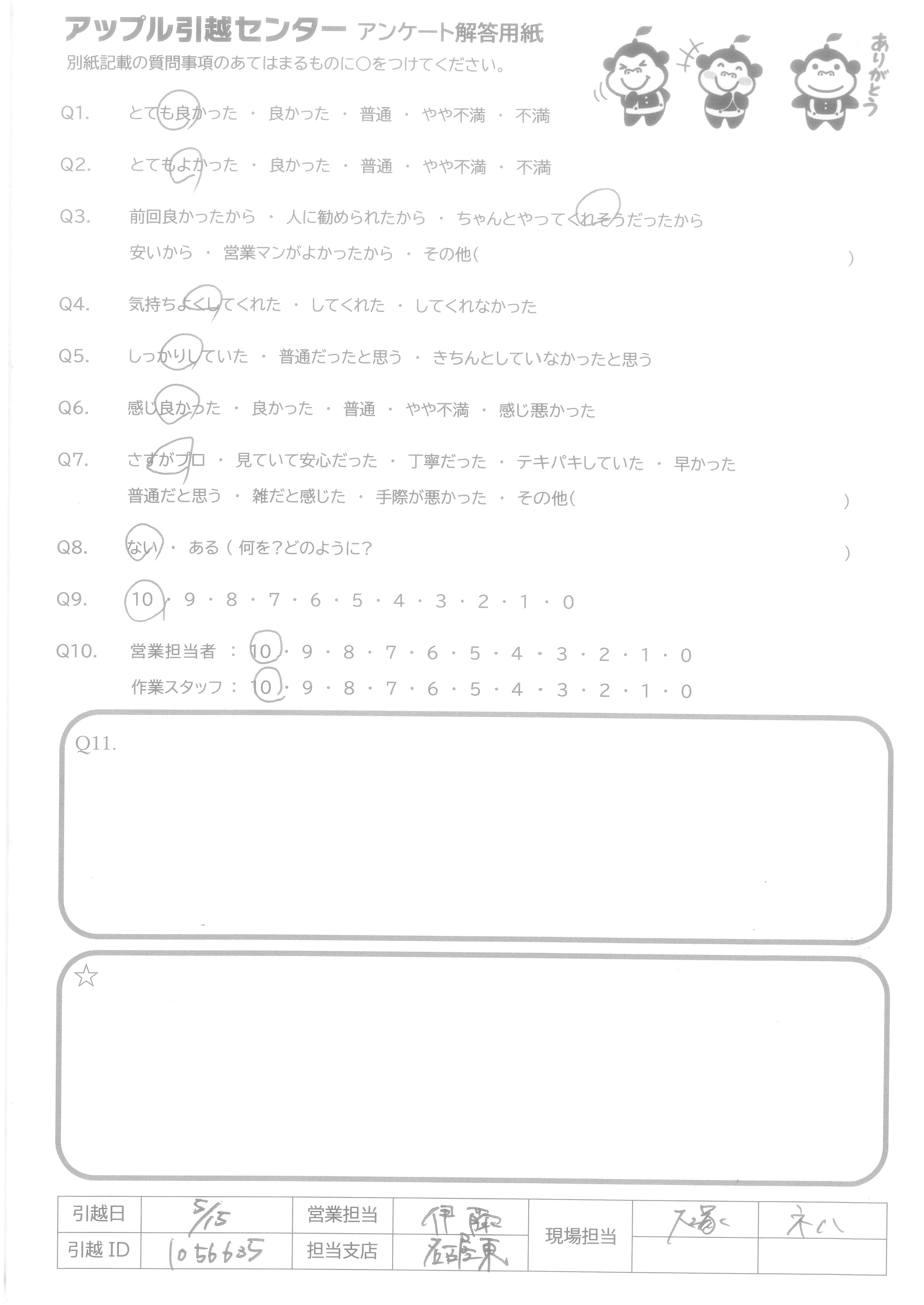 A.引っ越し当日は特に白井さんにお世話になりました。子連れ引っ越しということもあり、朝からあたふたしていましたが、白井さんの的確な指示のお陰でとても協力しやすかったです。手際良く、スムーズに完了していただけたことに心から感謝しております。新居においても照明の取り付けなど進んで声をかけて下さって、嬉しかったですし、本当に助かりました!!ありがとうございました。