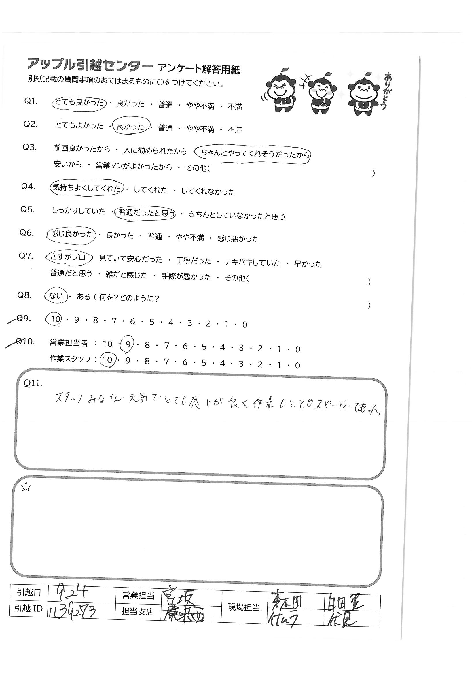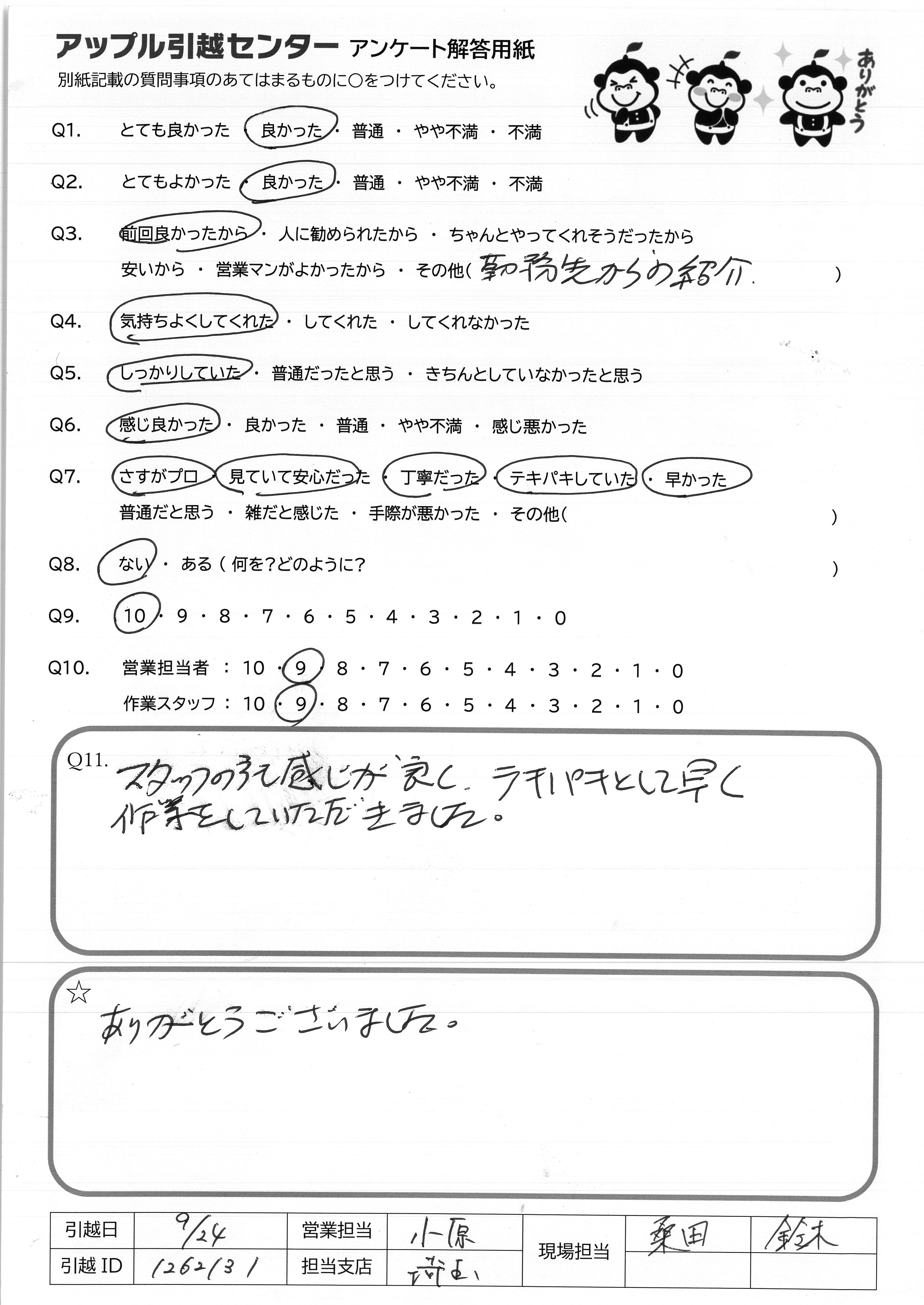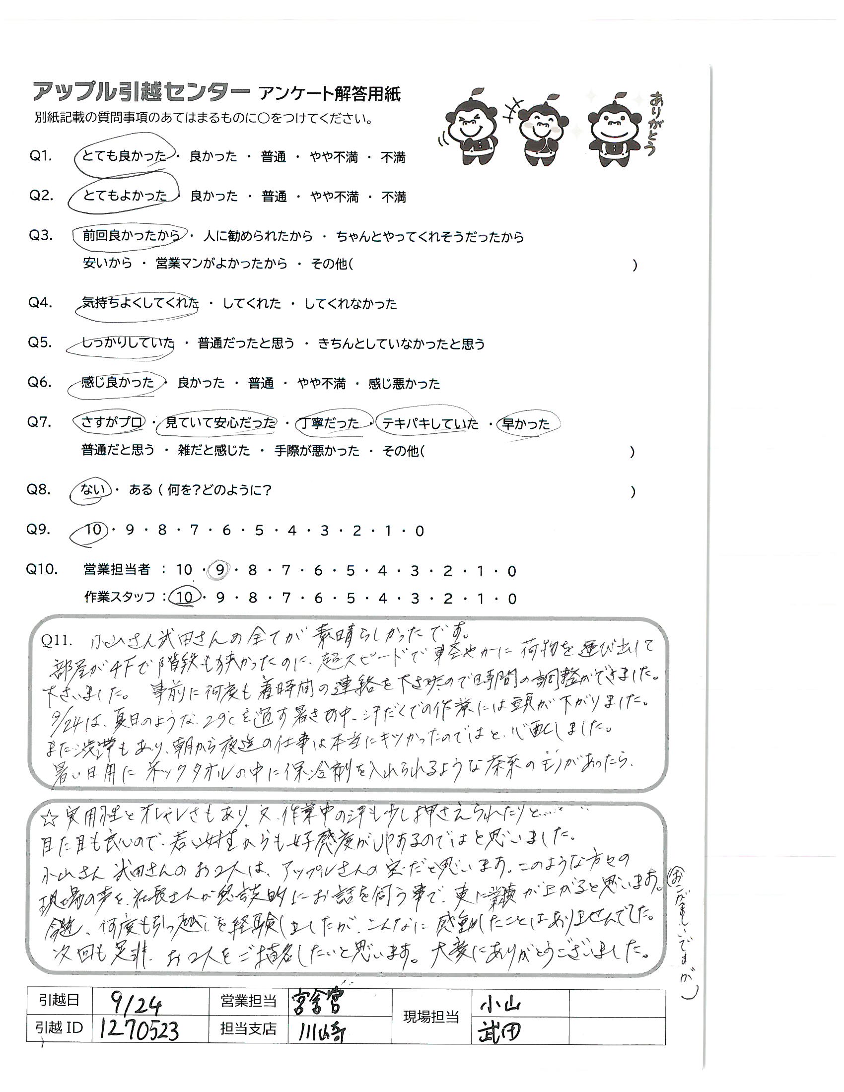 A.小山さん武田さんの全てが素晴らしかったです。 部屋が4Fで階段も狭かったのに、超スピードで軽やかに荷物を運び出して下さいました。事前に何度も着時間の連絡をくださったので時間の調整ができました。9/24は夏日のような29℃を過す暑さの中、汗だくでの作業には頭が下がりました。 また渋滞もあり、朝から夜迄の仕事は本当にキツかったのではと心配しました。 暑い日用にネックタオルの中に保冷剤を入れられるような床系のモノがあったら、