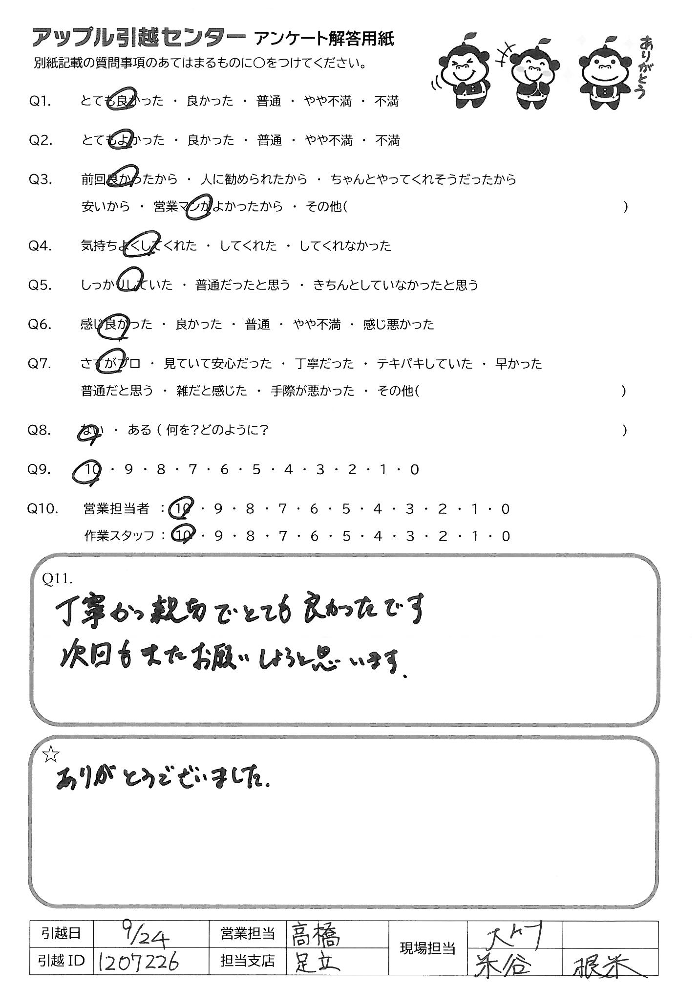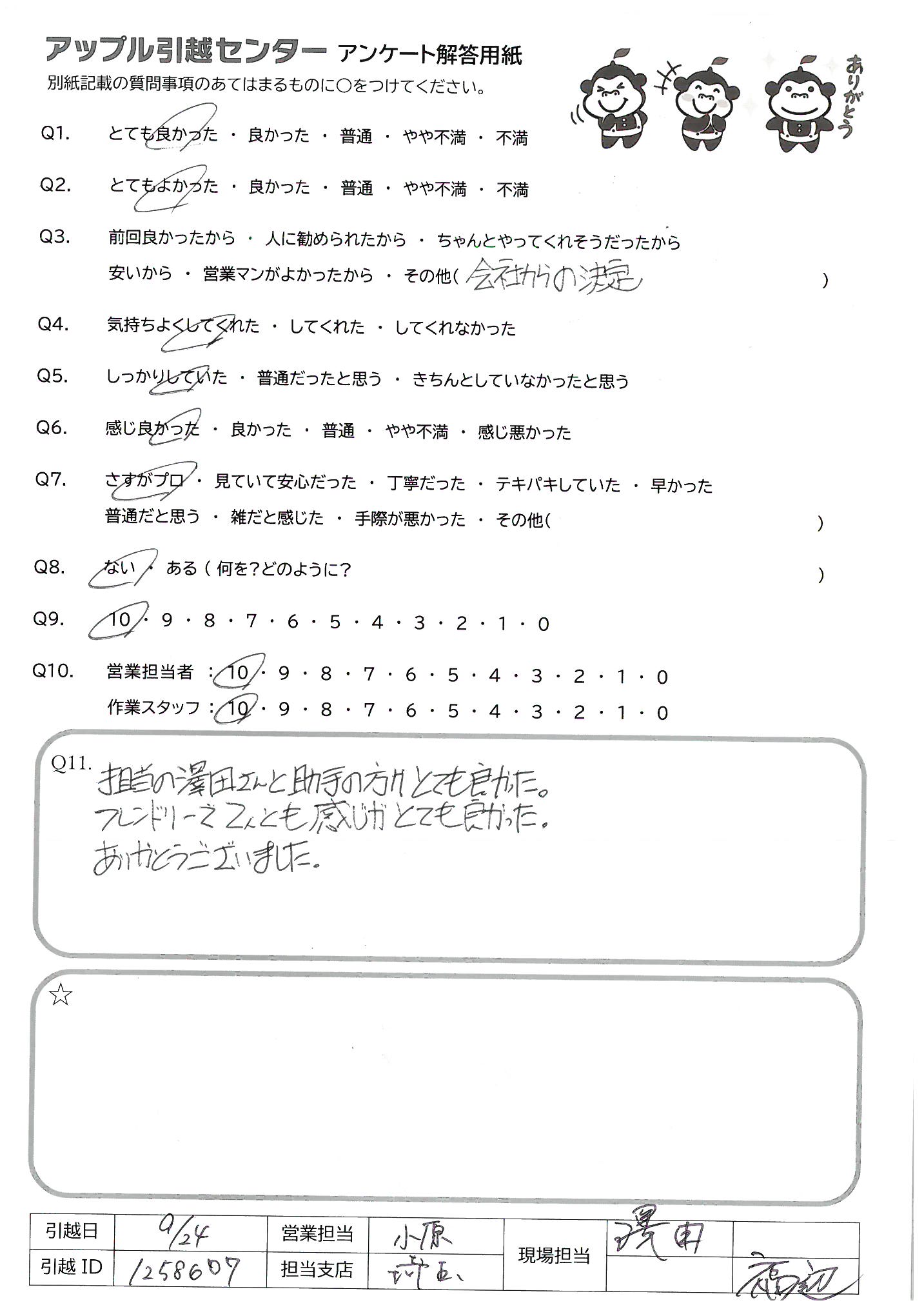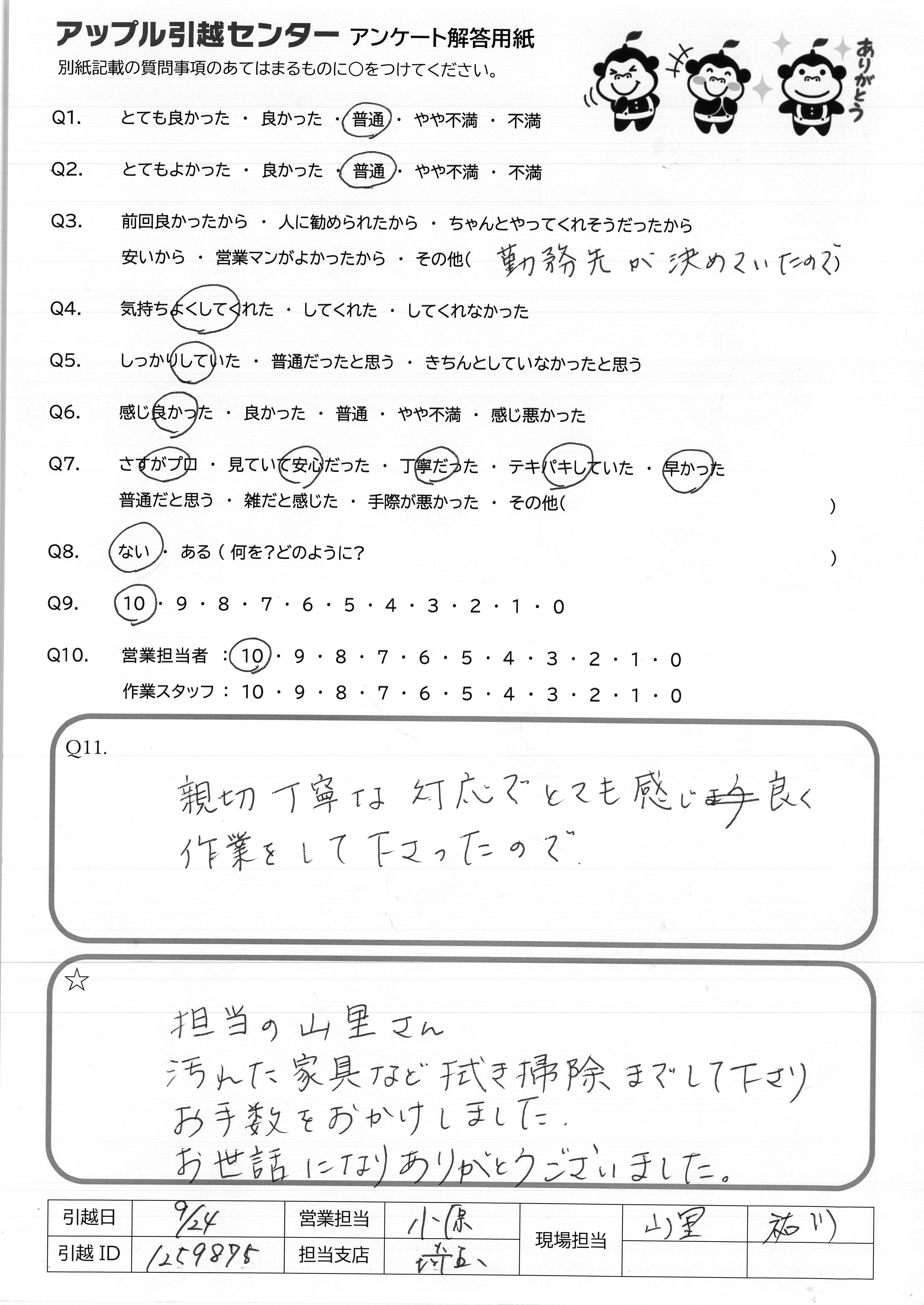 A.小山さん武田さんの全てが素晴らしかったです。 部屋が4Fで階段も狭かったのに、超スピードで軽やかに荷物を運び出して下さいました。事前に何度も着時間の連絡をくださったので時間の調整ができました。9/24は夏日のような29℃を過す暑さの中、汗だくでの作業には頭が下がりました。 また渋滞もあり、朝から夜迄の仕事は本当にキツかったのではと心配しました。 暑い日用にネックタオルの中に保冷剤を入れられるような床系のモノがあったら、