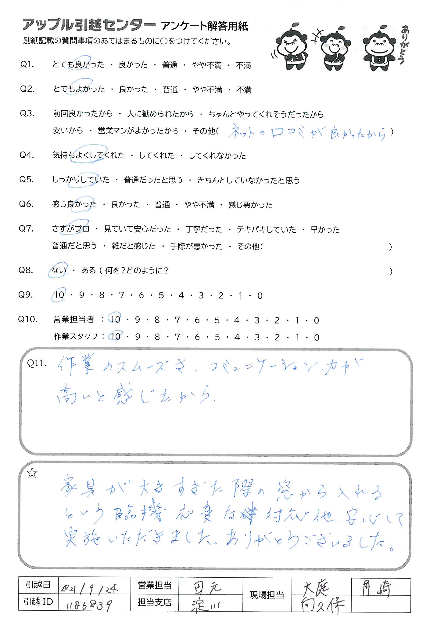 A.家具が大きすぎた際の窓から入れるという臨機応変な対応他、安心して実施いただきました。ありがとうございました。