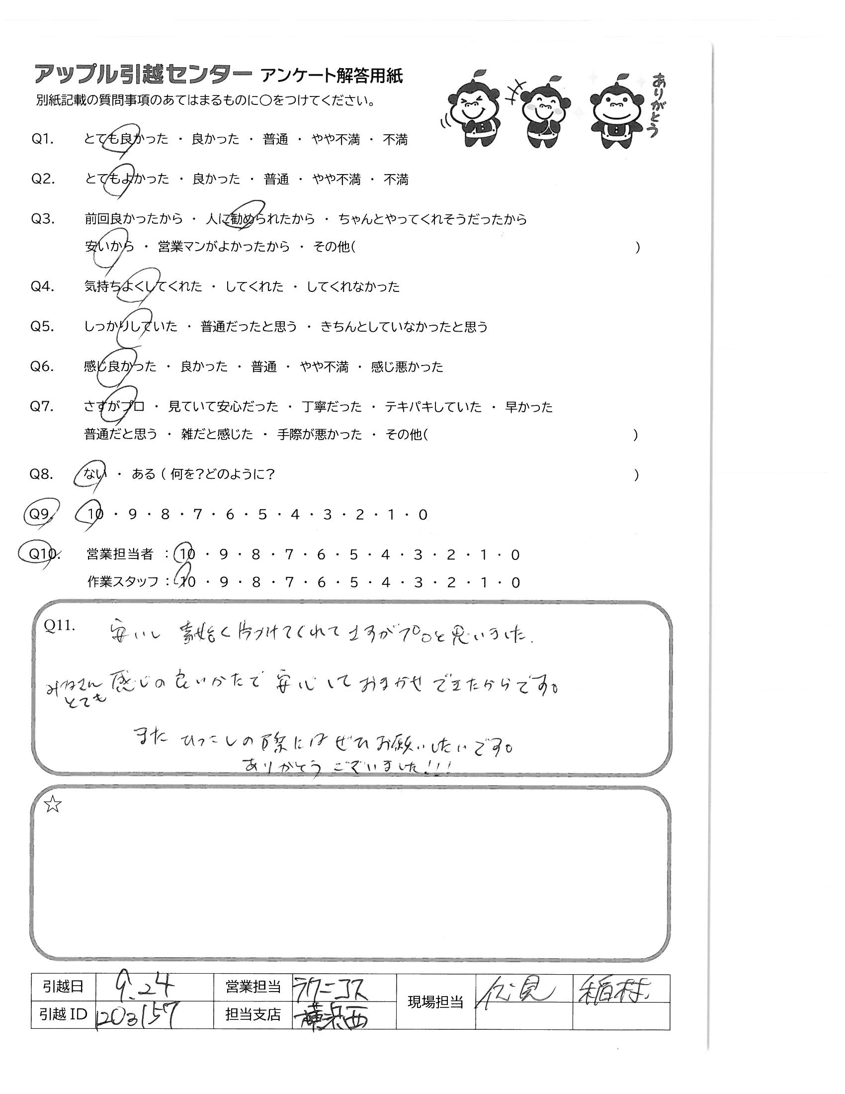 A.安いし素始く方つけてくれてさすがプロと思いました。 みなさんとても感じの良いかたで安心しておまかせできたからです。 またひっこしの際にはぜひお願いしたいです。 ありがとうございました!!!