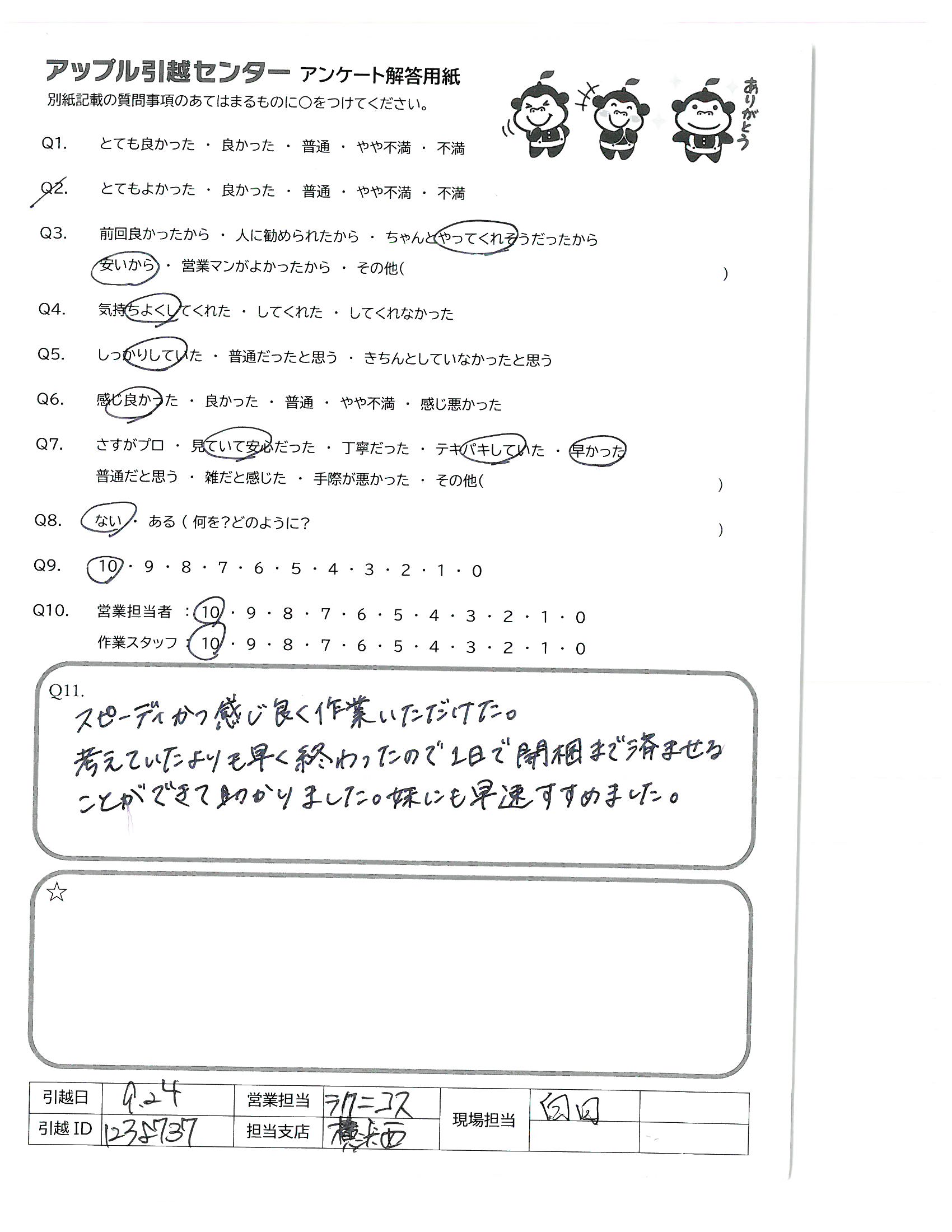 A.電話対応(最初の見積もり時)してくださった方も明るく感じの良い方で、お互いに考え違いのないようしっかり話をすることができ、安心してお金の準備ができました。 作業スタッフの方達も明るく冗談を時々まじえながら、でも、テキパキと丁寧に作業をして下さいました。 段ボールに書いてある「一番上に」とか「こわれものという表示もきちんと守って下さり、安心して見ていることができましたし、元気がでました。次の引っ越しも、絶対、アップルさんにお願いしようと思っていますし、わたしのまわりにも、いずれ引っ越しを絶対にする女子が何人もいますので強力にアップル引越センターを薦めます