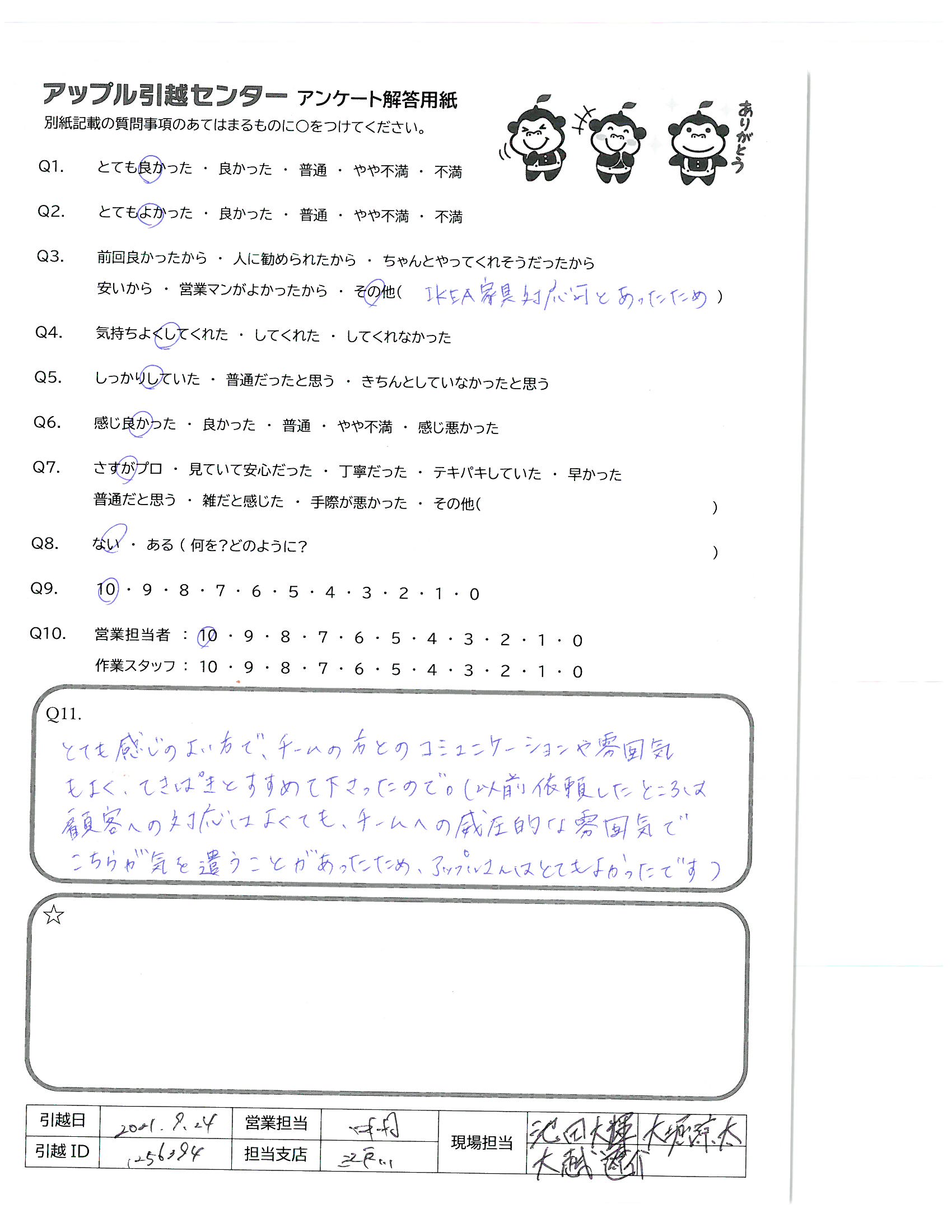 A.作業スタッフの方々が素晴らしかったです。今までの引っ越しで一番良かったです。 荷物を運ぶ段取りやスピードを始め、 IKEAの家具も完璧に再現してくださり、沢山あった植物も大変丁寧に扱ってくださいました。長時間に渡る作業でお疲れだったかと思いますが、最後まで明るく気持ちの良く作業してくださって感謝しております。ありがとうございました。