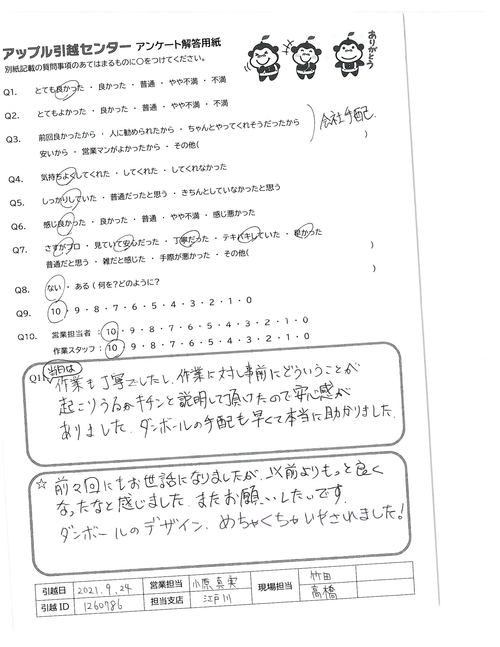 引越し日:2021年09月24日 エリア:神奈川県川崎市高津区