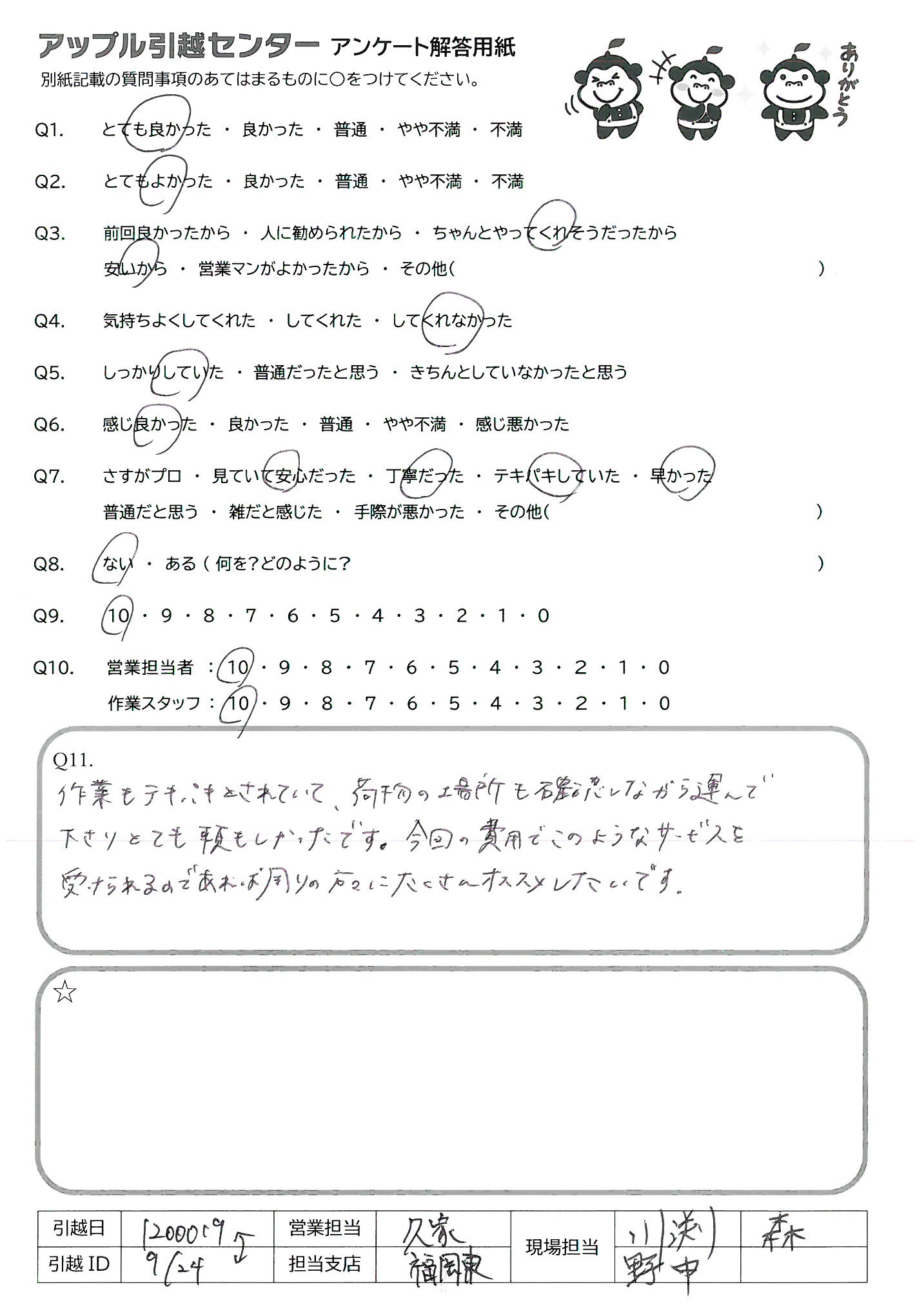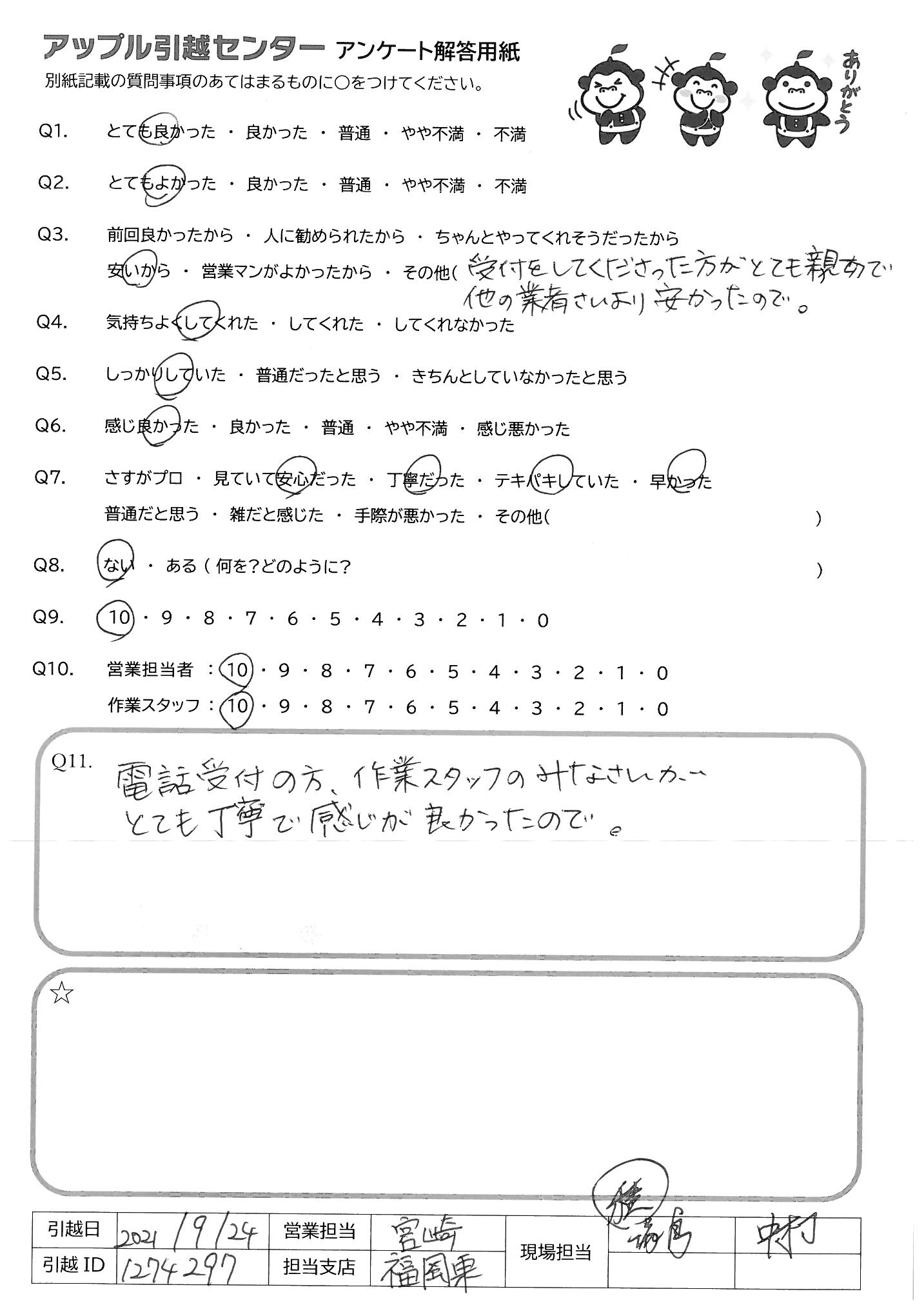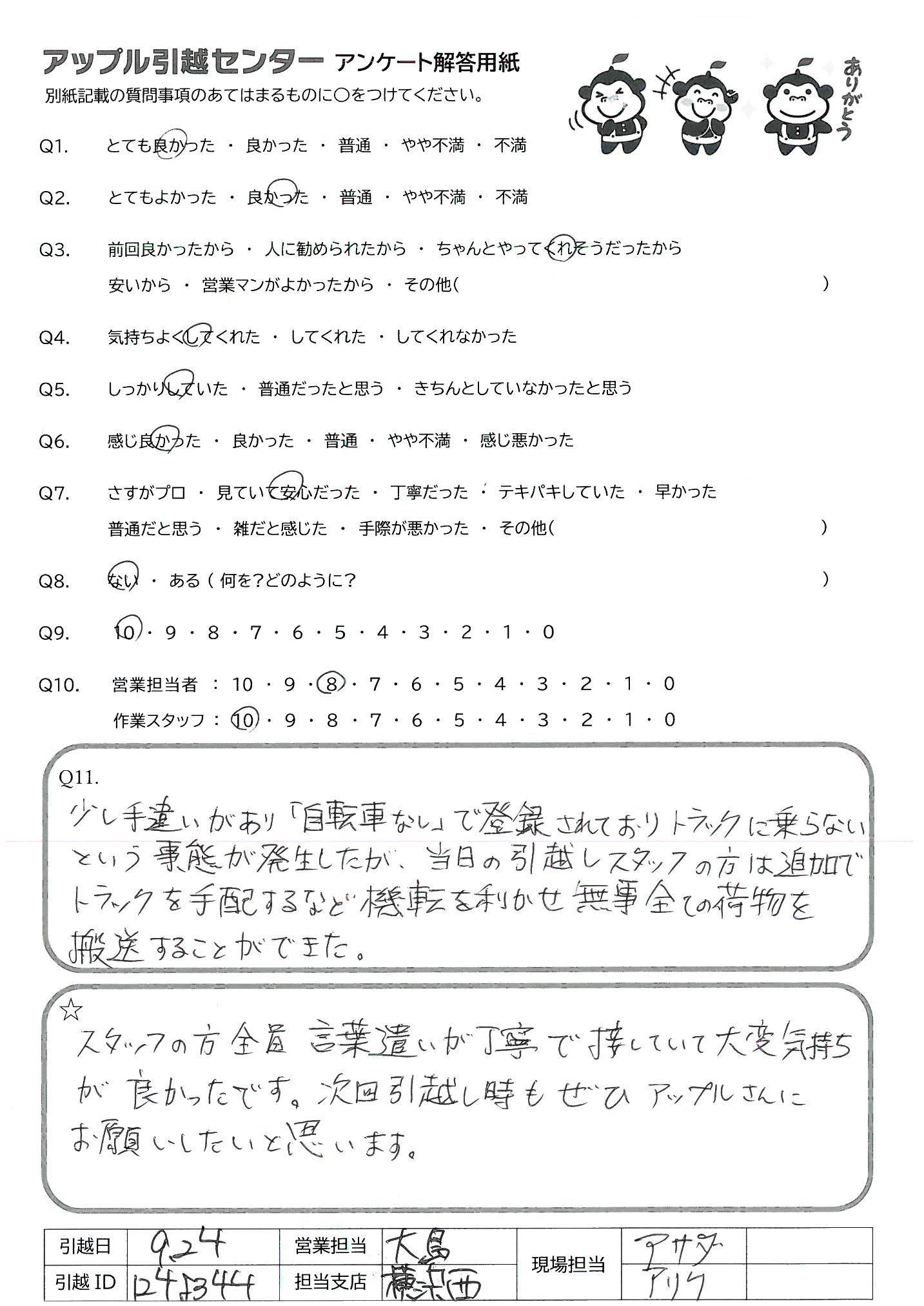 A.アンケートの回答が遅くなってしまい失礼致しました。この度はアップル引越センター様にお願いして本当に良かったと感じています。見積から当日の急な連絡まで丁寧に対応してくださった平田様、現場でなるべく荷物を運ぼうと頑張ってくださった渡邉様と今堀様、本当にありがとうございました。おかげさまで無事に引っ越しを終えることができました。機会があればまたお願いしたいと思います。