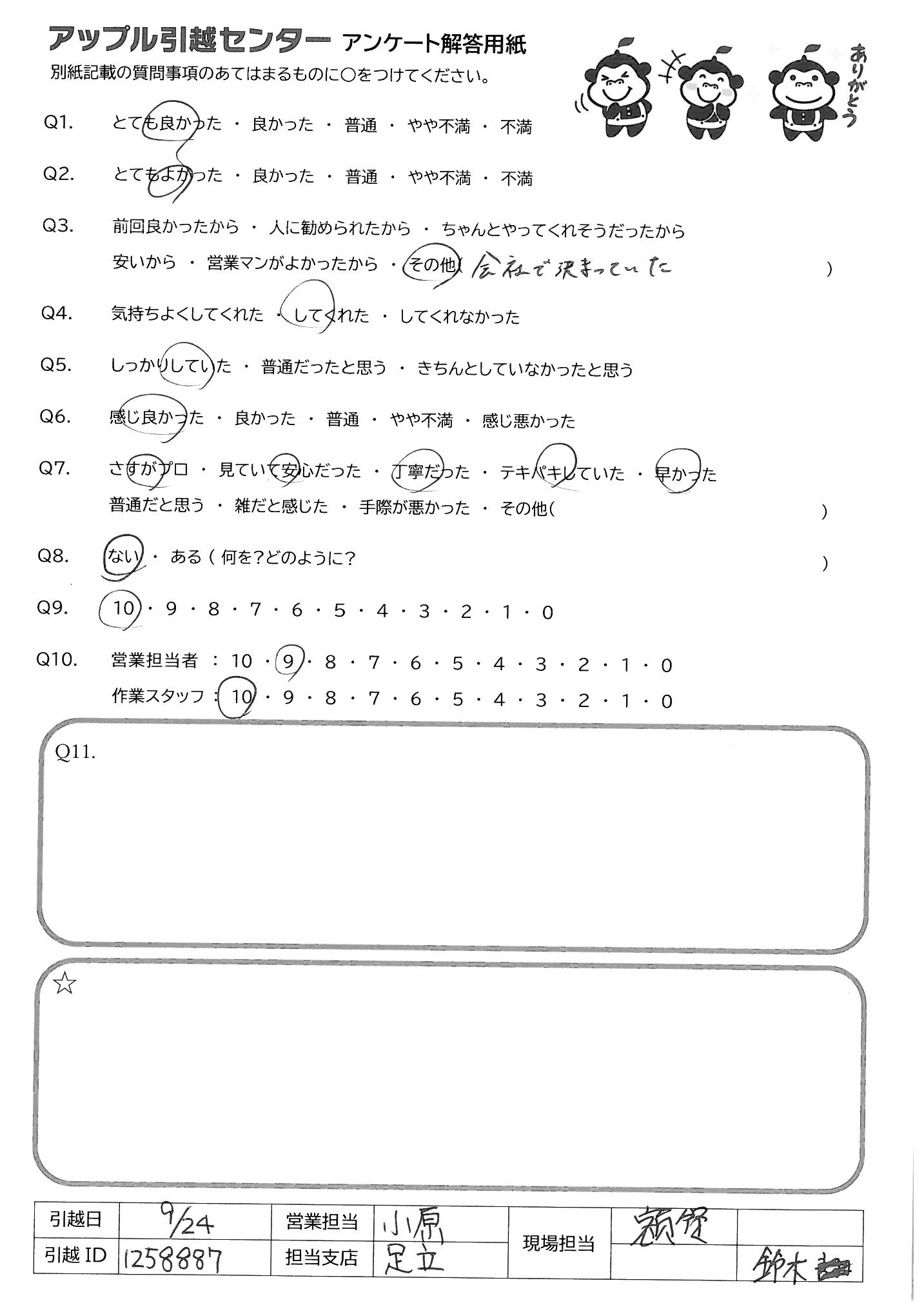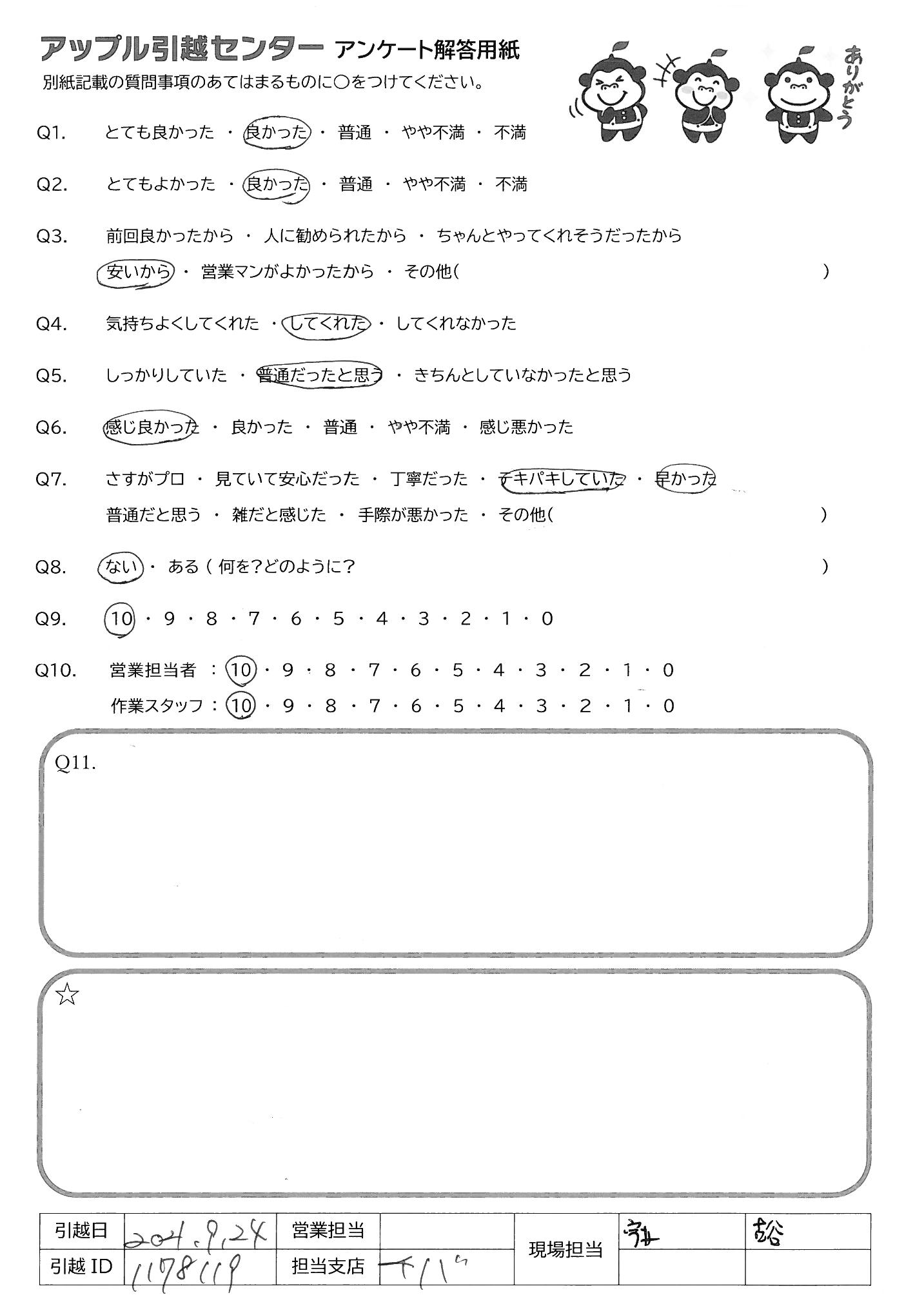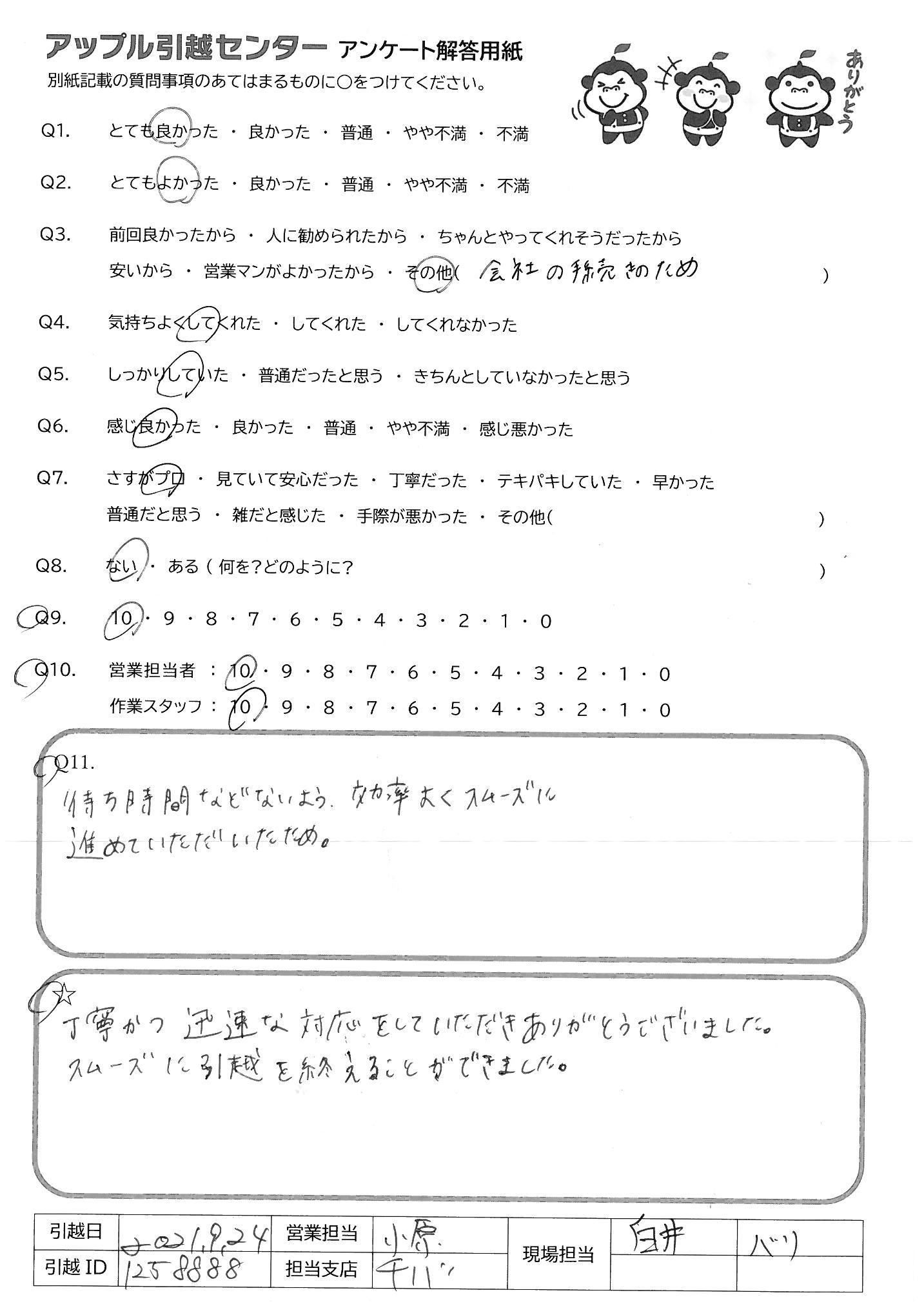 A.アンケートの回答が遅くなってしまい失礼致しました。この度はアップル引越センター様にお願いして本当に良かったと感じています。見積から当日の急な連絡まで丁寧に対応してくださった平田様、現場でなるべく荷物を運ぼうと頑張ってくださった渡邉様と今堀様、本当にありがとうございました。おかげさまで無事に引っ越しを終えることができました。機会があればまたお願いしたいと思います。