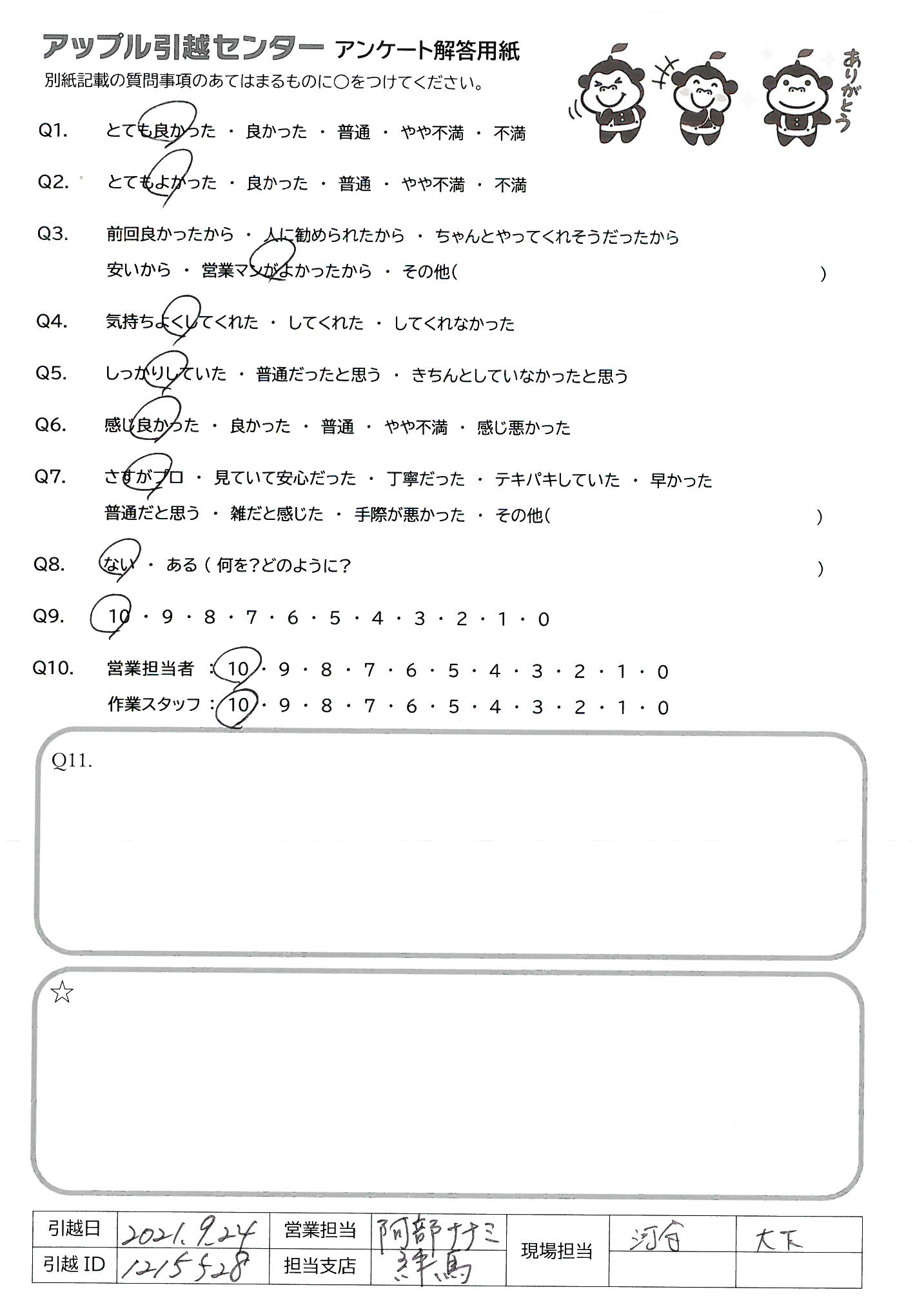 A.Q9...見積~引越当日まで、トータルで見て安心、親切 Q10...特に大きなマイナスポイントはありませんでした。