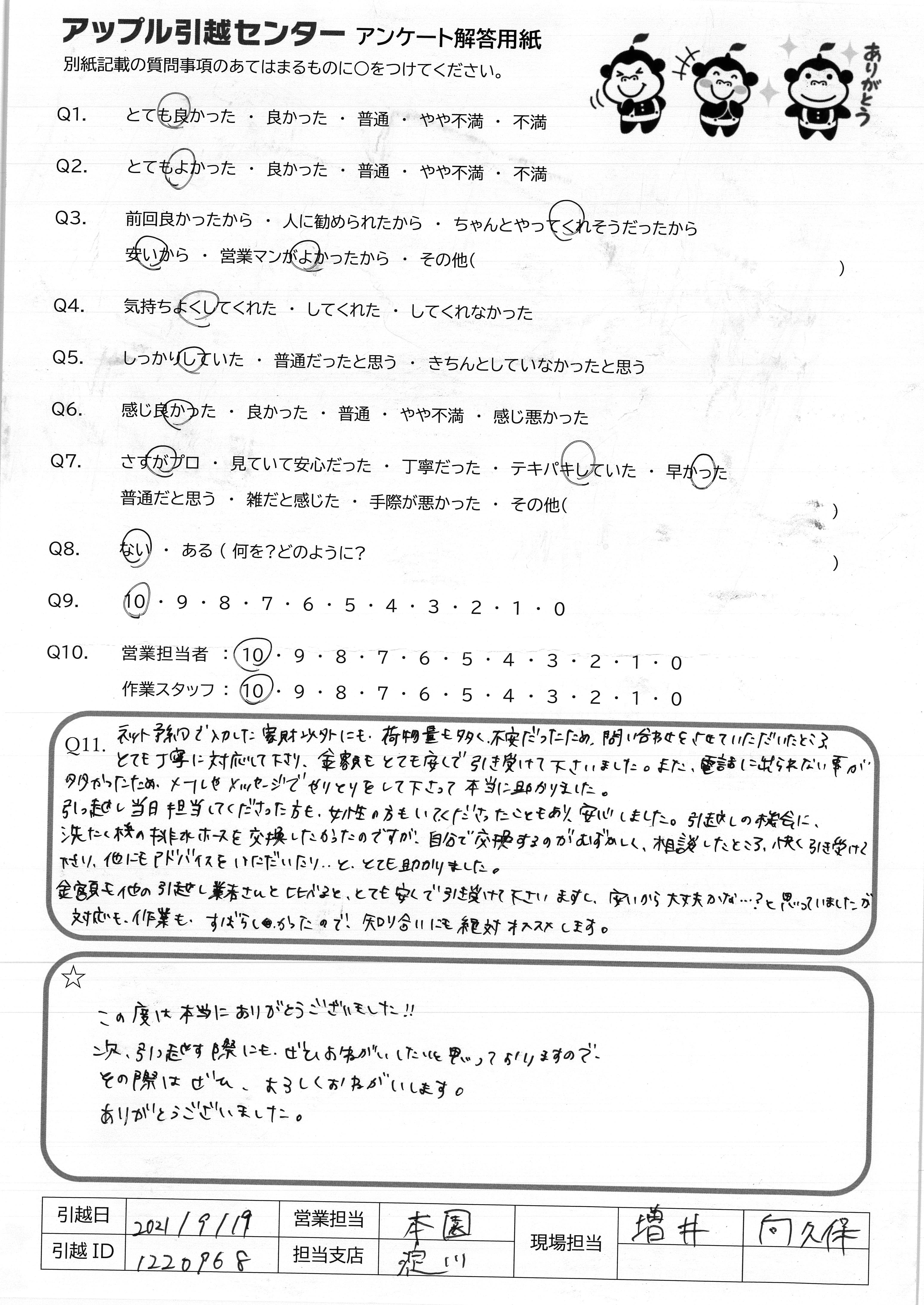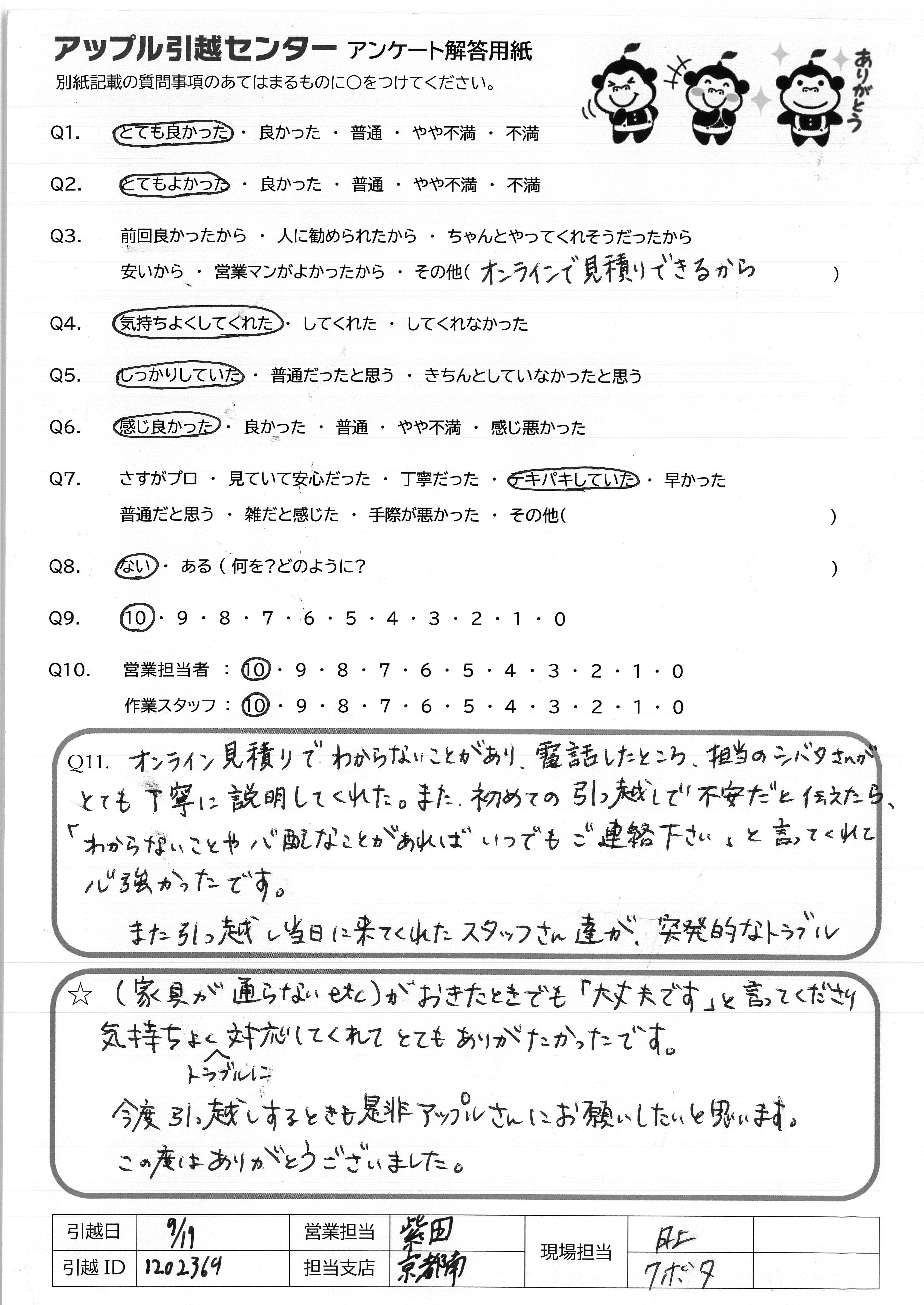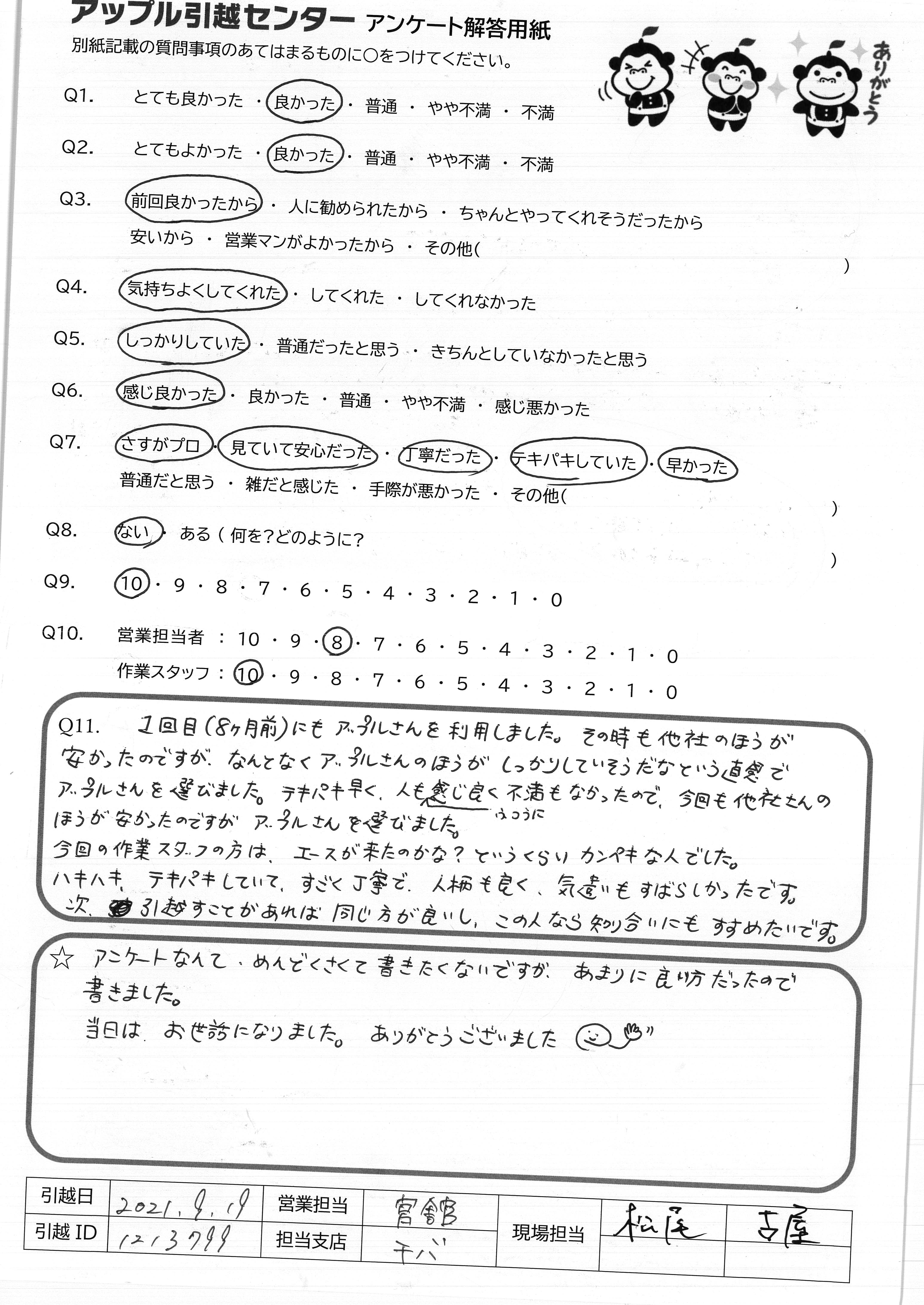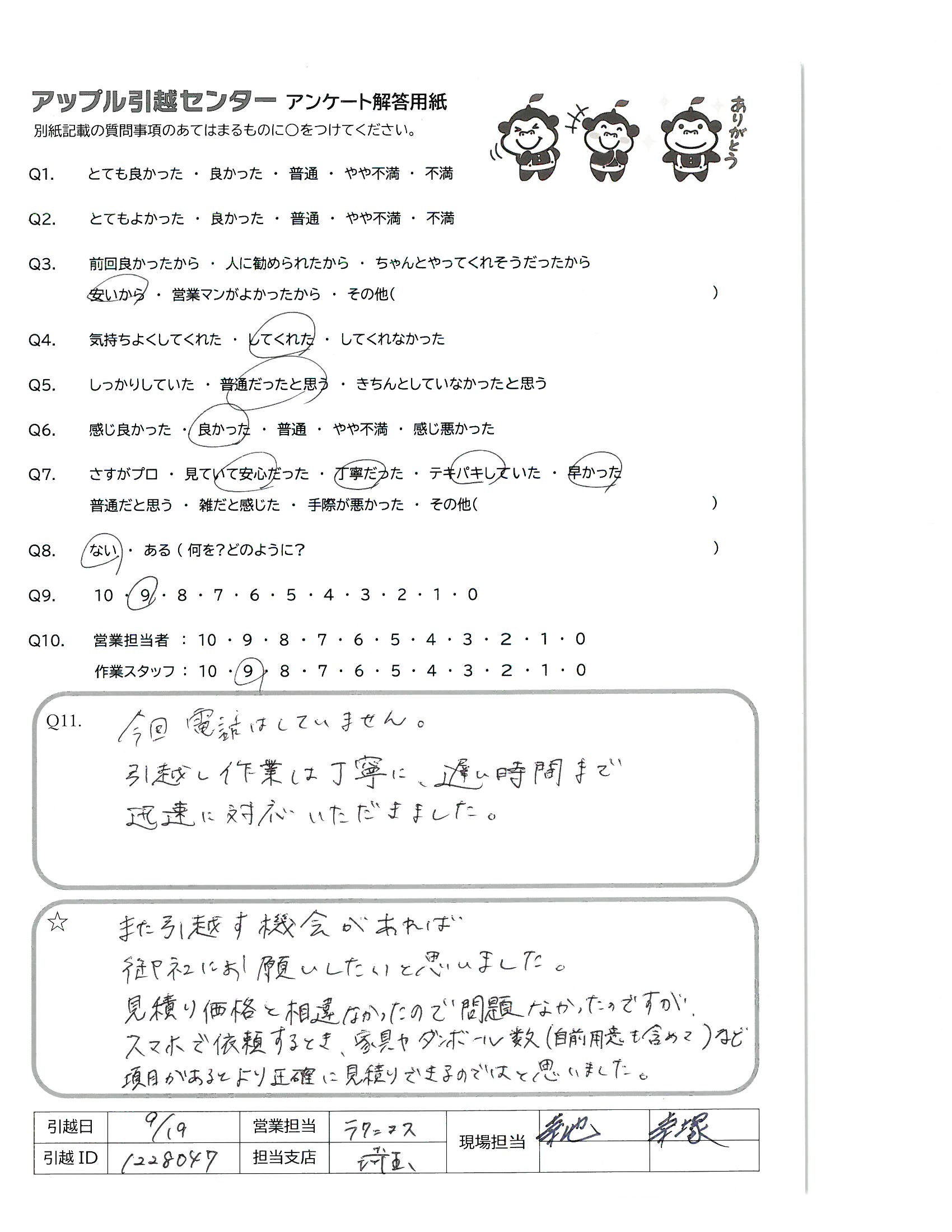 A.多くの会社で見積もりをして、アップル引越センターさんが格安だったので決めましたが、料金だけでなく、態度や仕事の丁寧さがとても良かったです。今後も利用させていただきたいと思いました。ありがとうございました。