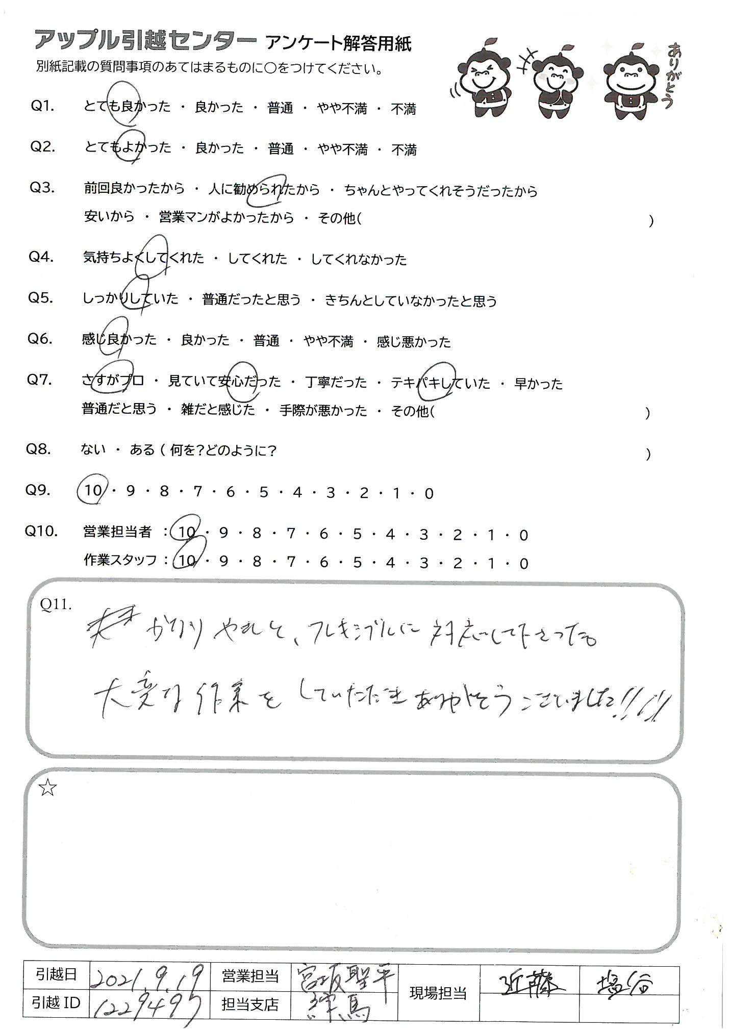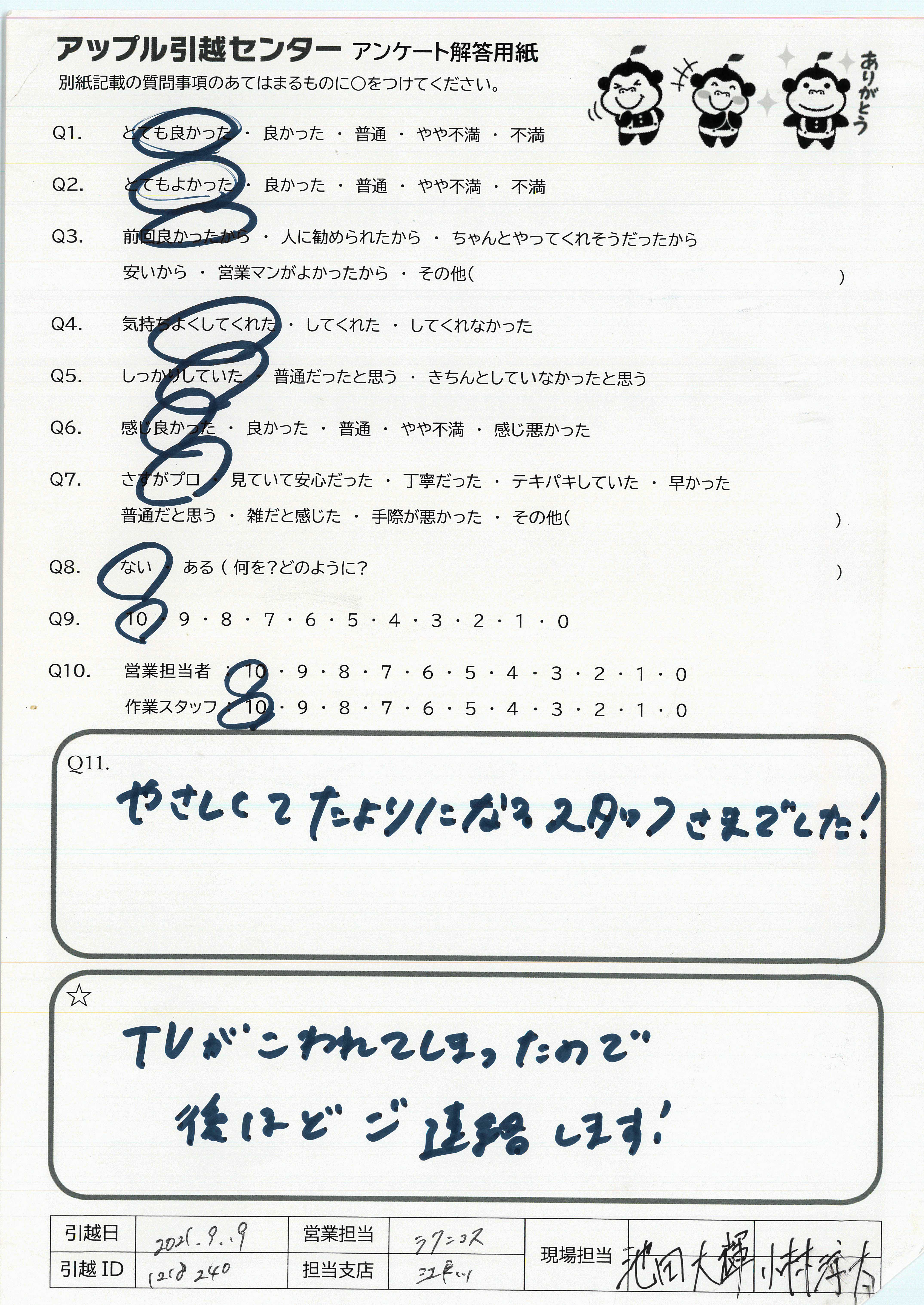 A.引っ越しのアップル の名前は聞き慣れず不安ありましたが、 本当にいい会社でした。 ありがとうございました✨ 後、アンケートで複数選択可 の箇所は、選択したくても選択することが出来ないので改善して頂きたいです。 キャラクターが可愛くてファンになりました(笑)