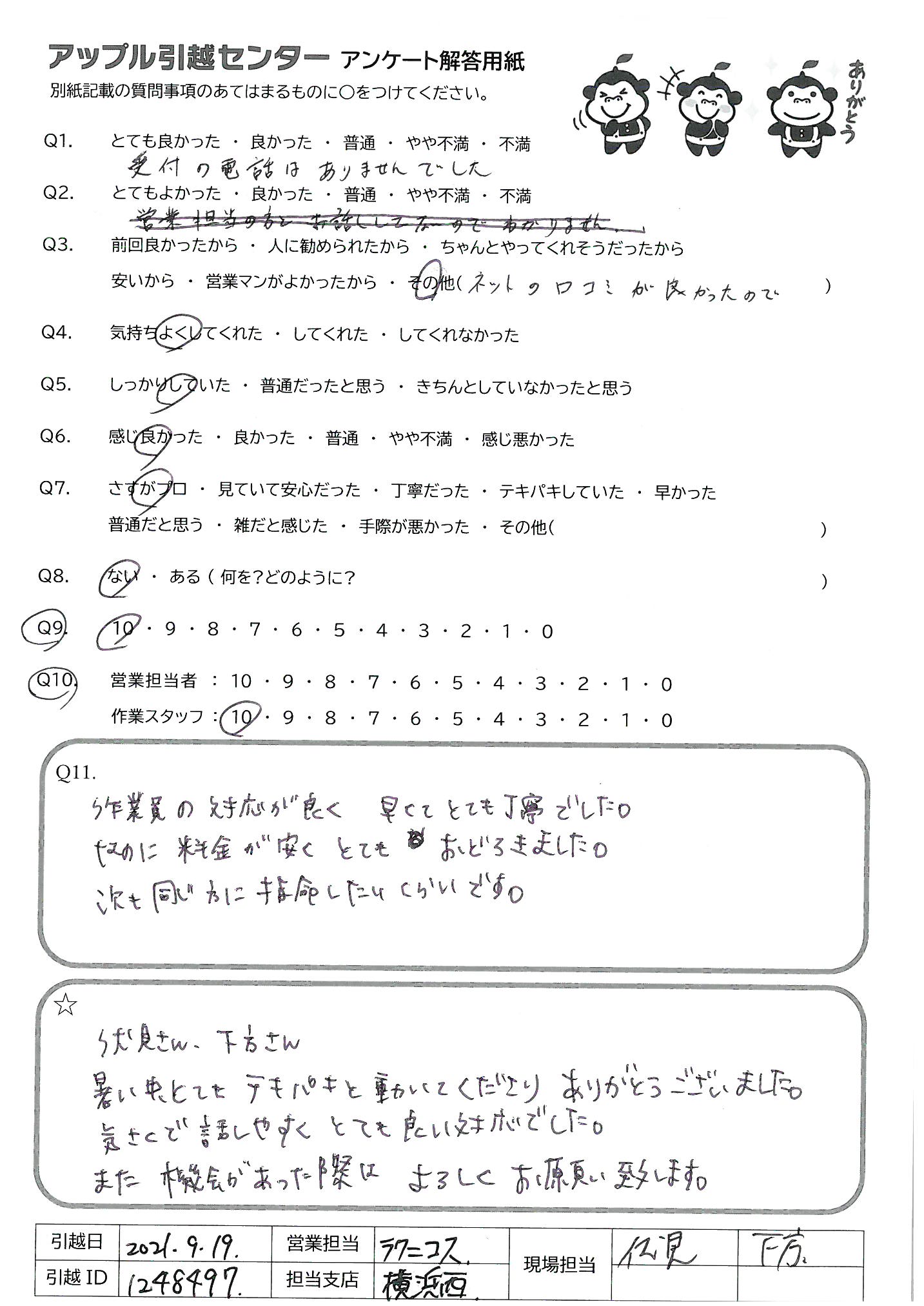 引越し日:2021年09月19日 エリア:神奈川県横浜市港北区