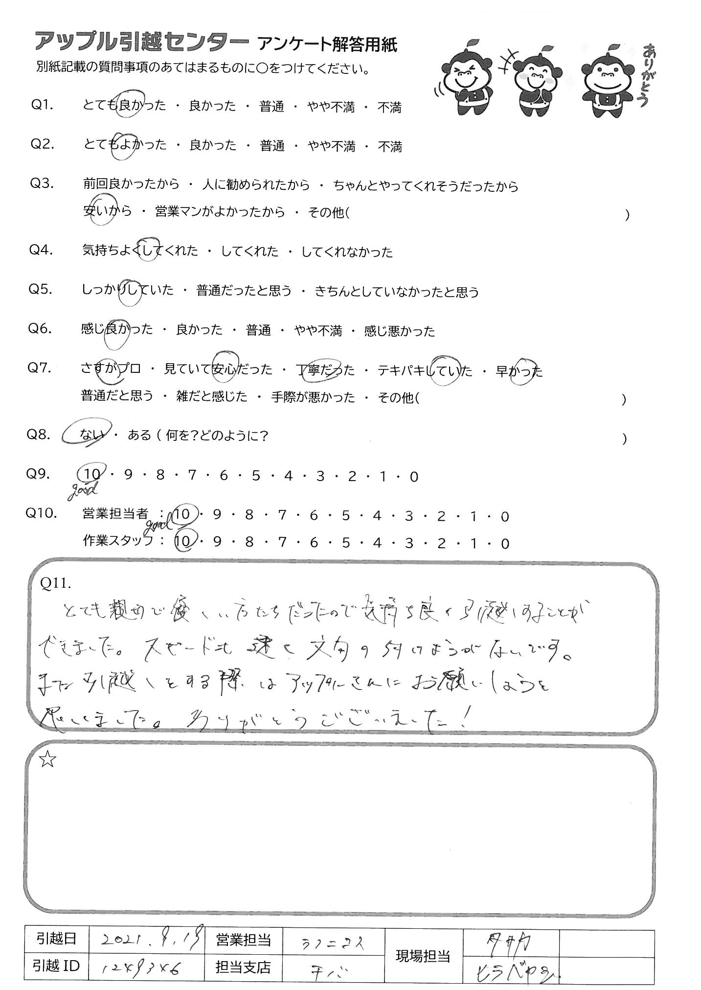 A.とても親切で優しい方たちだったので気持ち良く引越しすることができました。スピードも速く文句の付けようがないです。 また引越しをする際はアップルさんにお願いしようと思いました。ありがとうございました!