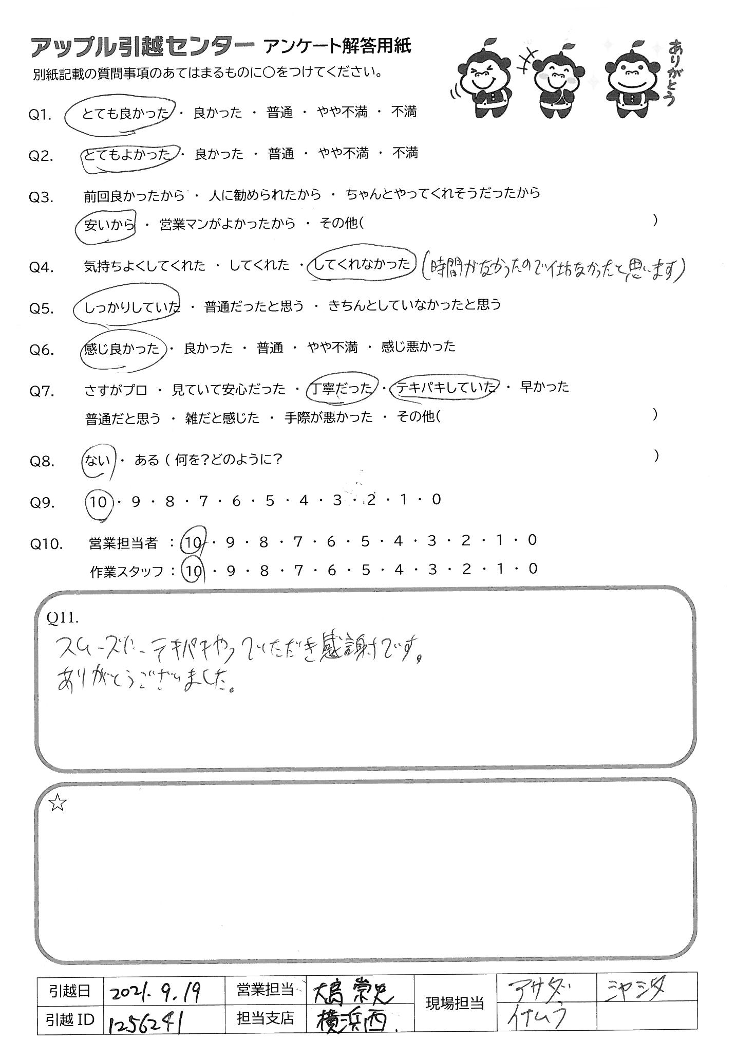 A.スムーズに、テキパキやっていただき感謝です。ありがとうございました。